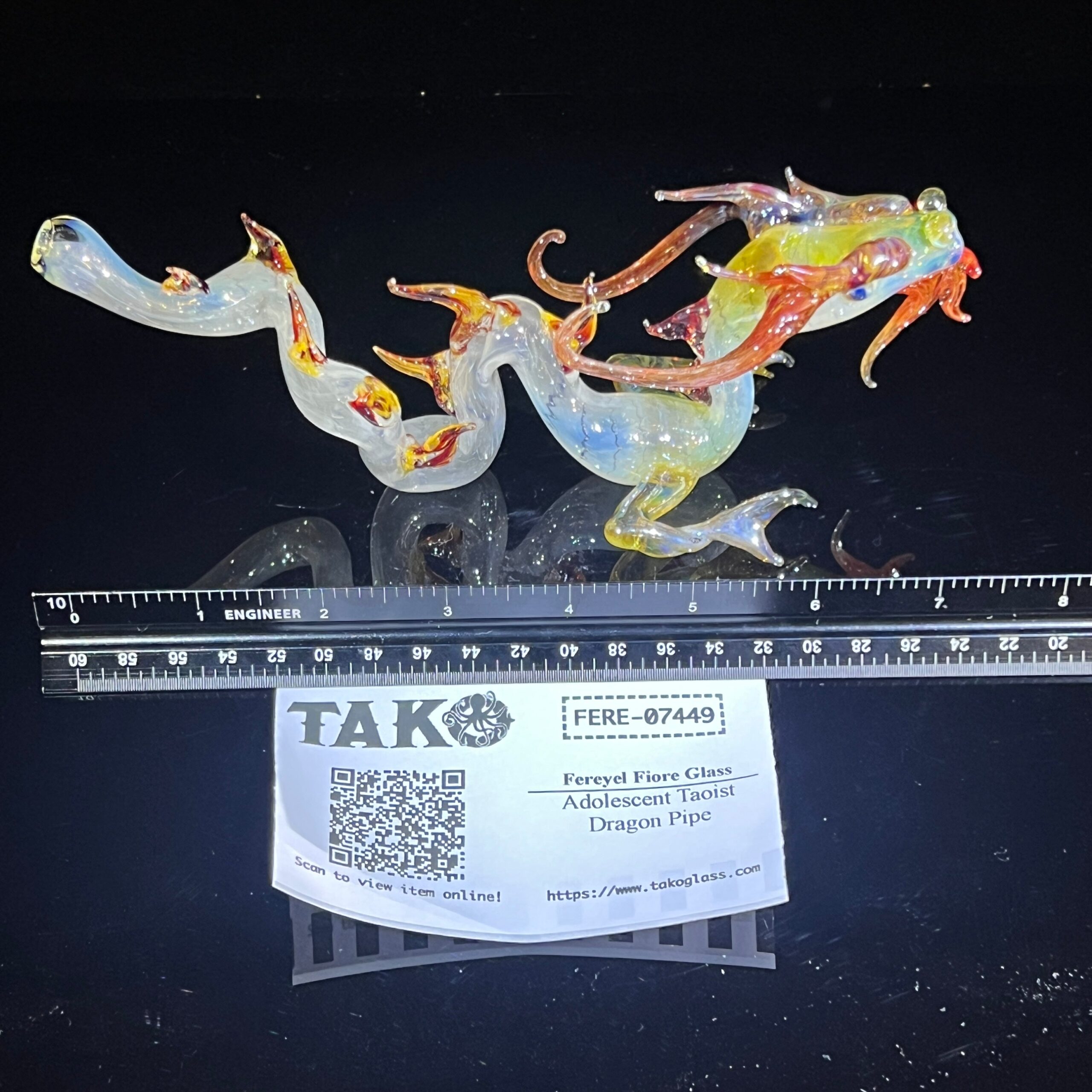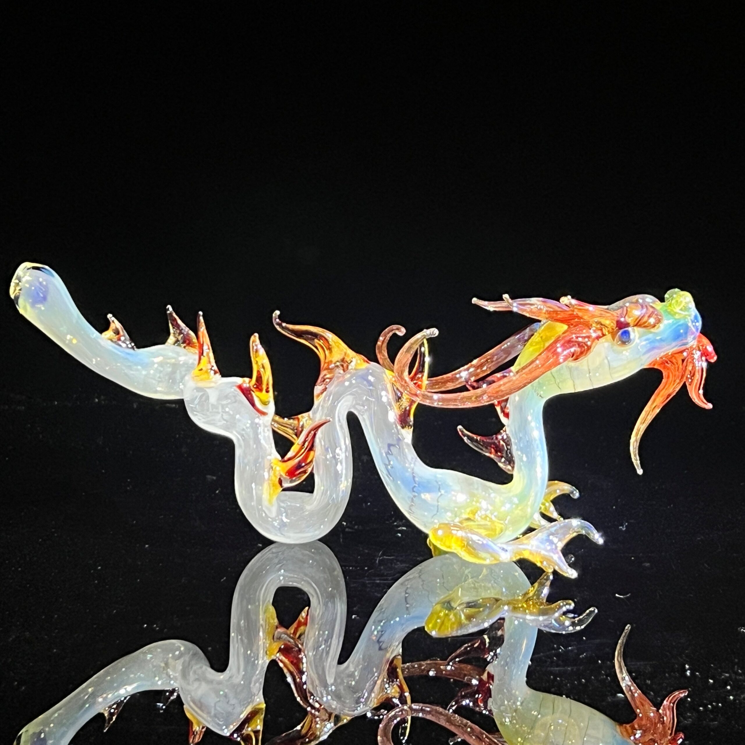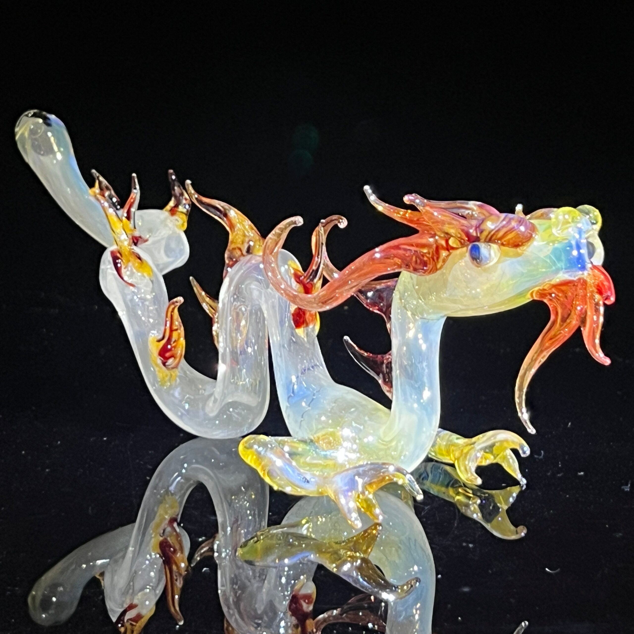 This isn’t just another vape; it’s a handcrafted work of art. Created by the visionary Fereyel Fiore Glass, each Adolescent Taoist Dragon Pipe is a unique masterpiece. The intricate detail is breathtaking: from the three delicately sculpted claws on its feet, to the horns that elegantly run down its back, to the mesmerizing, lifelike eyes, this pipe is a testament to the artist’s incredible skill and passion.