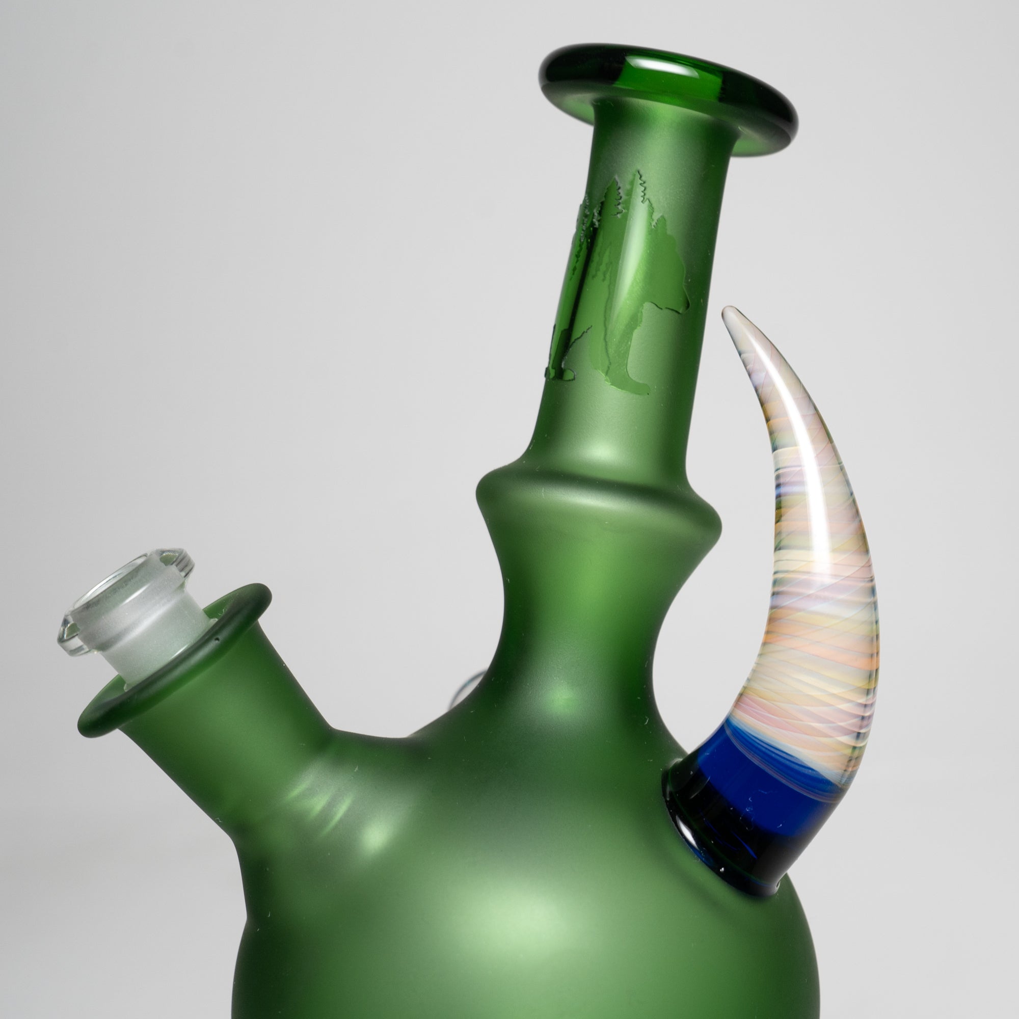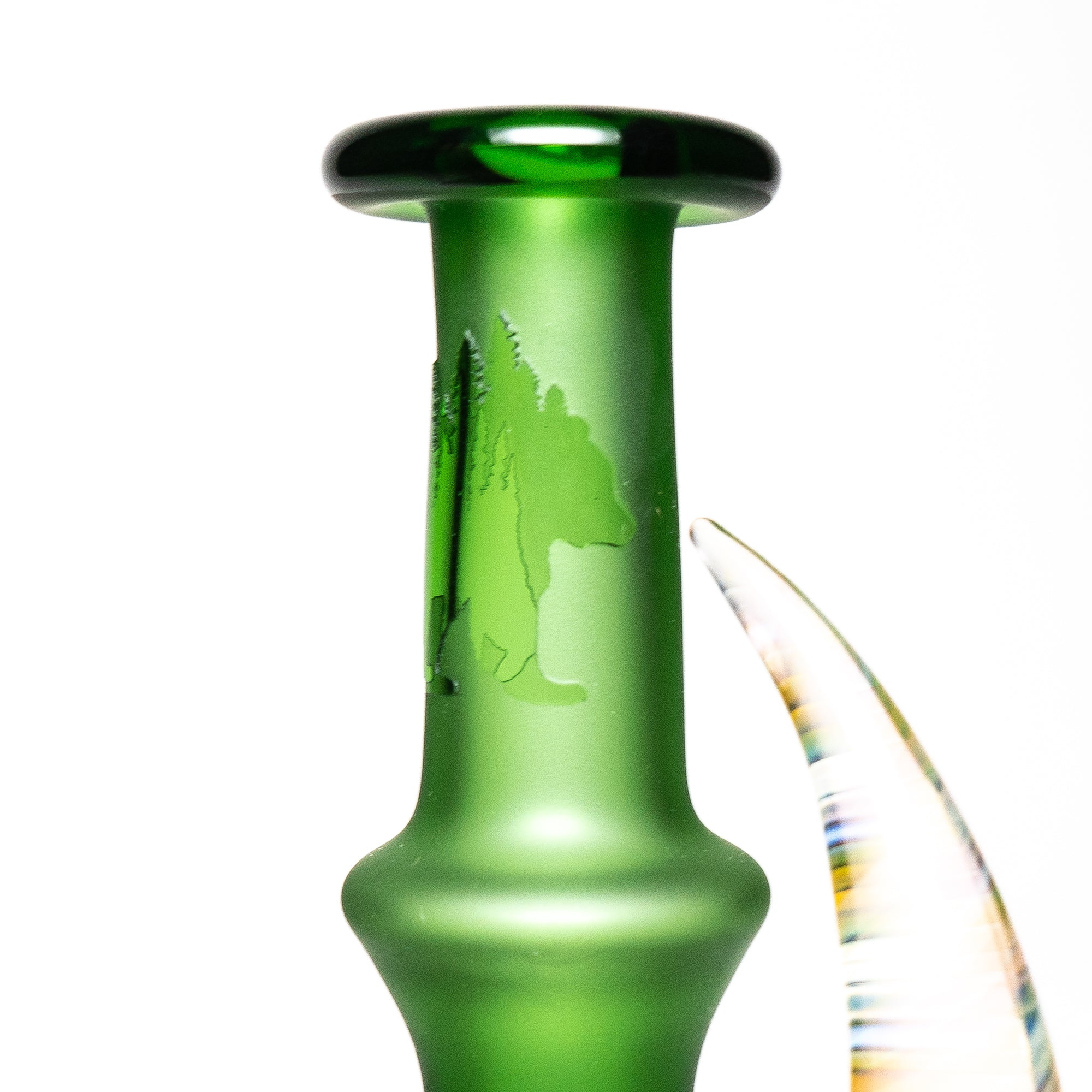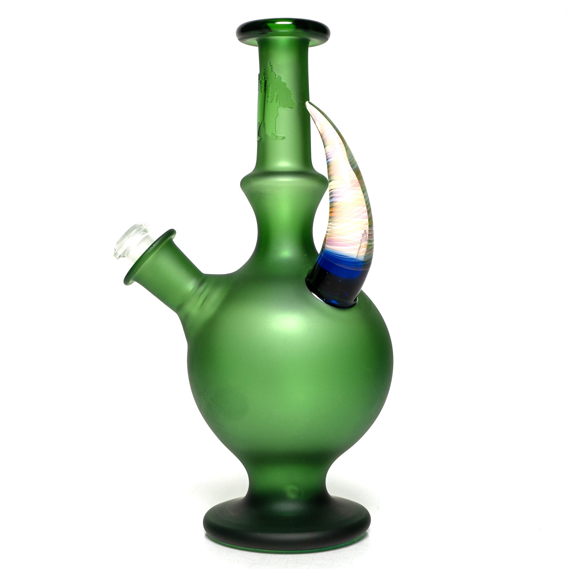 The Brando is crafted from high-quality borosilicate glass, known for its durability and heat resistance. The dimensions are approximately 8 inches in height and 3 inches in base width. Its vibrant green and cobalt color scheme, combined with the sandblasted finish, make it a truly eye-catching piece.