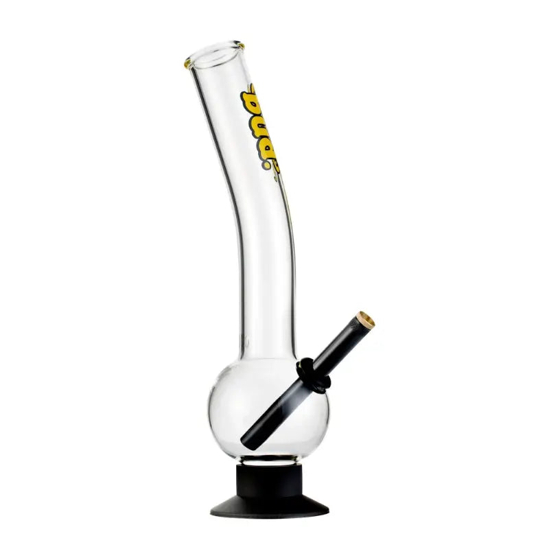 The Bud Bent Bubble Bong 36cm measures 36cm in height and is crafted from premium borosilicate glass. The unique design features a curved downtube, spherical water chamber, metal downstem, brass bonza cone piece, and a rubber base. The combination of these elements creates a visually striking and functional smoking device.