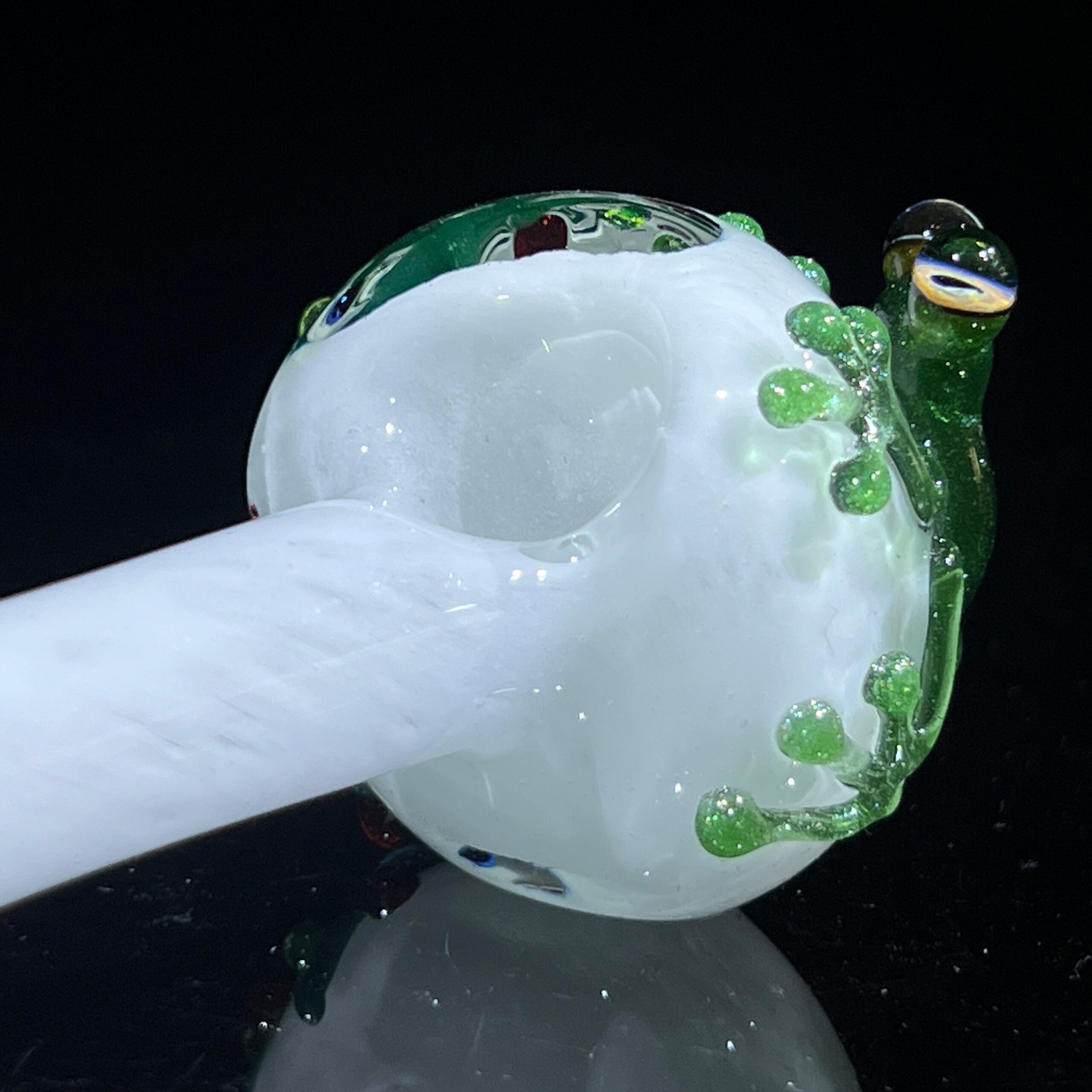 Design Specifics: Beezy-style frog design, miniature Christmas lights embedded in the glass.