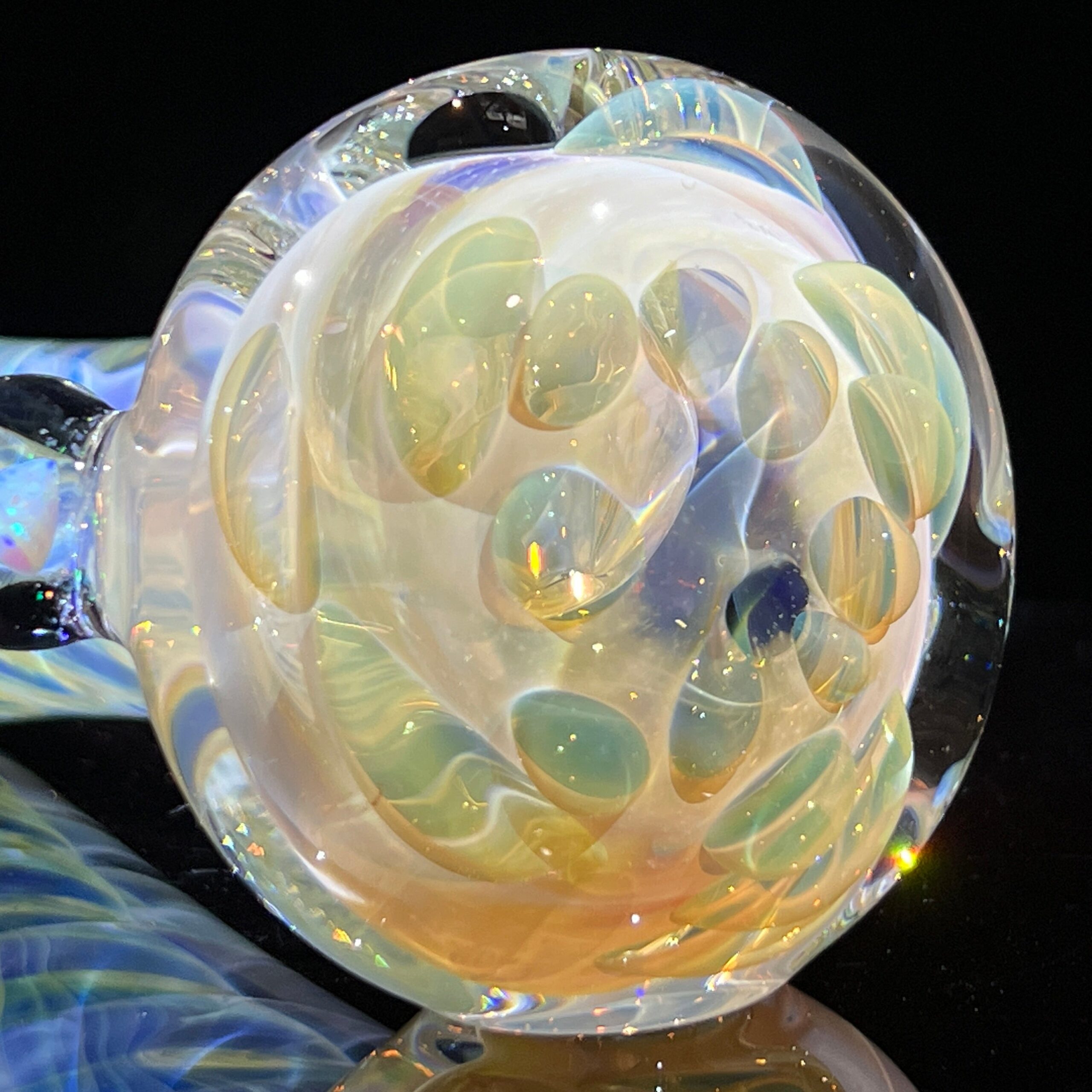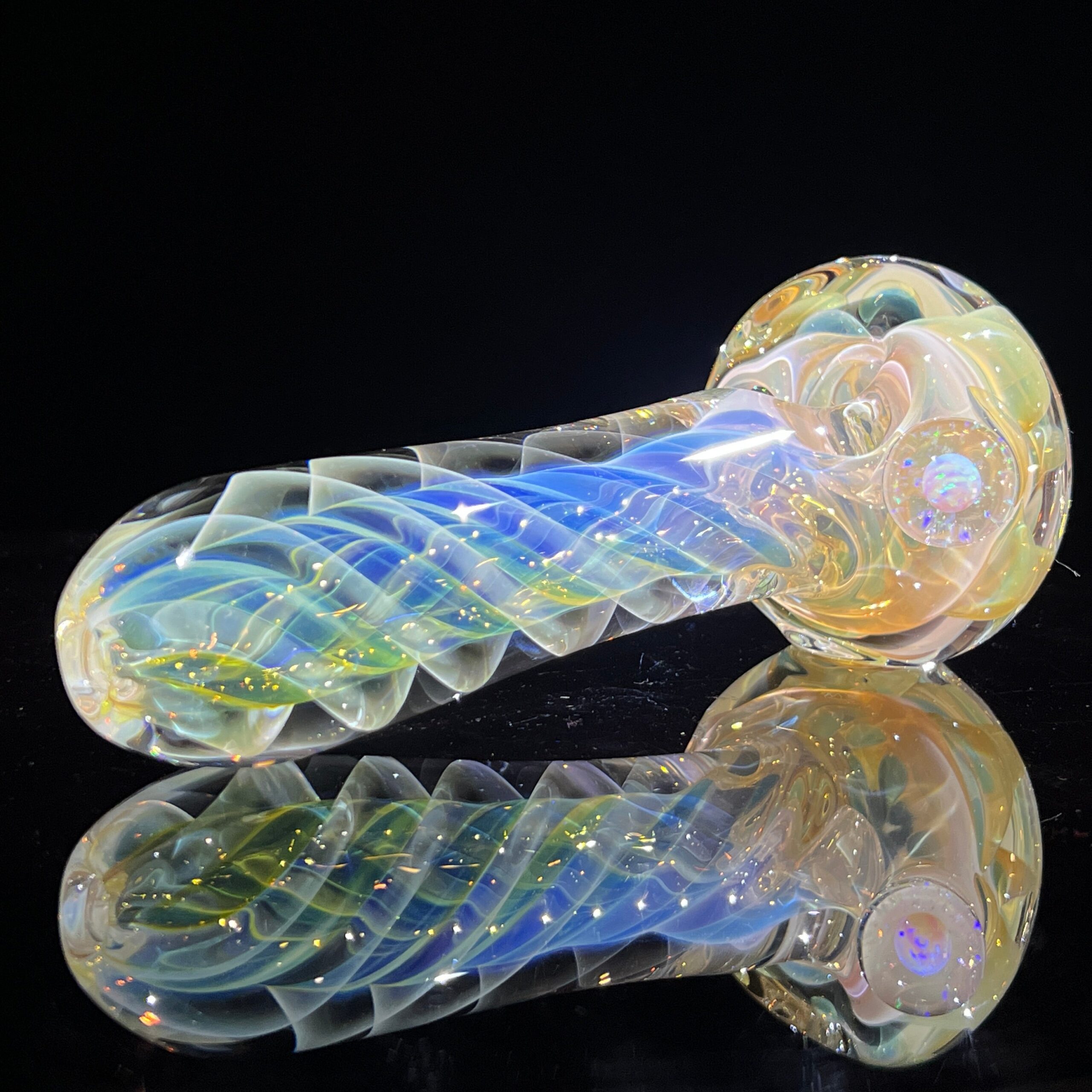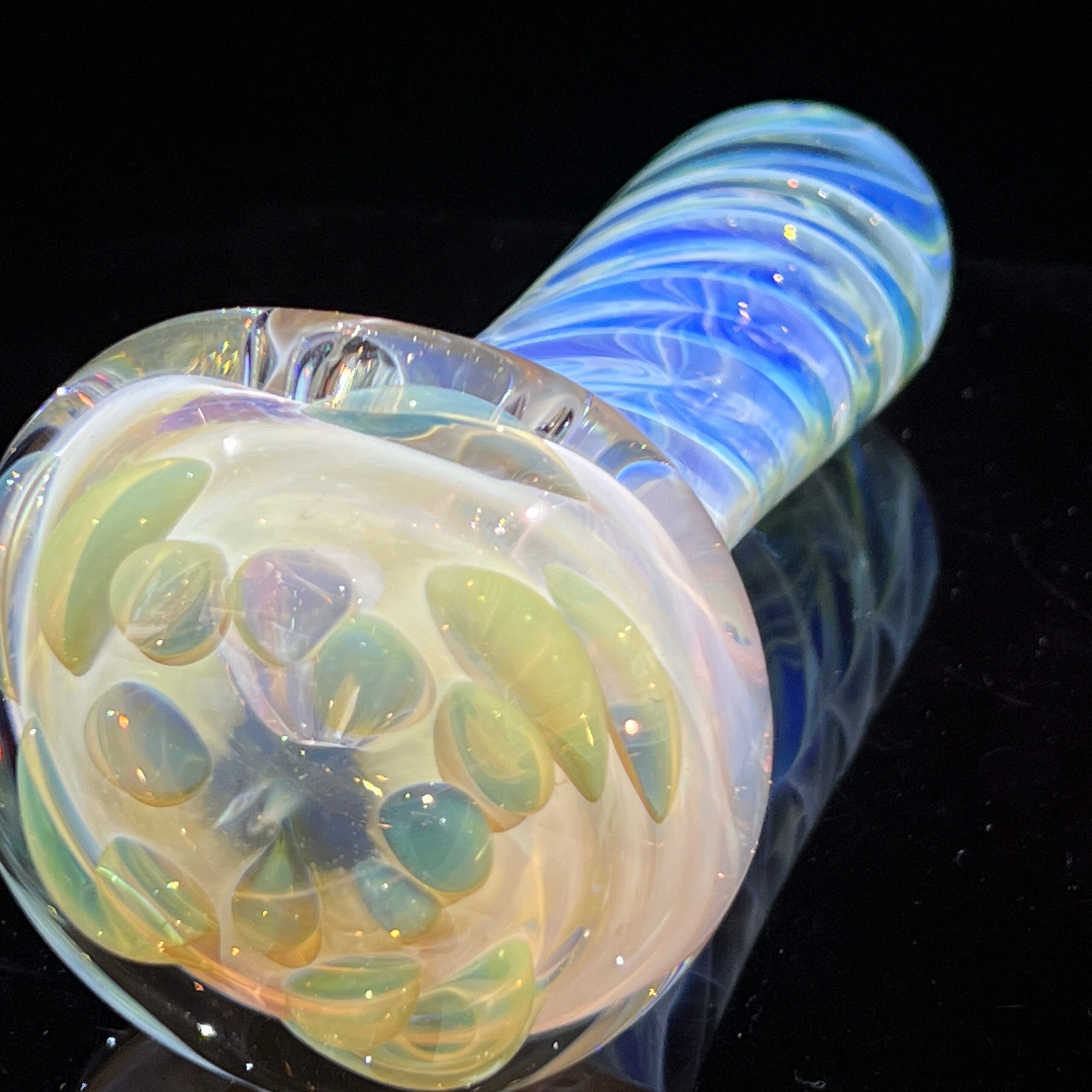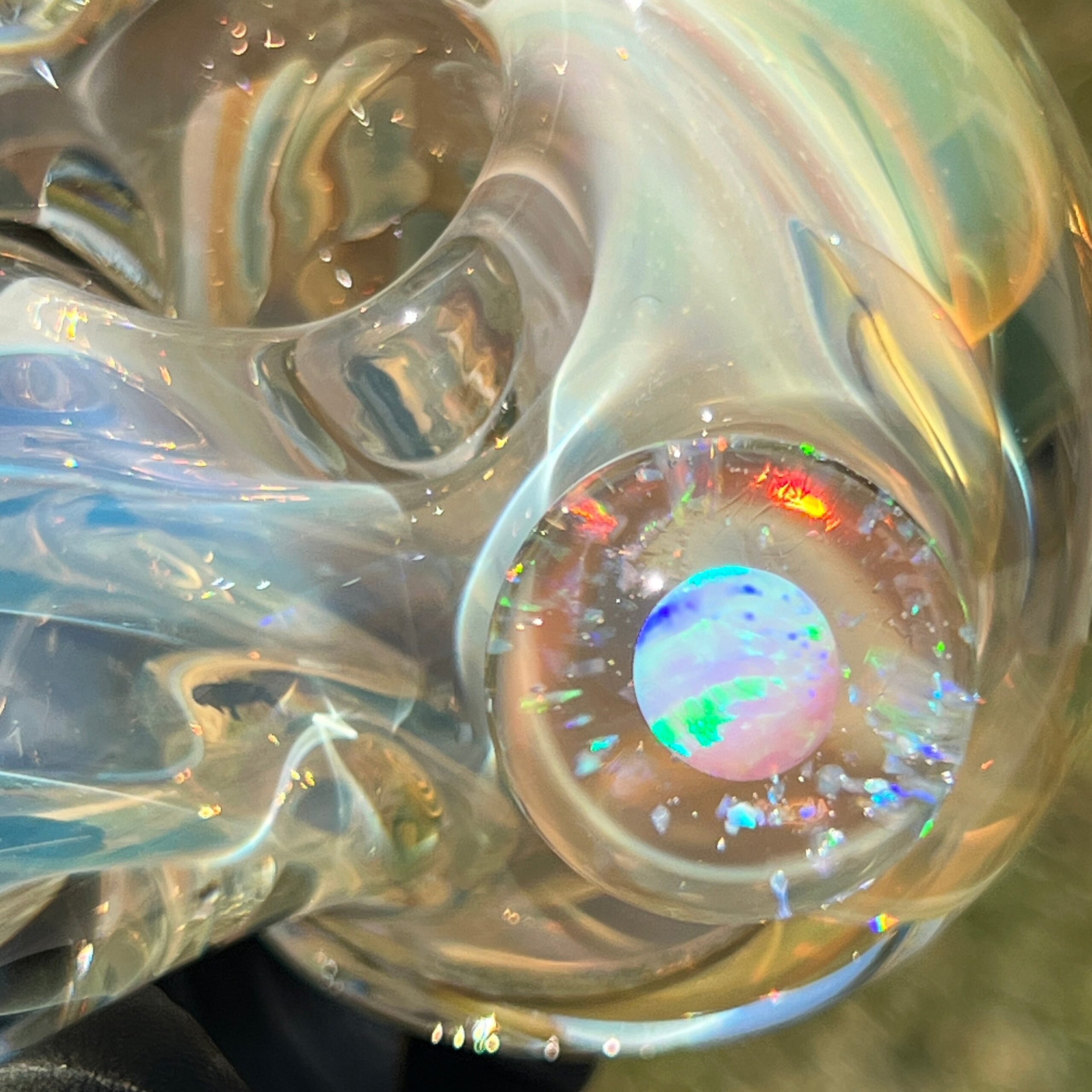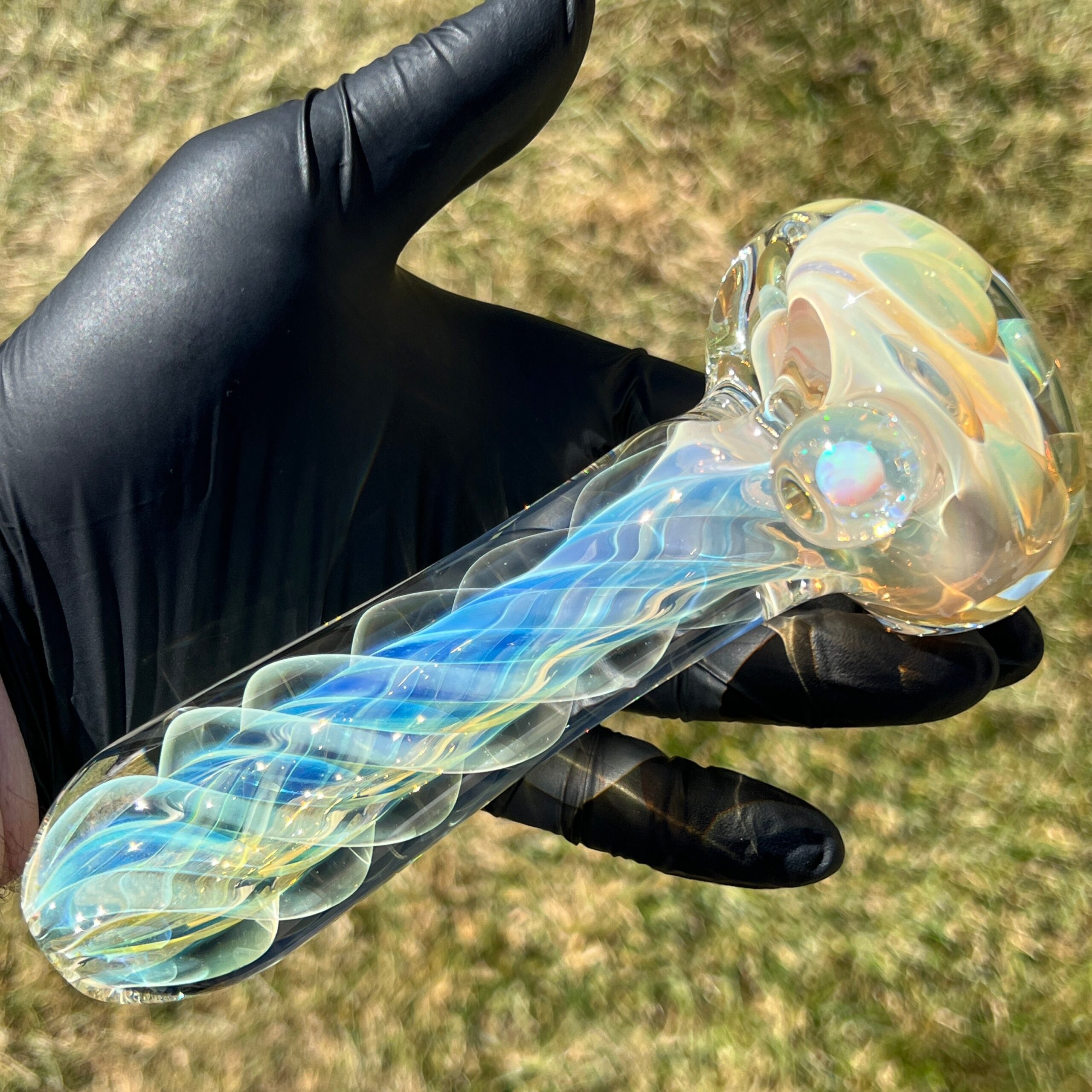 - Magnifying Marble with Encased Opal: A shimmering white opal and crushed opal, encased within a magnifying marble, creates a breathtaking visual spectacle. The marble acts as a lens, intensifying the opal’s captivating rainbow hues with every shift in light. This unique design element elevates the pipe beyond mere functionality into a work of art.