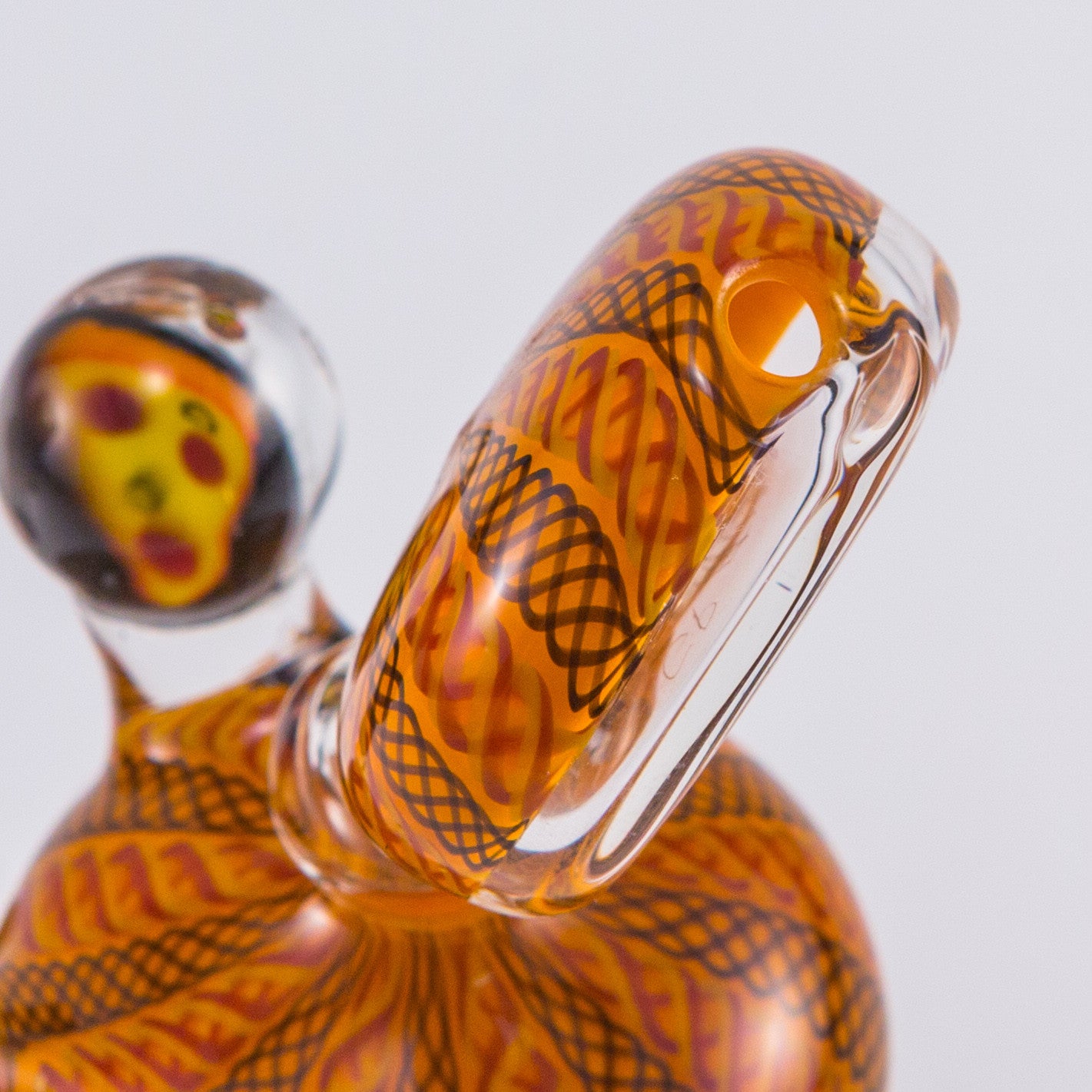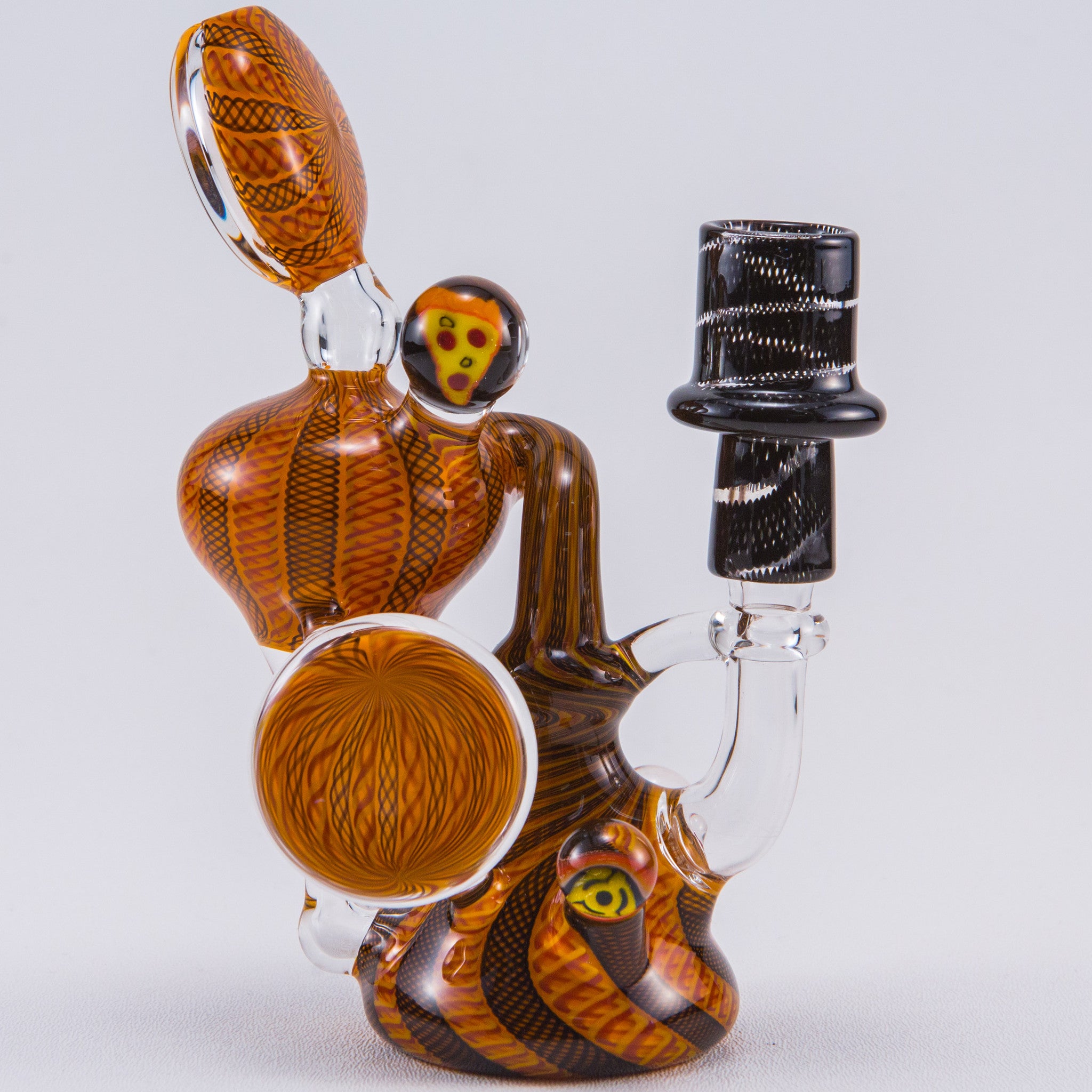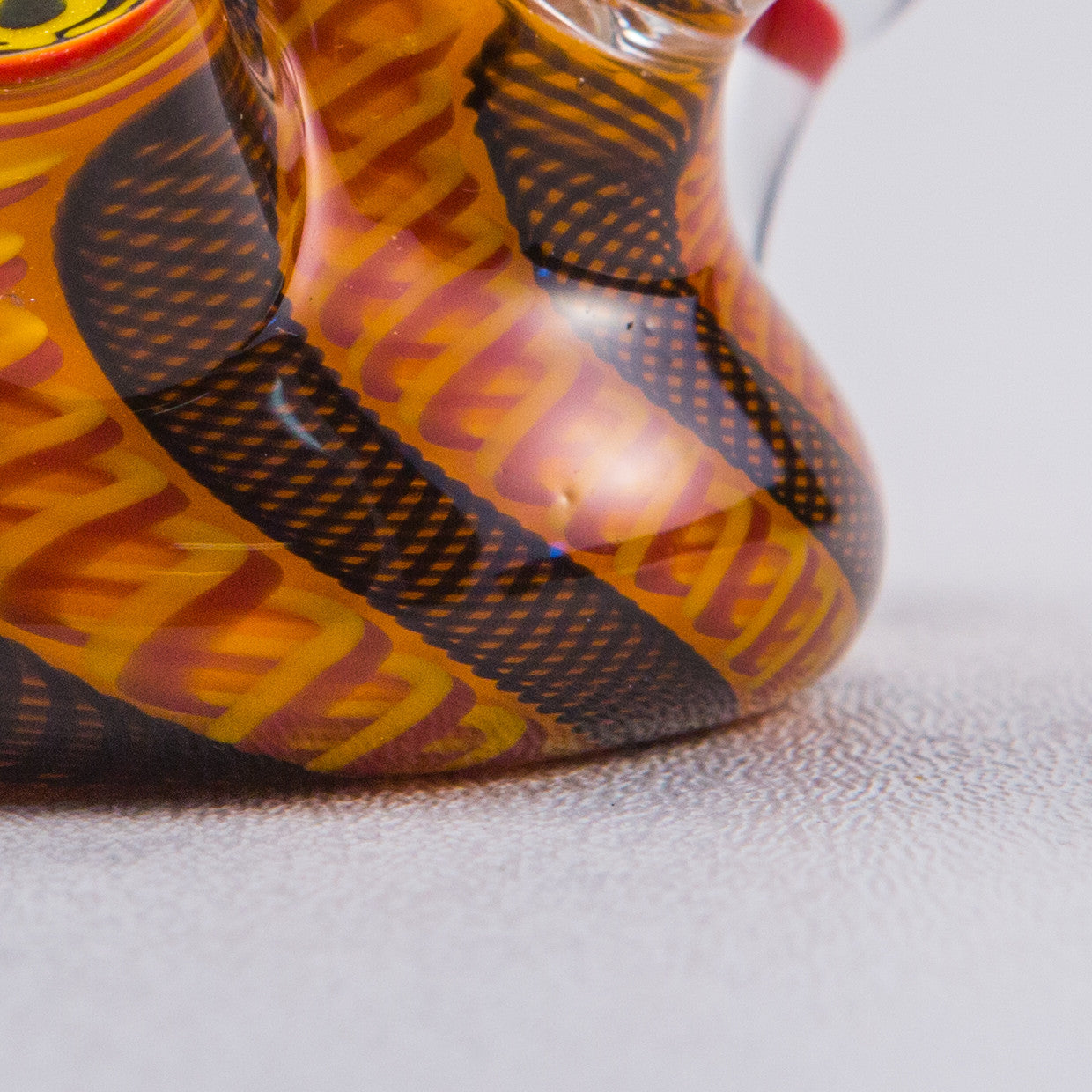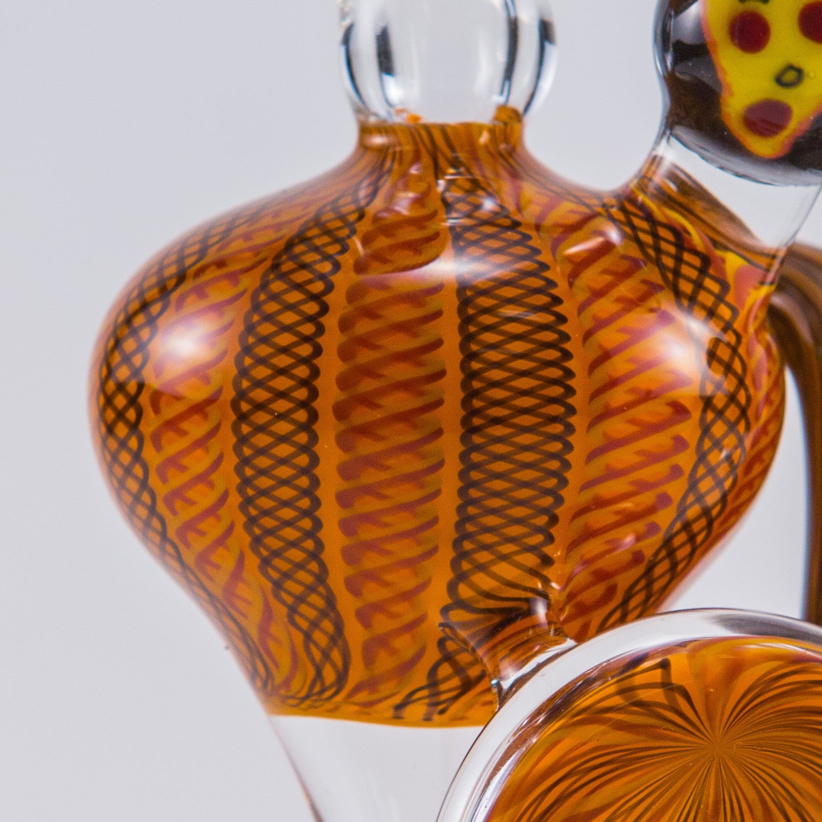 The Erik Anders X Harold Cooney x Recycler – Flight is meticulously crafted from high-quality borosilicate glass, known for its durability and resistance to heat. Dimensions are approximately 6.5″ in height and 2.5″ at the foot. The intricate latticino and Murrini encasements showcase the artisans’ skill.