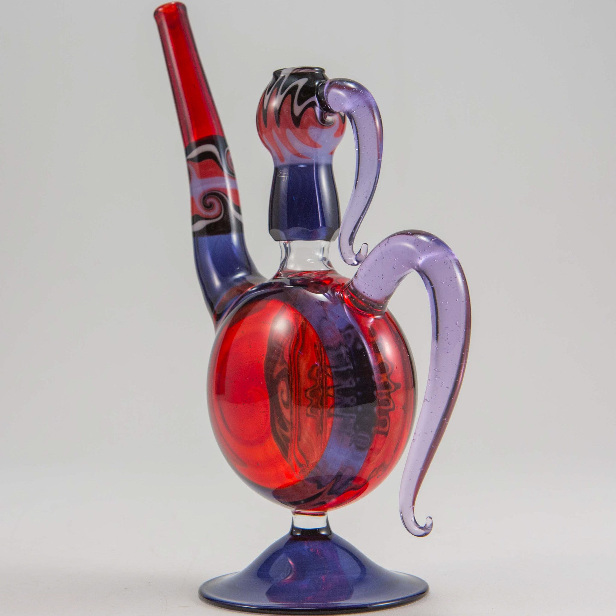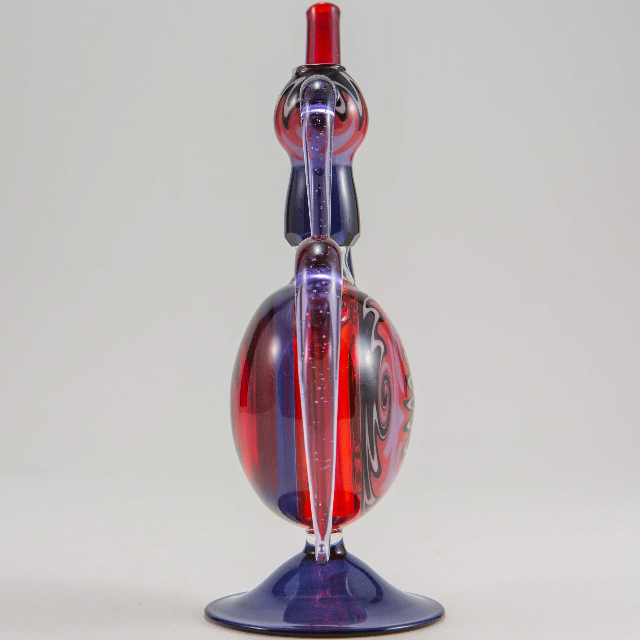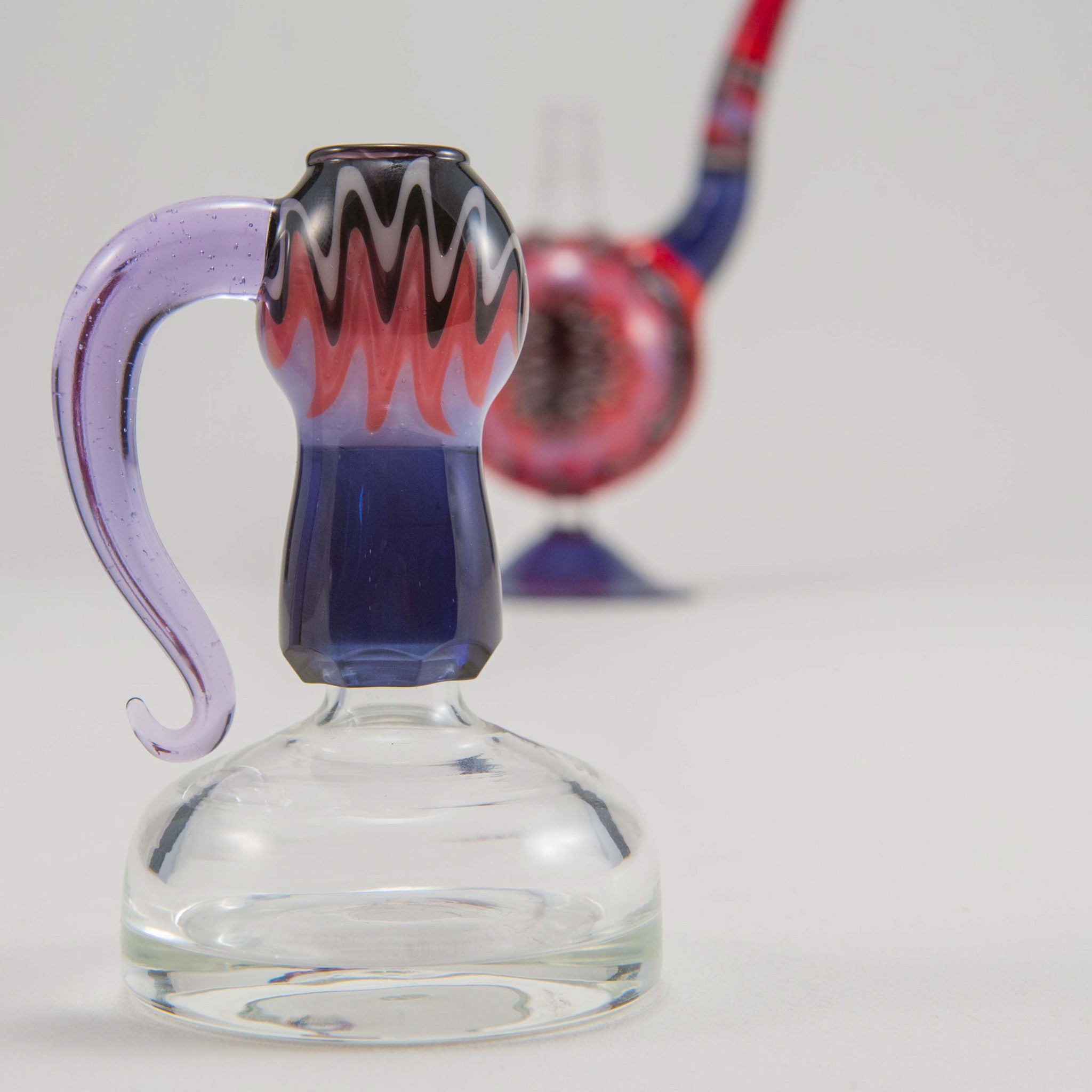 Design: Intricate hand-formed glass design with a vibrant black, purple, red and pink color scheme.
