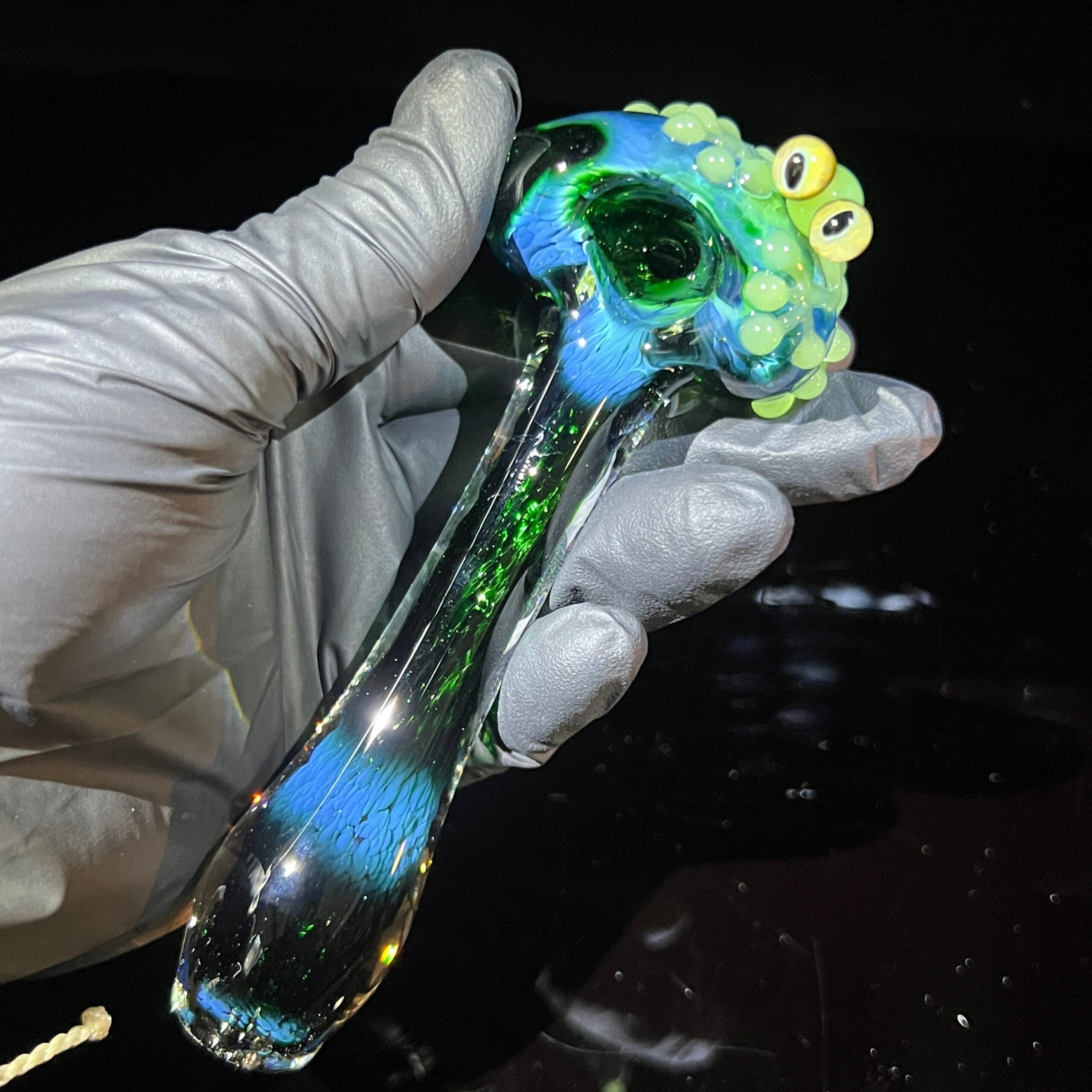 Design: Classic Beezy-style frog design, vibrant green and blue frit glass.