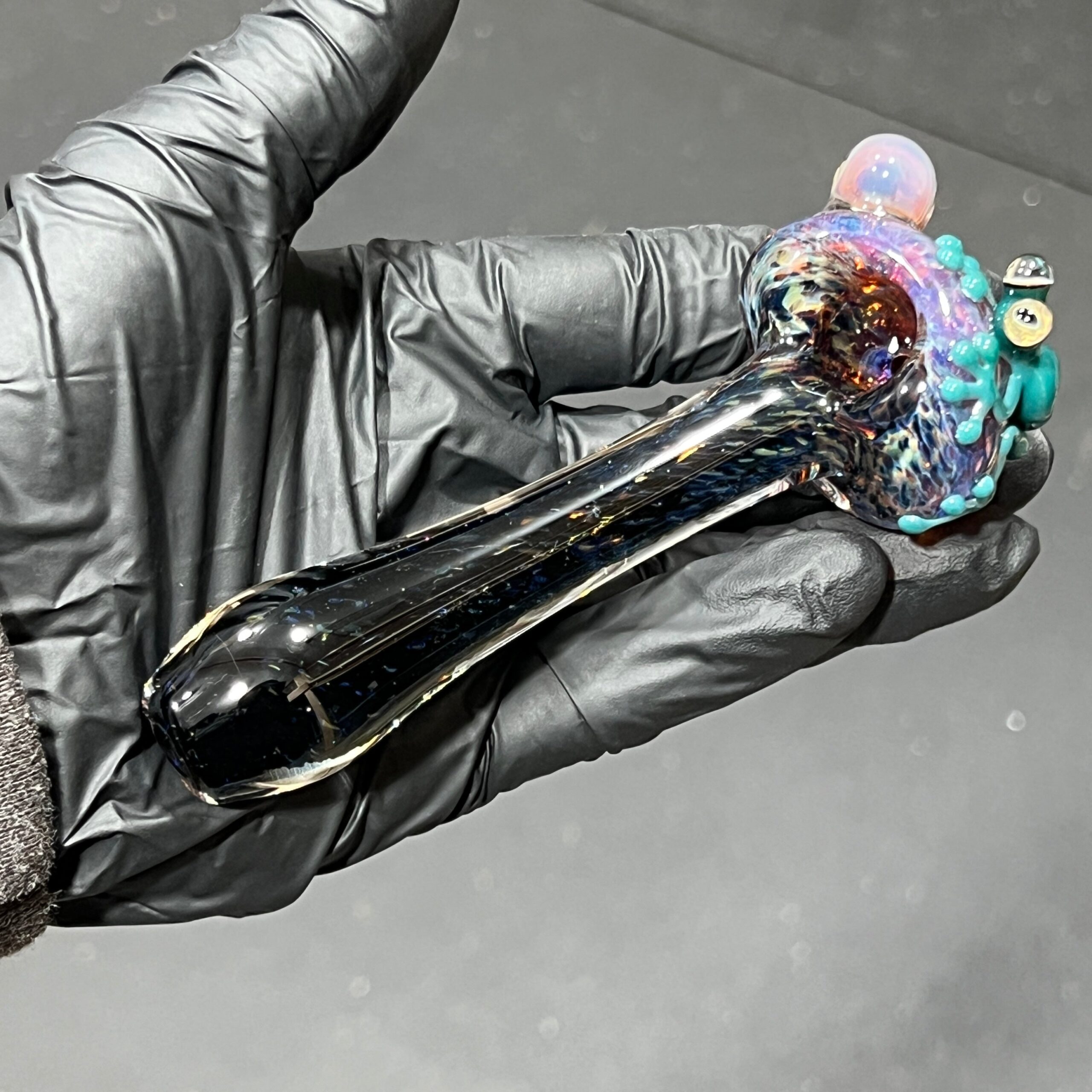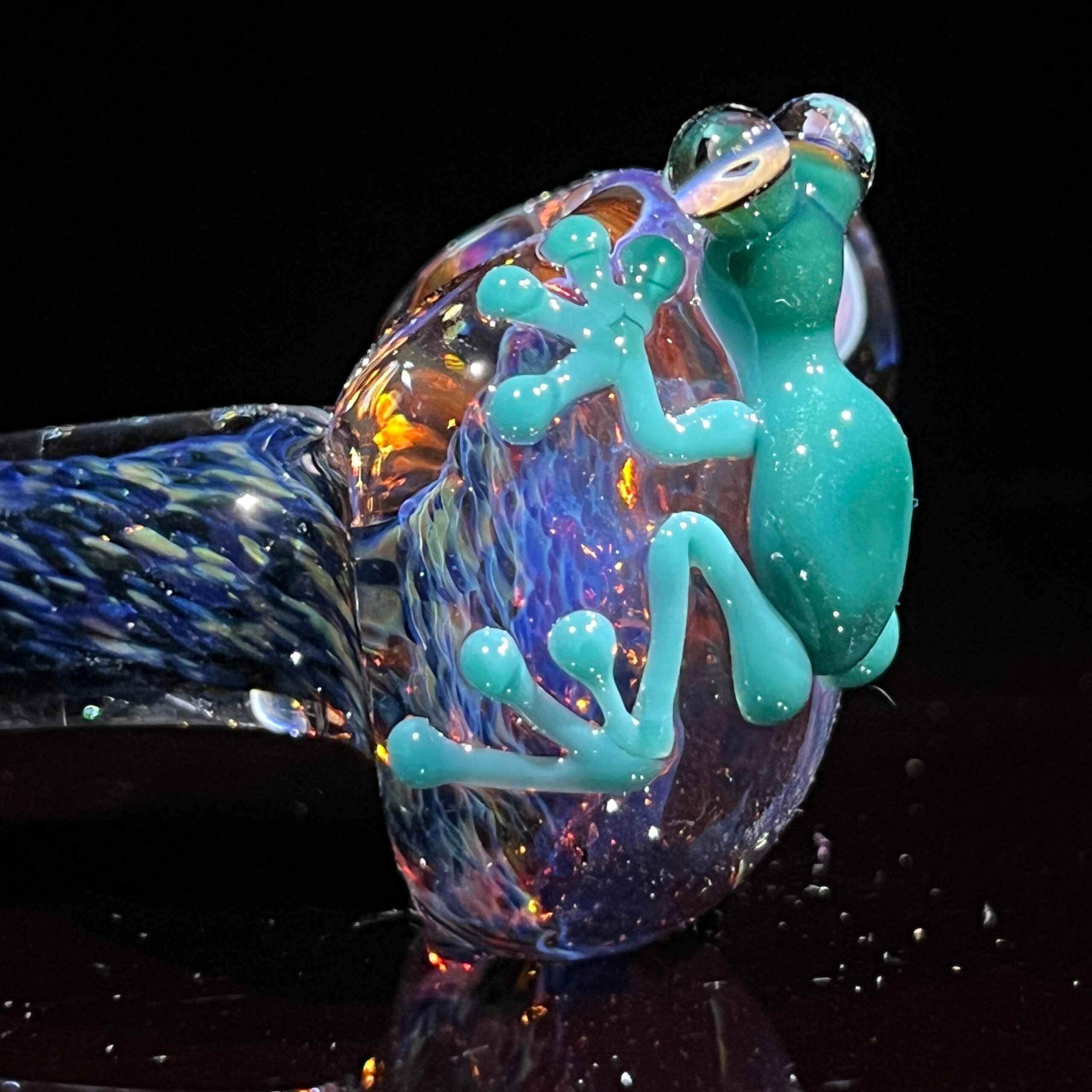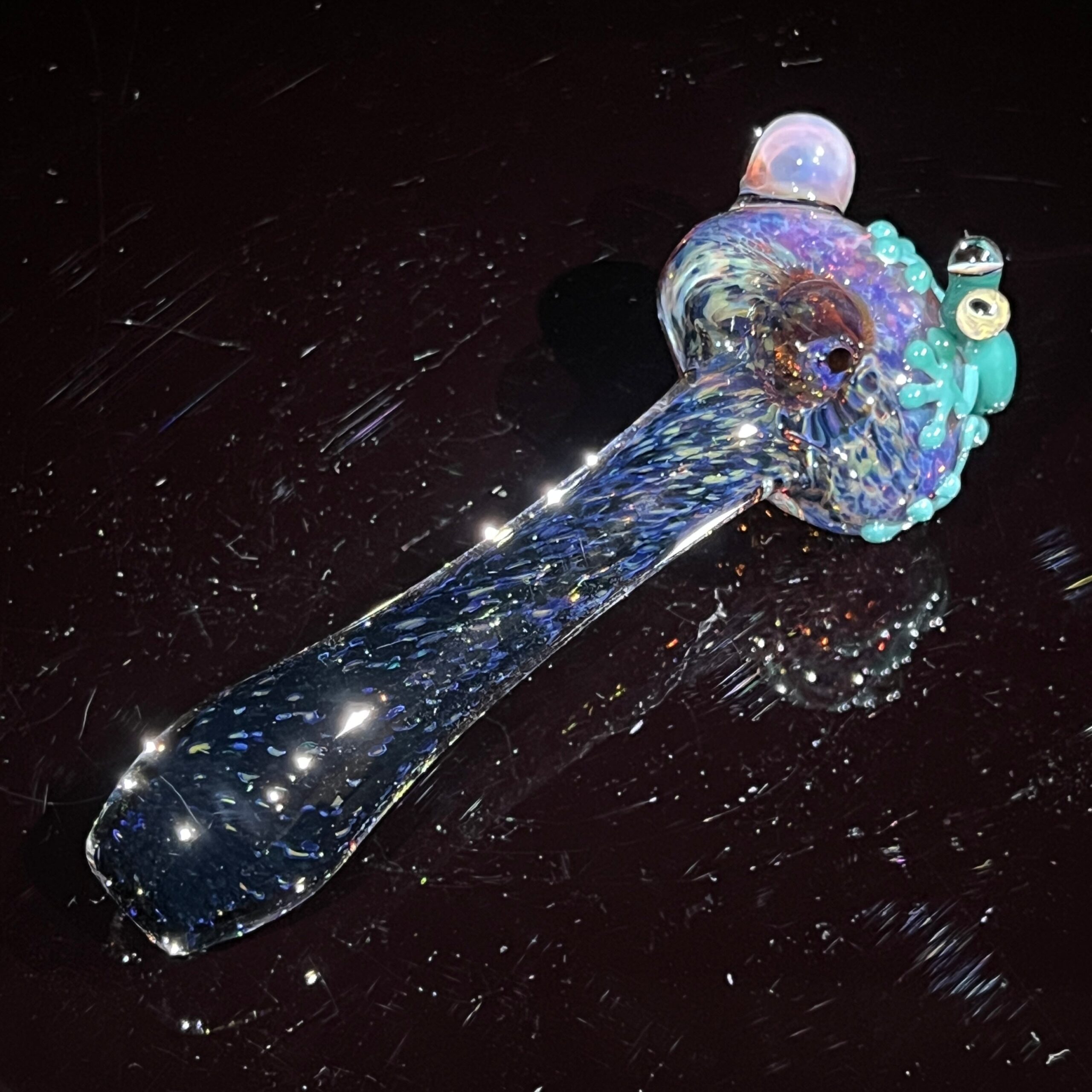 - Captivating Design: A whimsical, hand-blown borosilicate glass spoon featuring a charming green frog perched atop a magic mushroom. This eye-catching design makes a statement wherever you go, while the frog’s relaxed posture adds a touch of quirky fun.