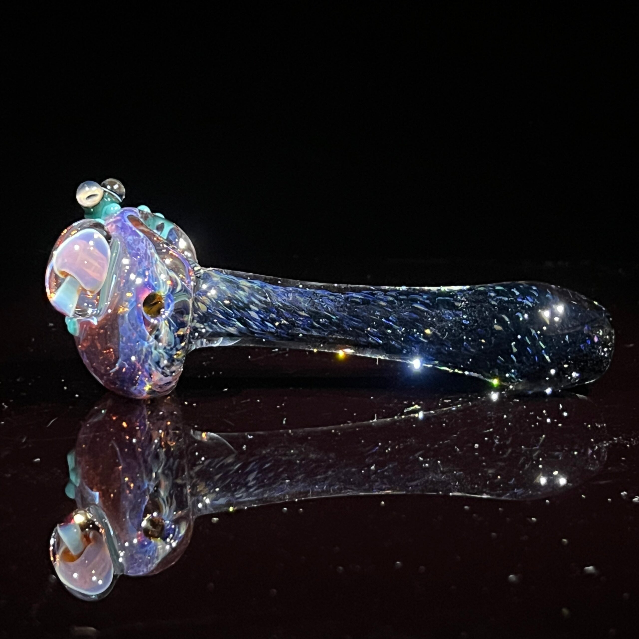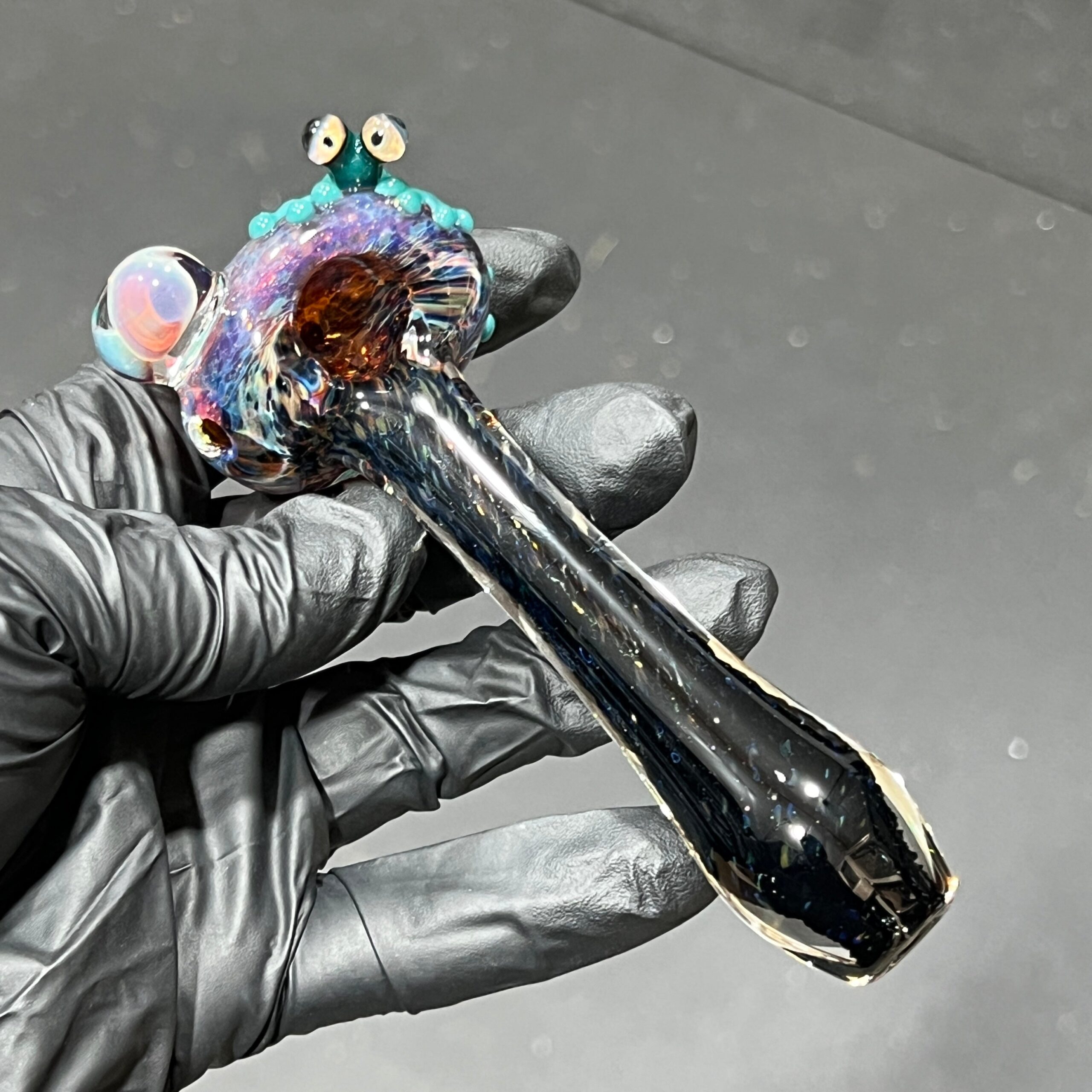 Design: Hand-blown, unique design featuring a green frog and magic mushroom.