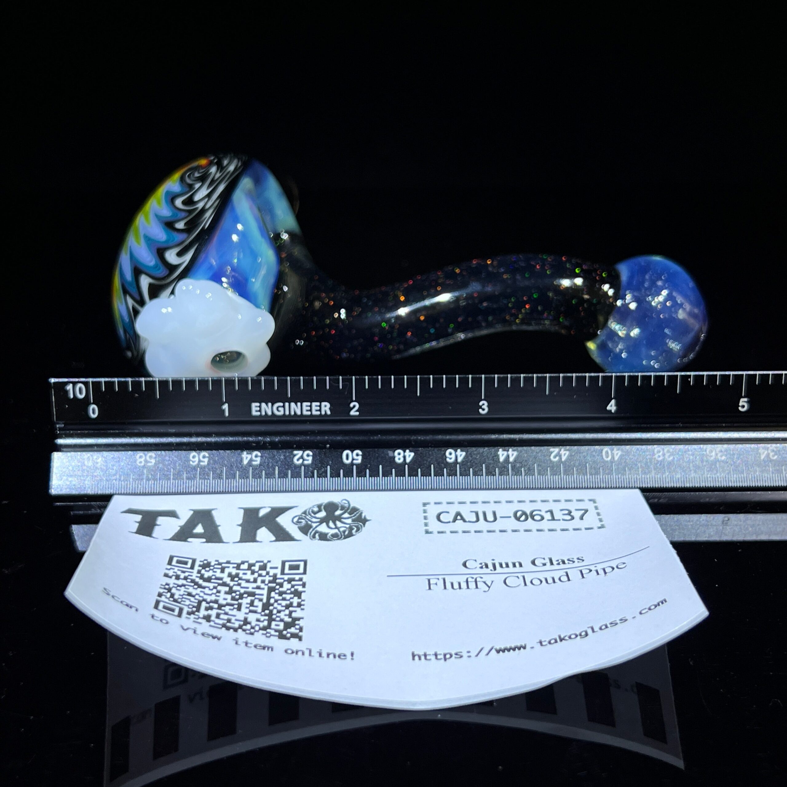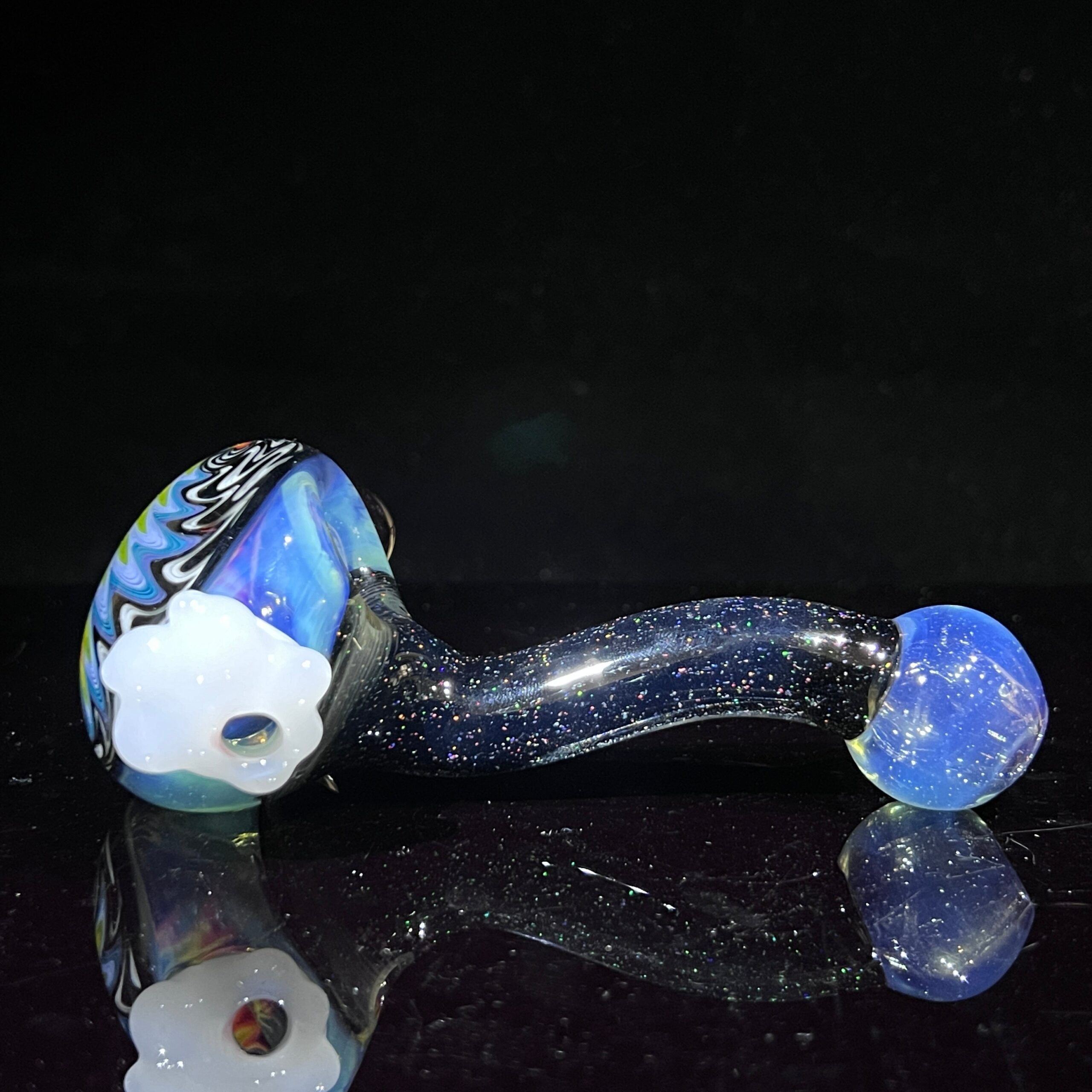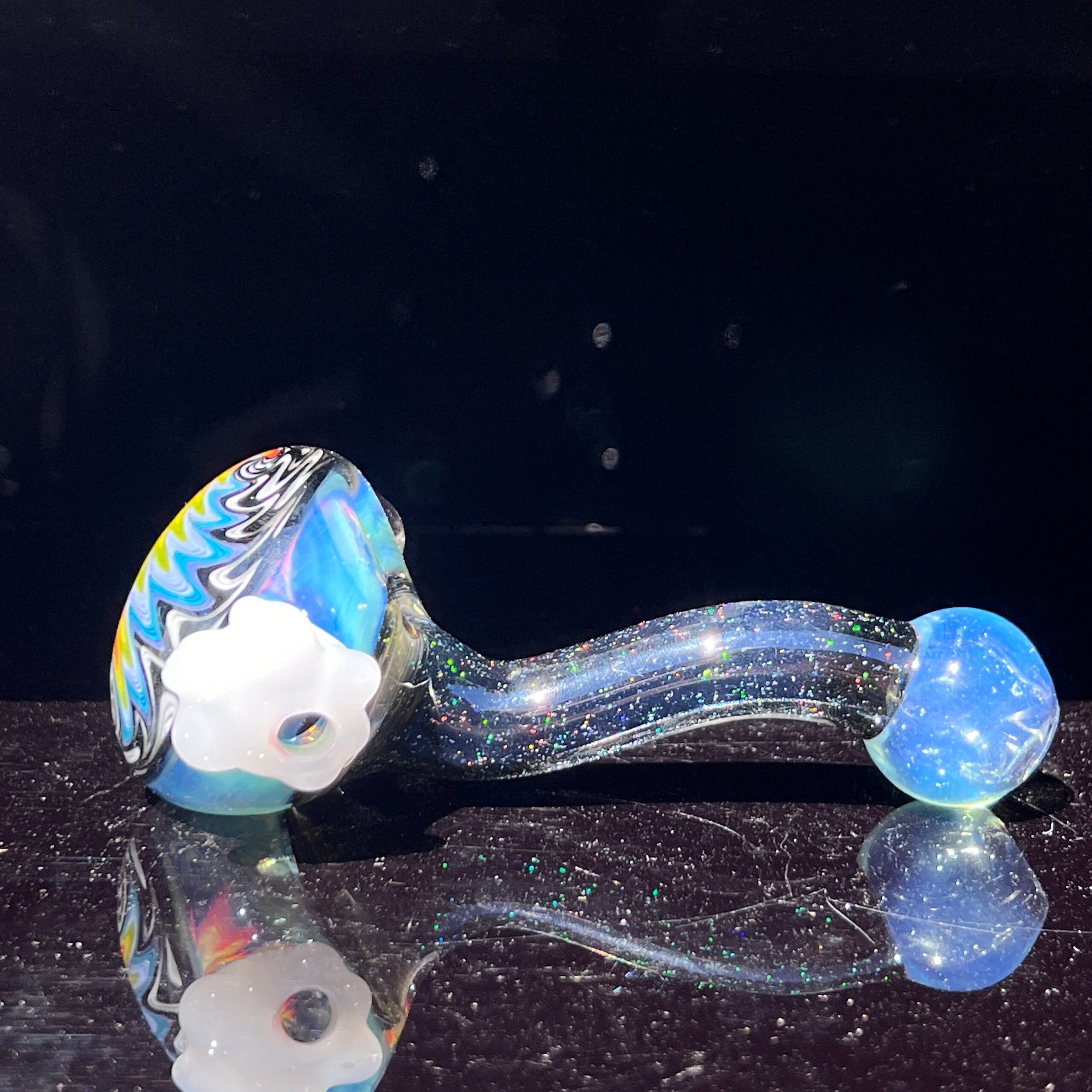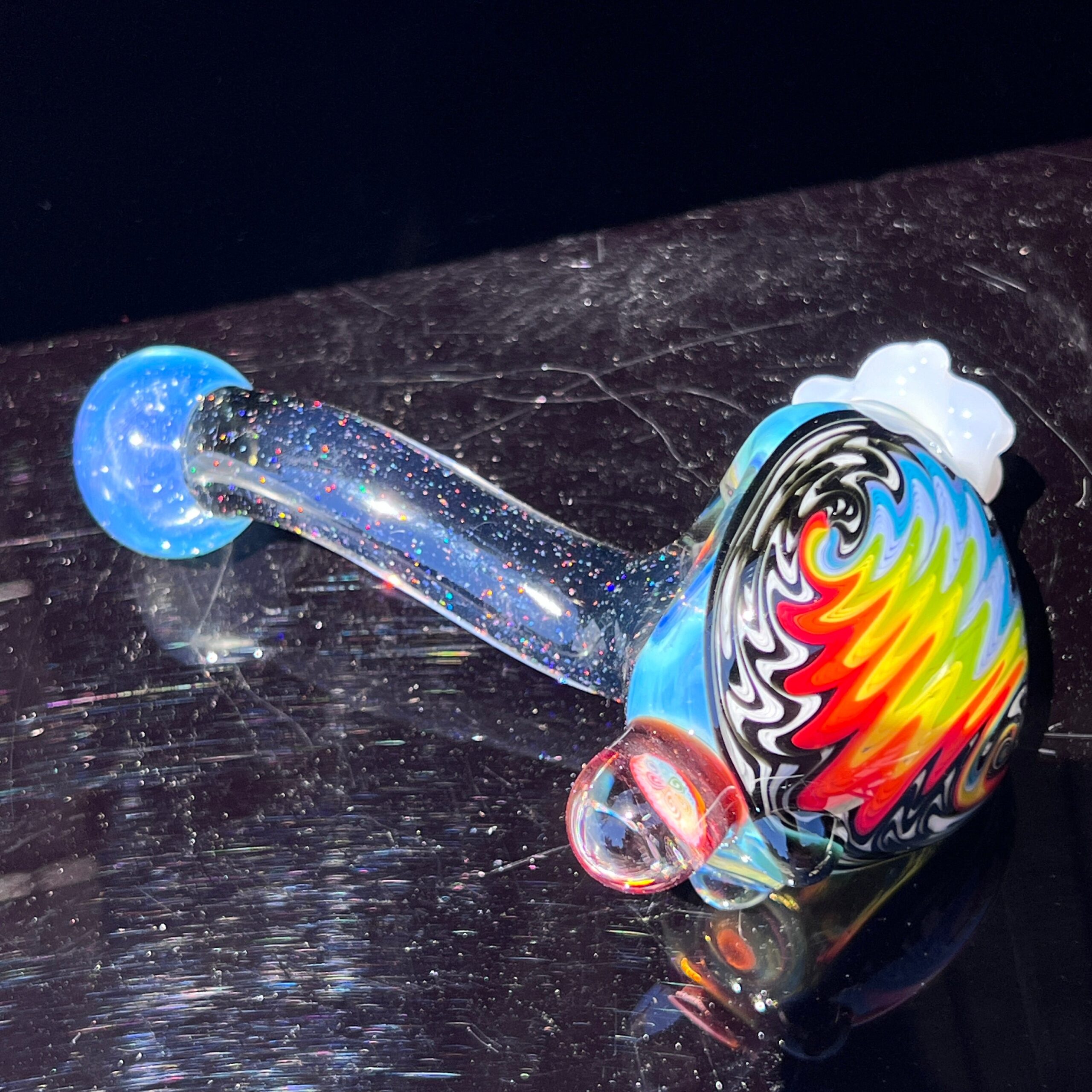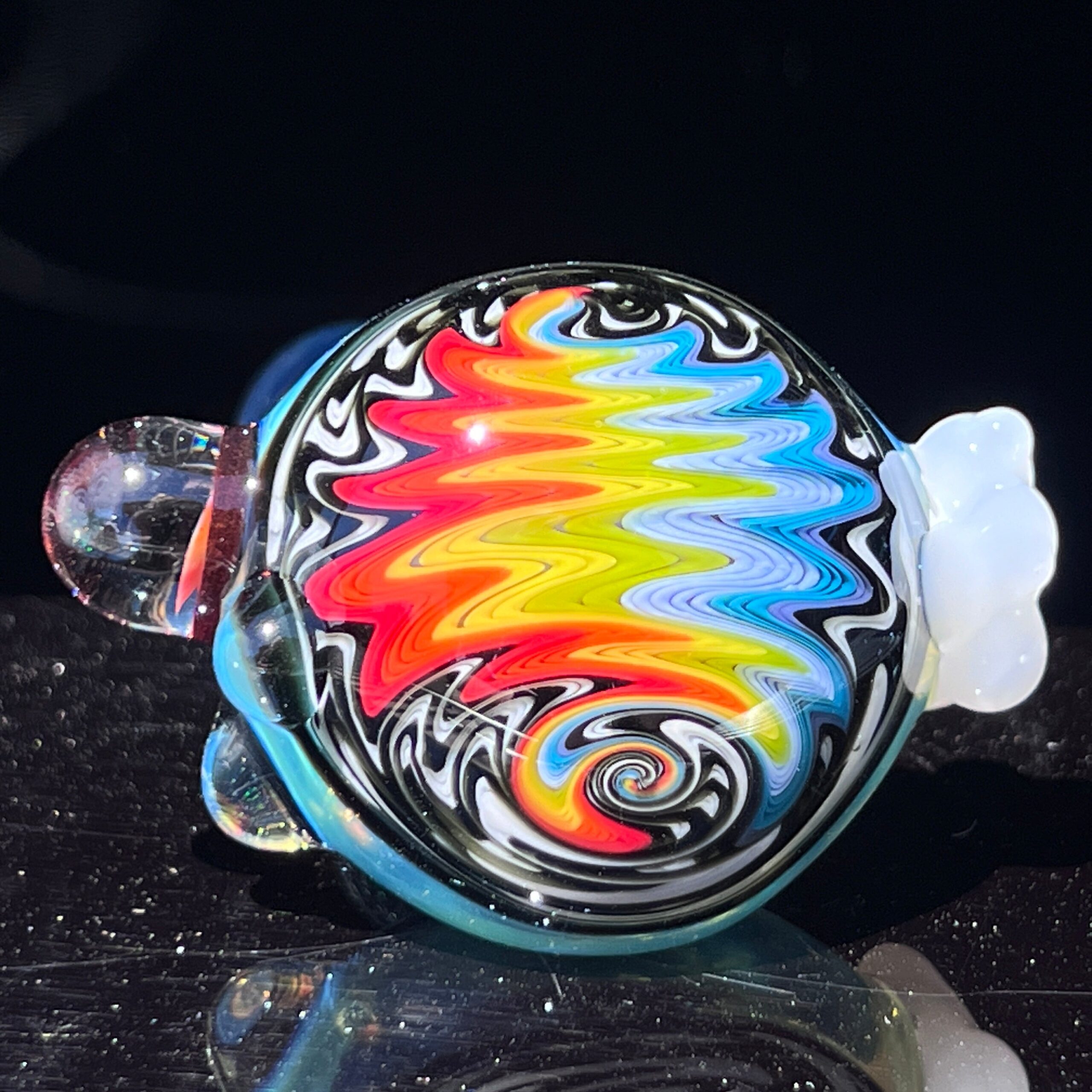 Design: Unique, hand-crafted design featuring crushed opal, rainbow wigwag pattern, detailed marble, and fluffy cloud reinforced carb.
