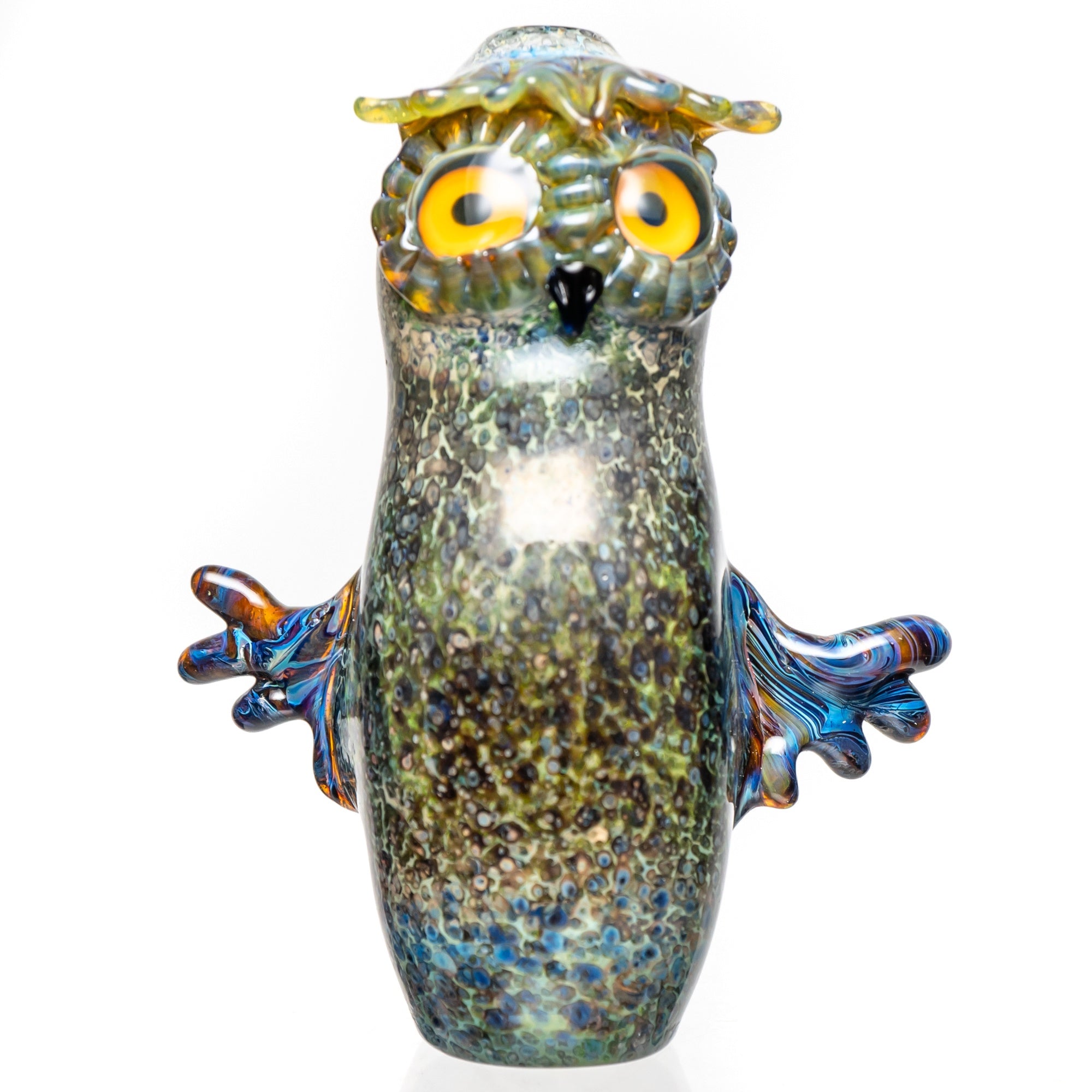 The Four Winds Flameworks – Hooter Hand Pipe – Amazon Night Frit offers a unique blend of functionality, artistry, and portability. Its single-hole push bowl, sculpted owl design, and durable Amazon Night Frit finish make it a superior choice for discerning smokers. Experience the difference today!