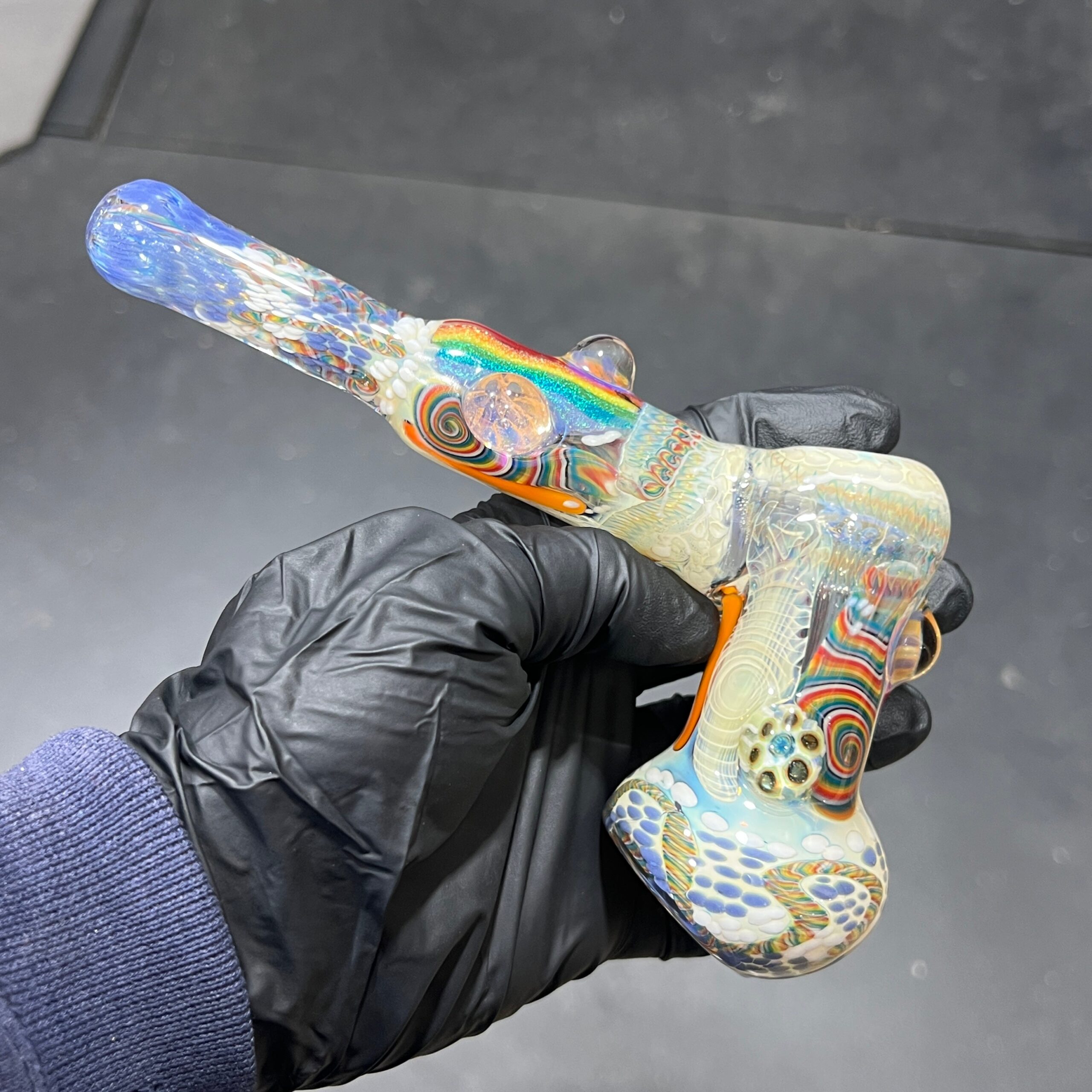 - Design: Hammer-shaped bubbler with intricate glasswork details.