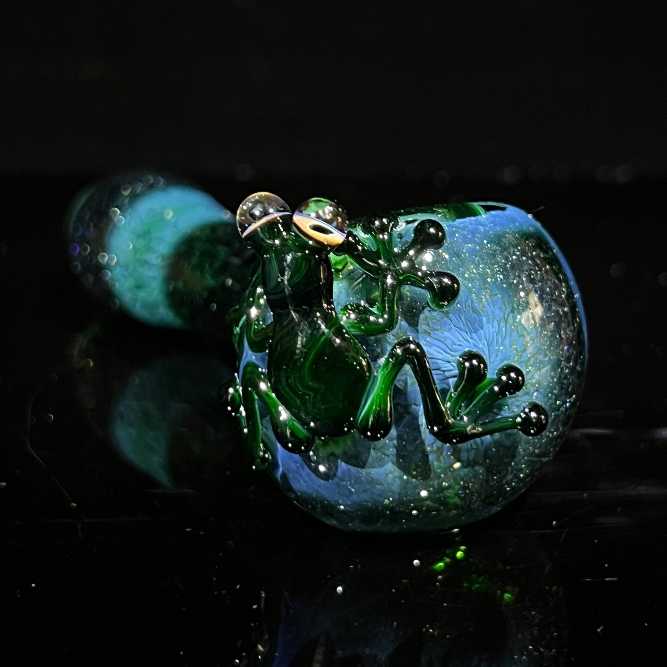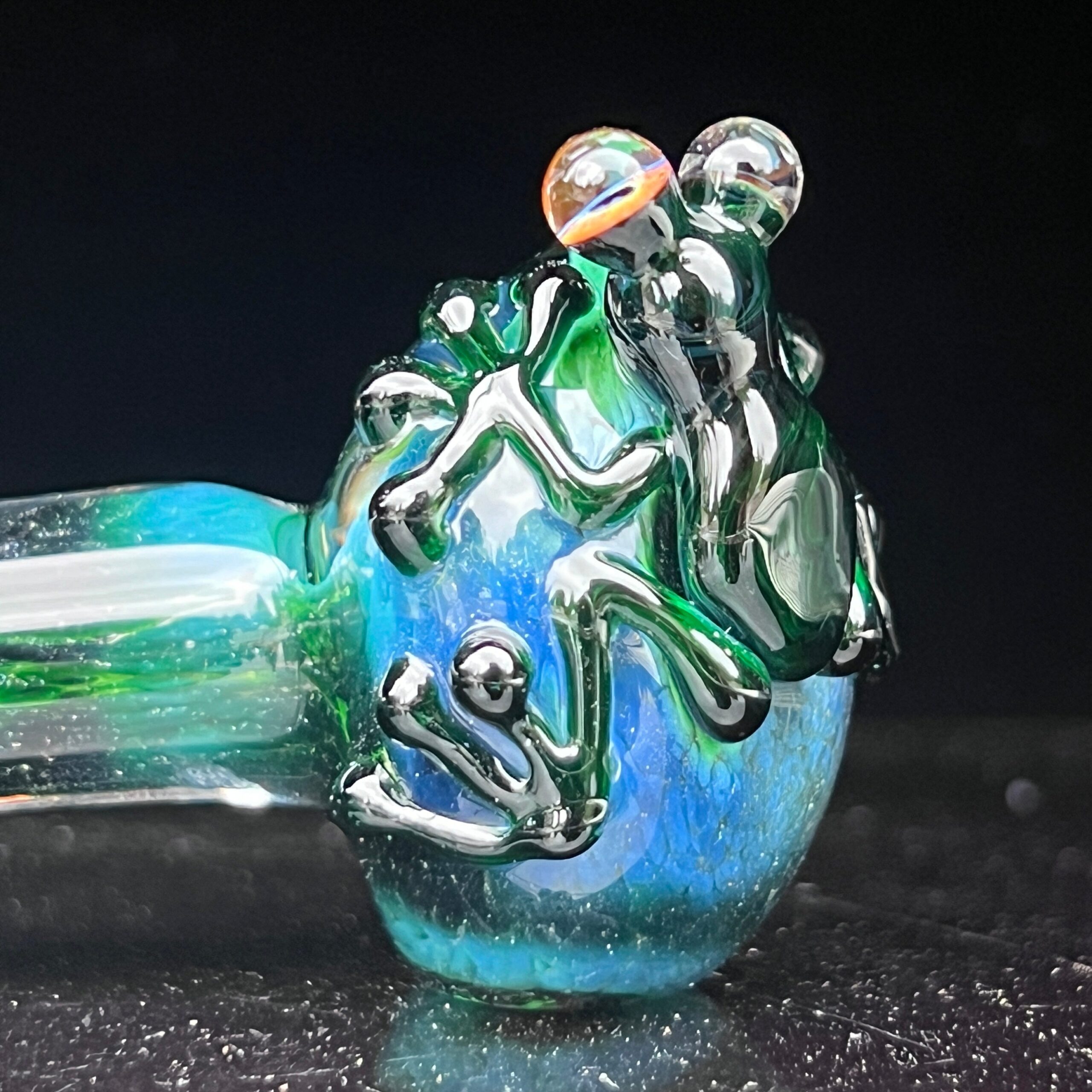 - Stunning Color Palette: The shimmering greens and blues create a visually captivating piece, transforming your vaping session into a relaxing and aesthetically pleasing experience. The frog pops against the blue glass, creating a stunning contrast.
