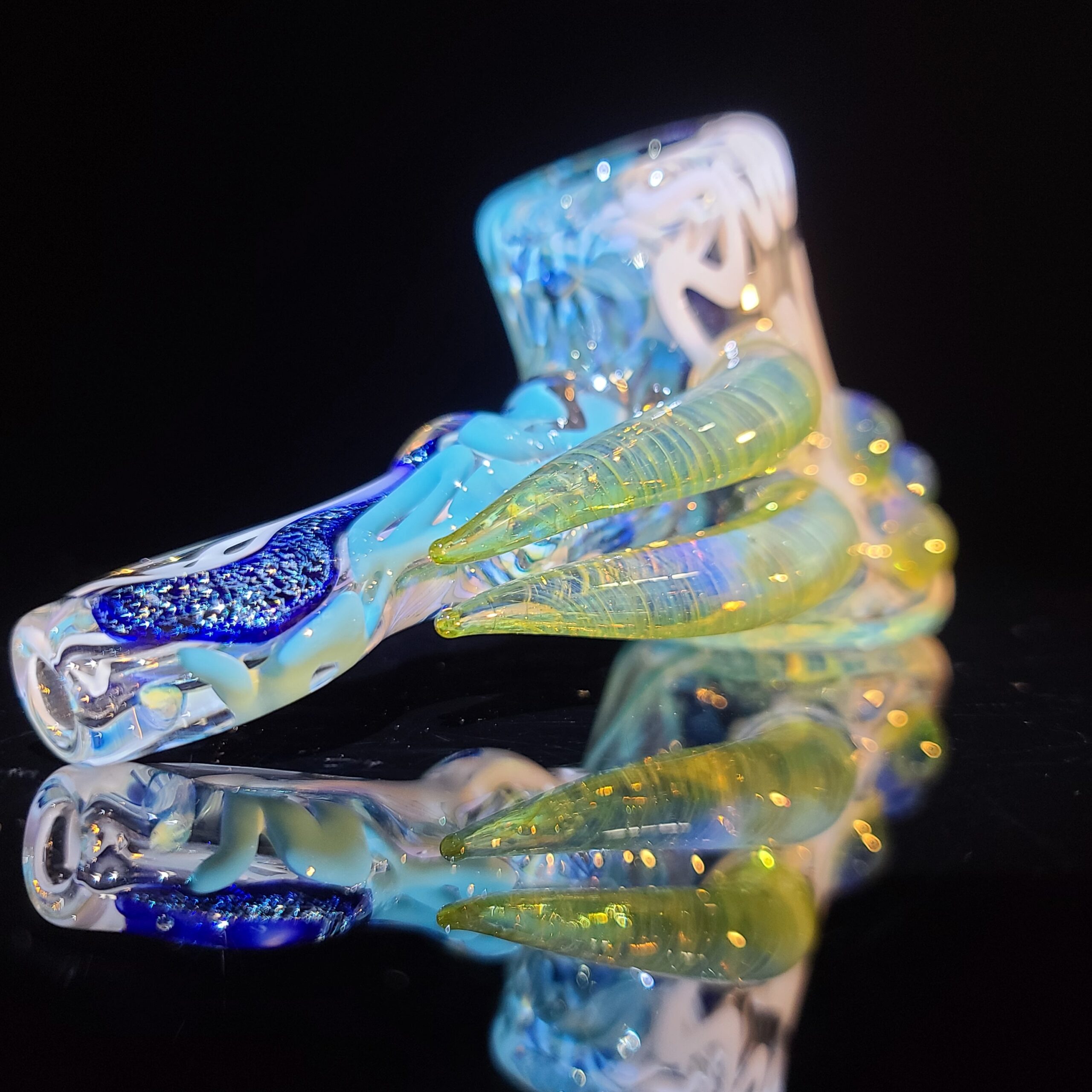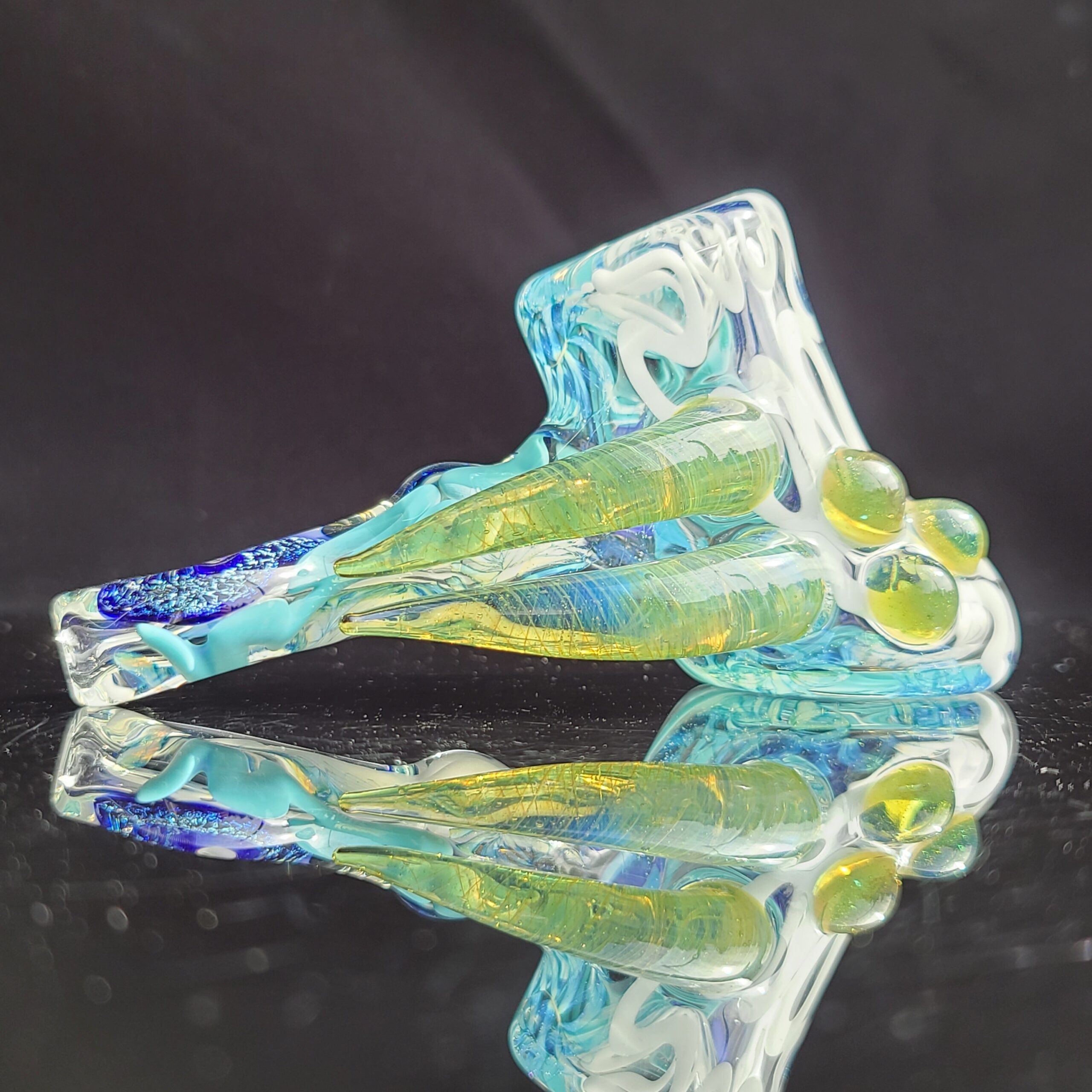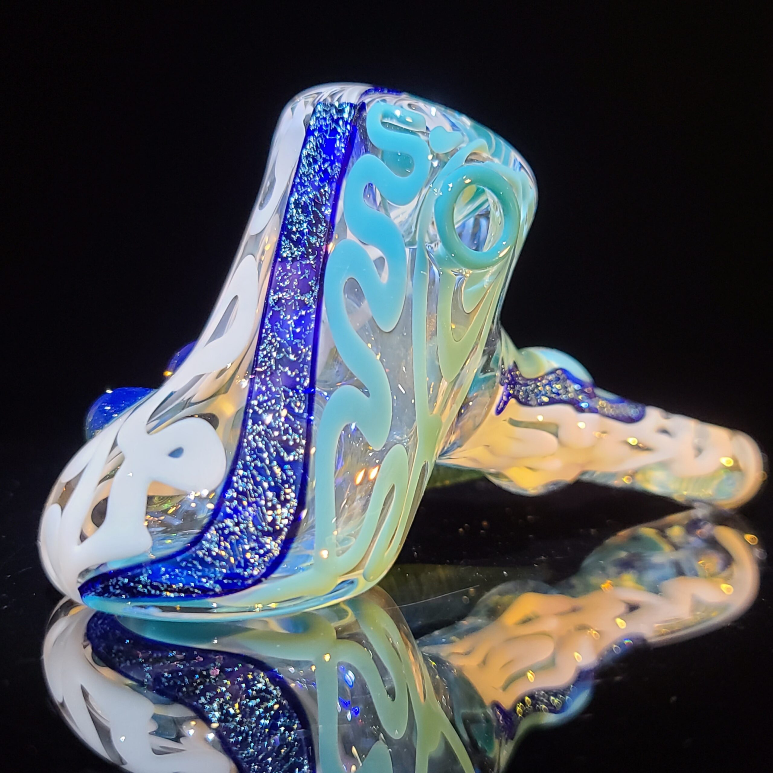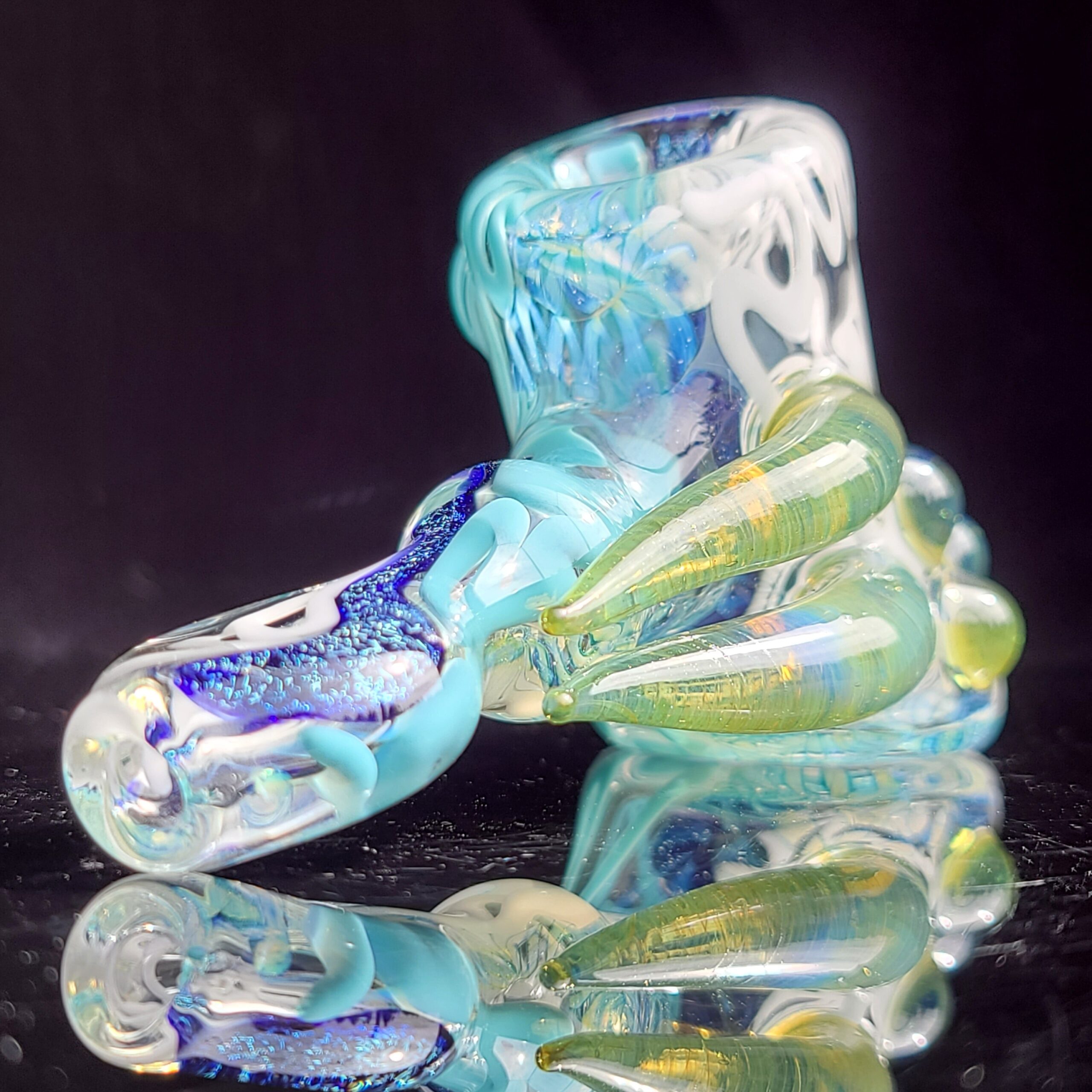 - Twisty Cane Detailing: The addition of intricately twisted cane glass adds another layer of visual texture and artistry, making the Horned Dichro Hammer a truly unique piece. This careful craftsmanship elevates the pipe beyond a simple smoking tool, making it a collector’s item.