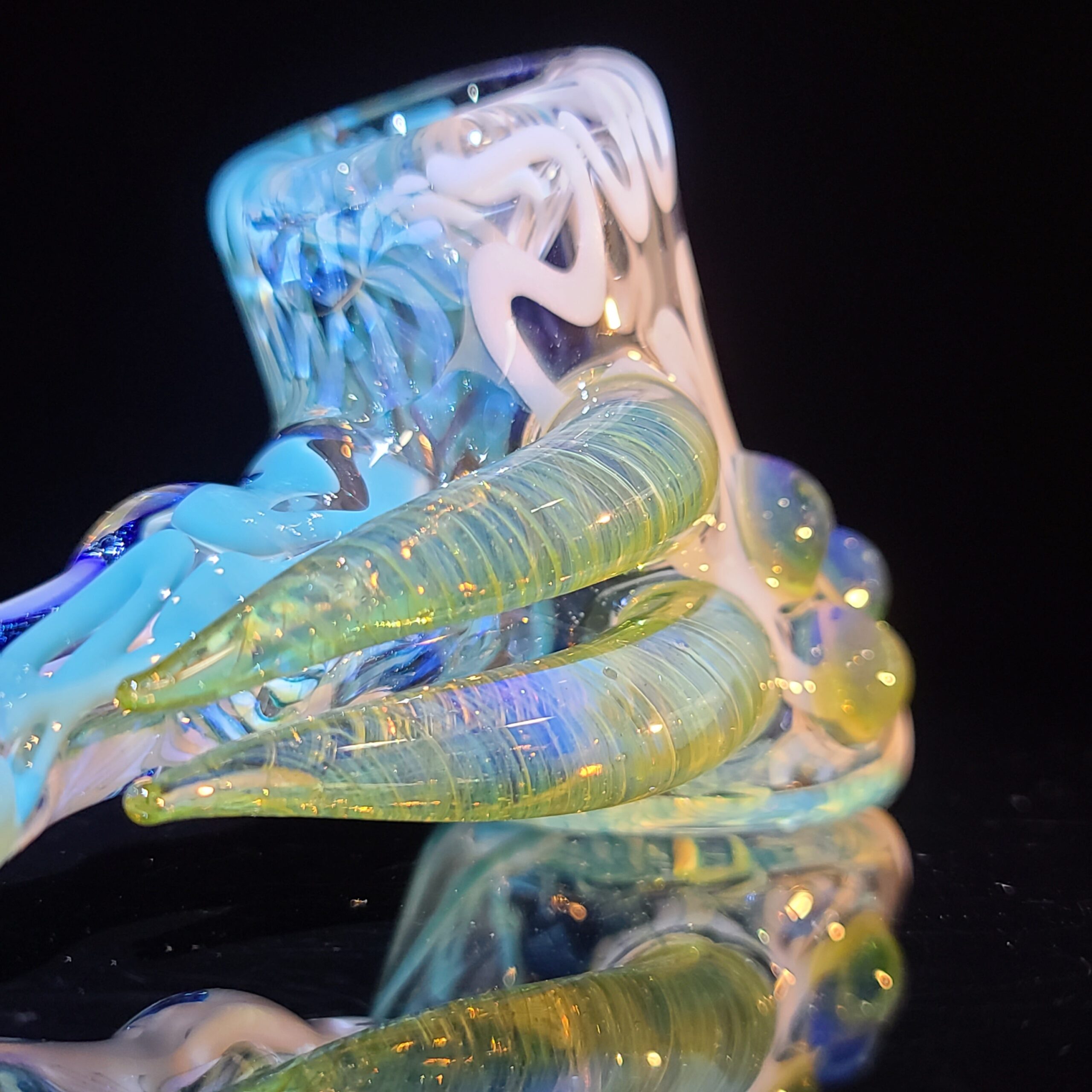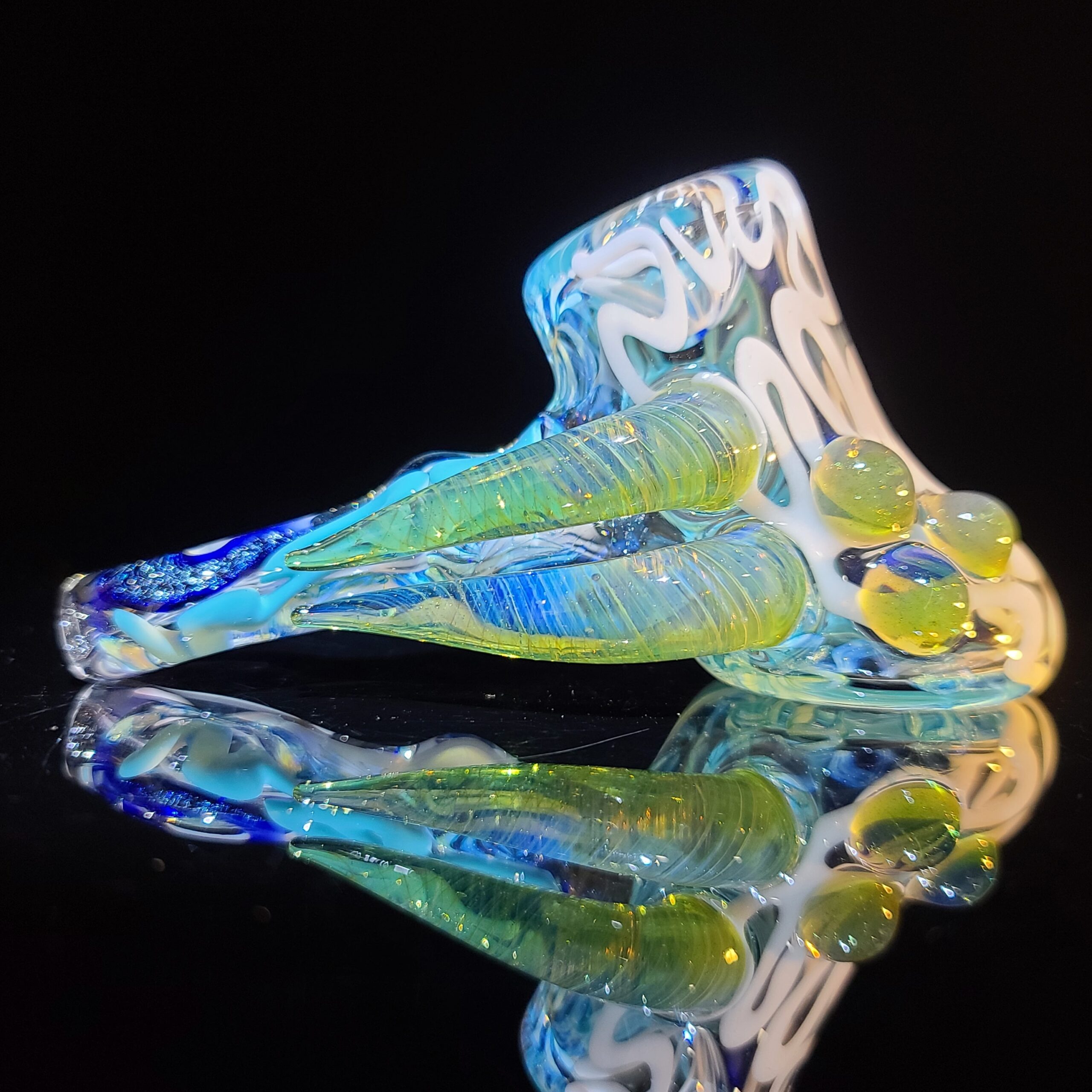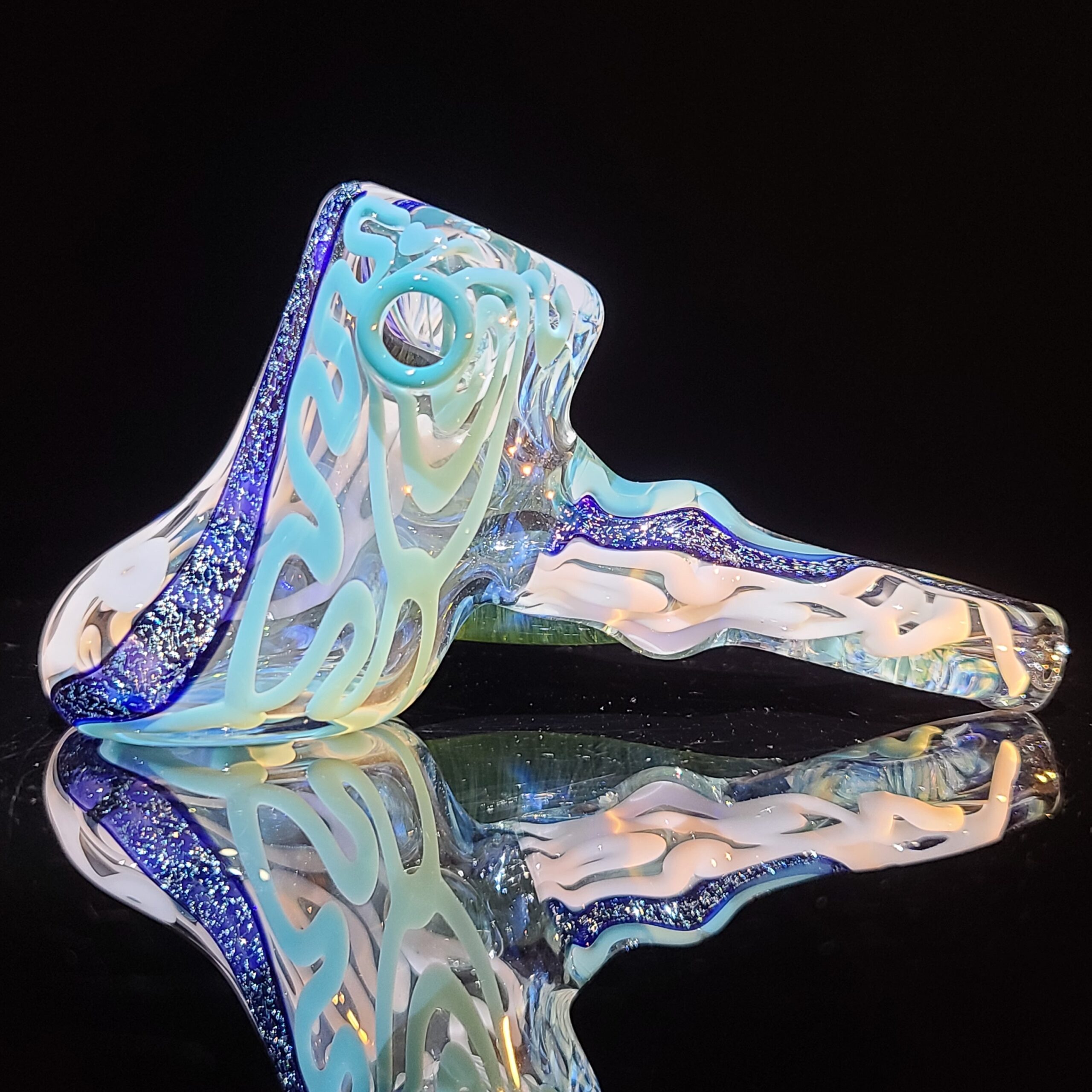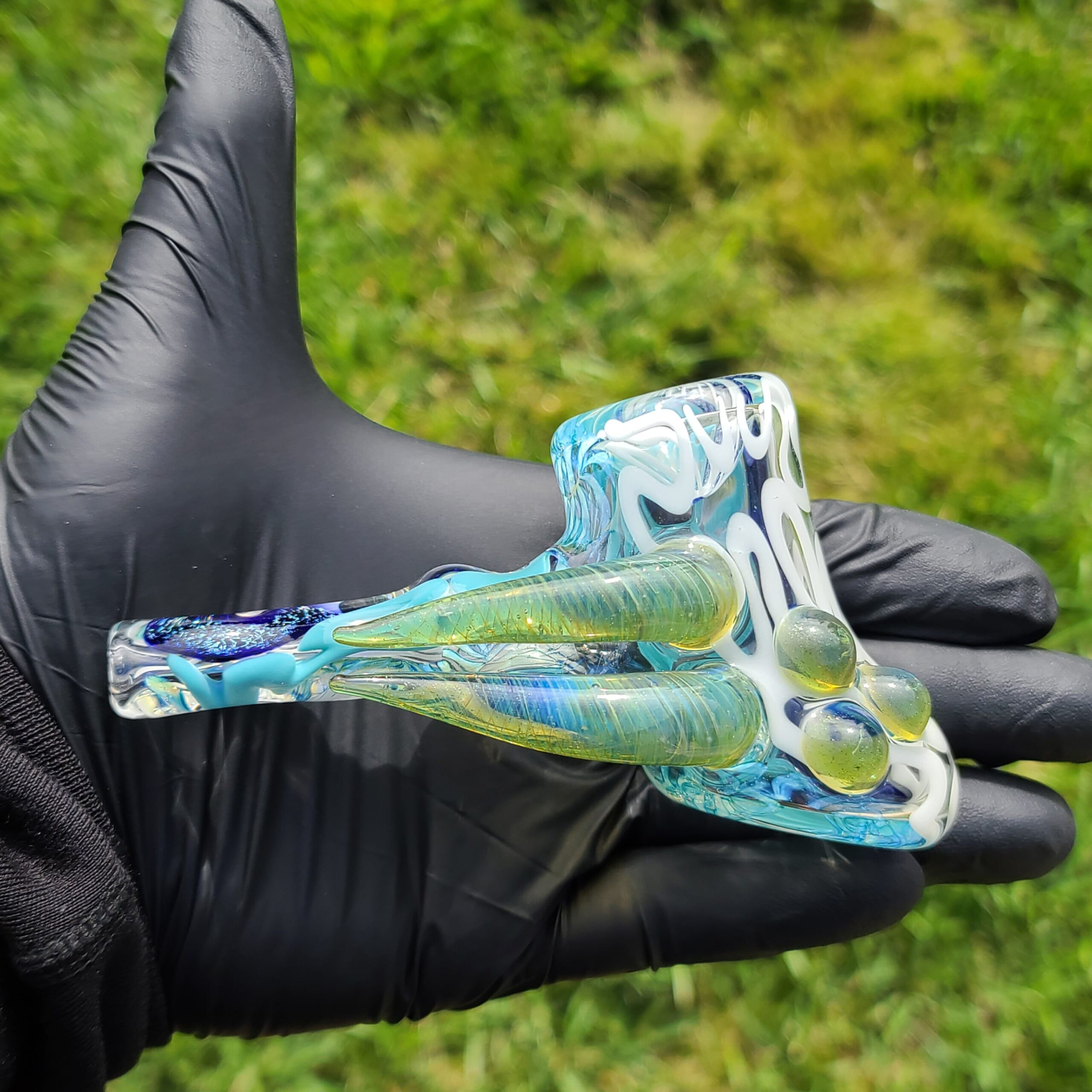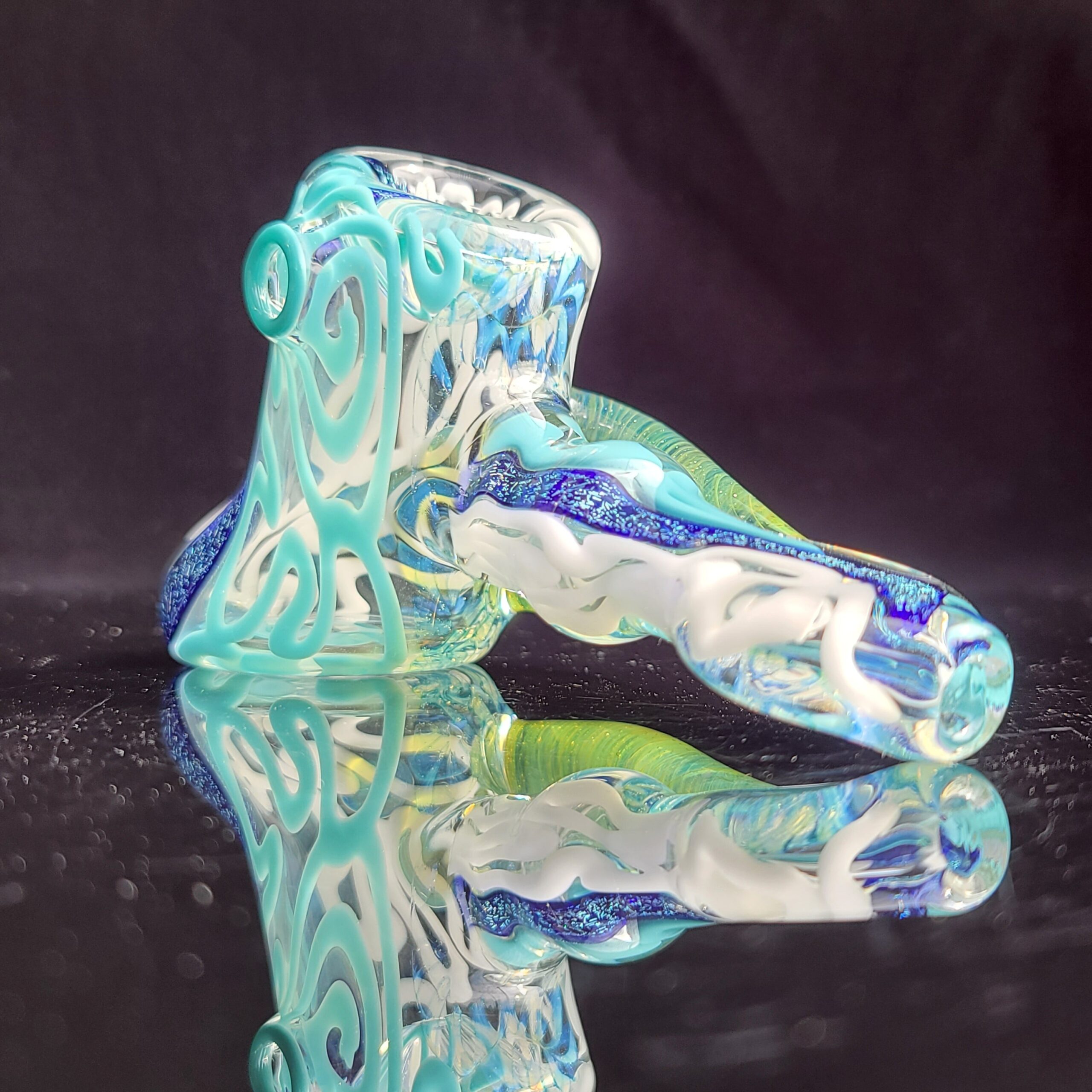 - Twisty Cane Detailing: The addition of intricately twisted cane glass adds another layer of visual texture and artistry, making the Horned Dichro Hammer a truly unique piece. This careful craftsmanship elevates the pipe beyond a simple smoking tool, making it a collector’s item.