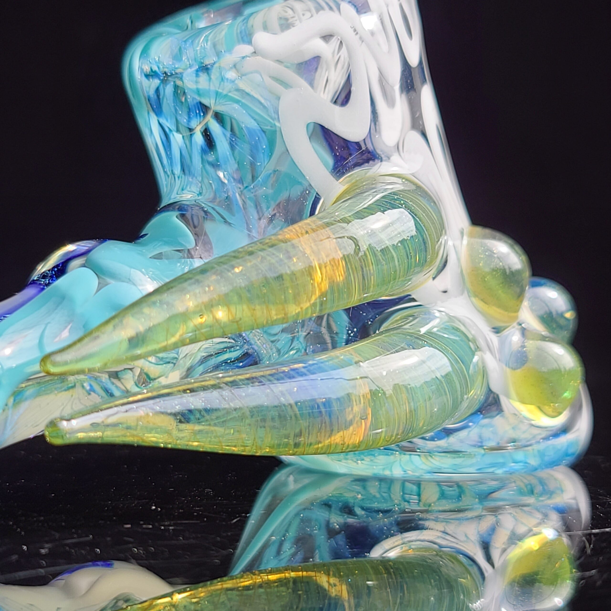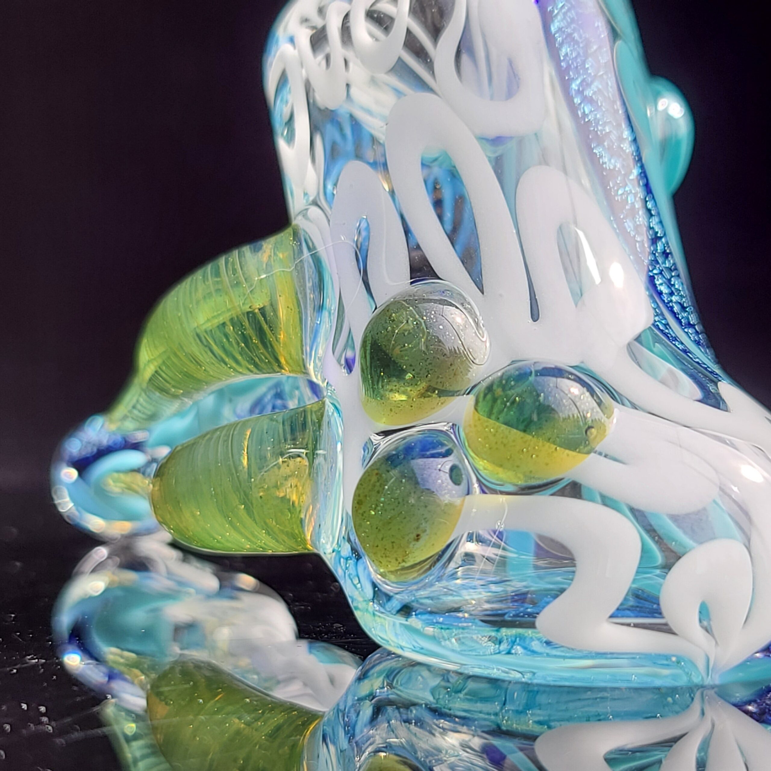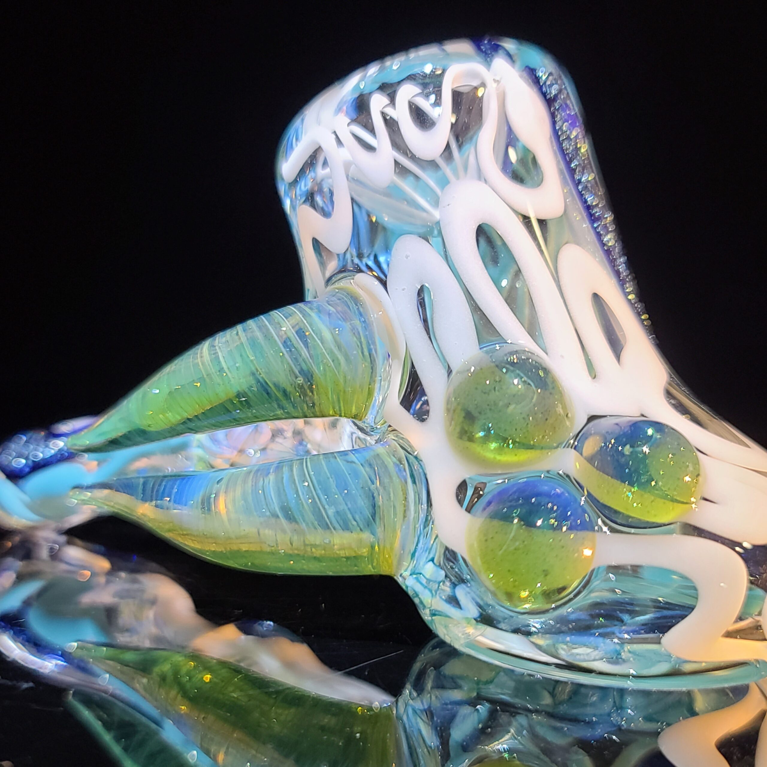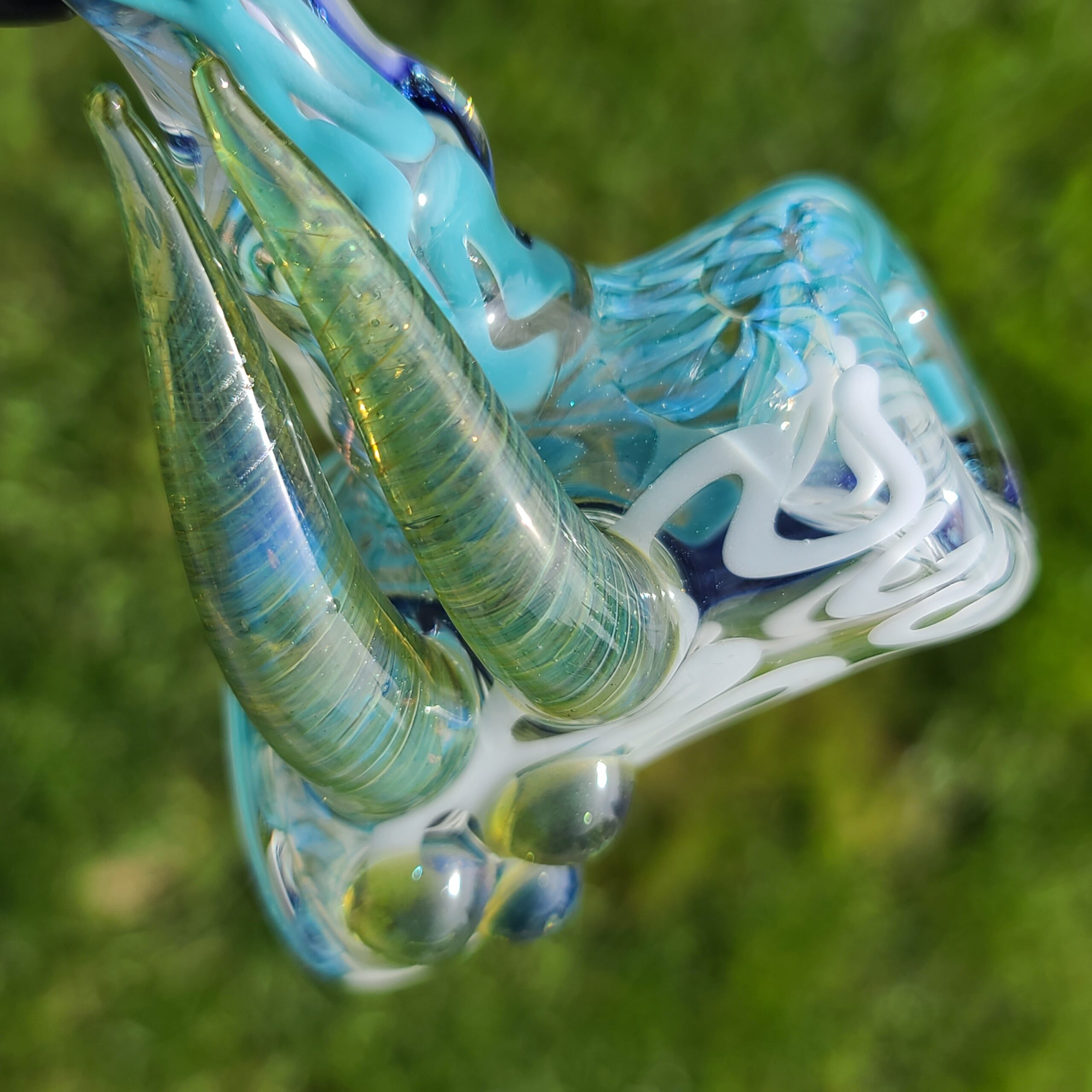 Design: Handcrafted and uniquely designed with dichroic glass, twisted cane, and fat colored marbles.