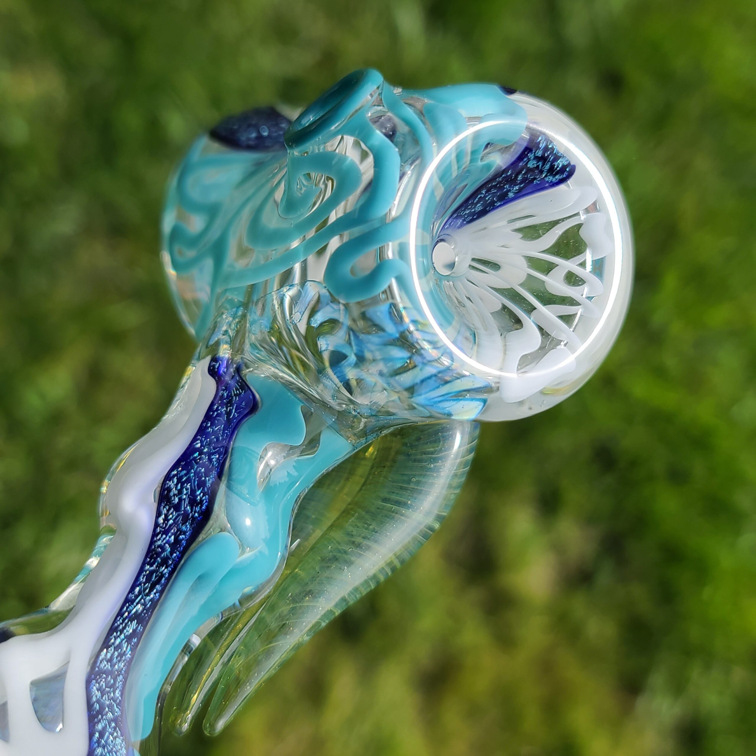 - Intricate Dichroic Glasswork: Rivers of dichroic glass flow throughout the pipe, creating a mesmerizing kaleidoscope of colors that shift and change with the light. This isn’t just a pretty face; the dichroic glass adds depth and complexity to the smoking experience, enhancing the visual appeal of your chosen material.