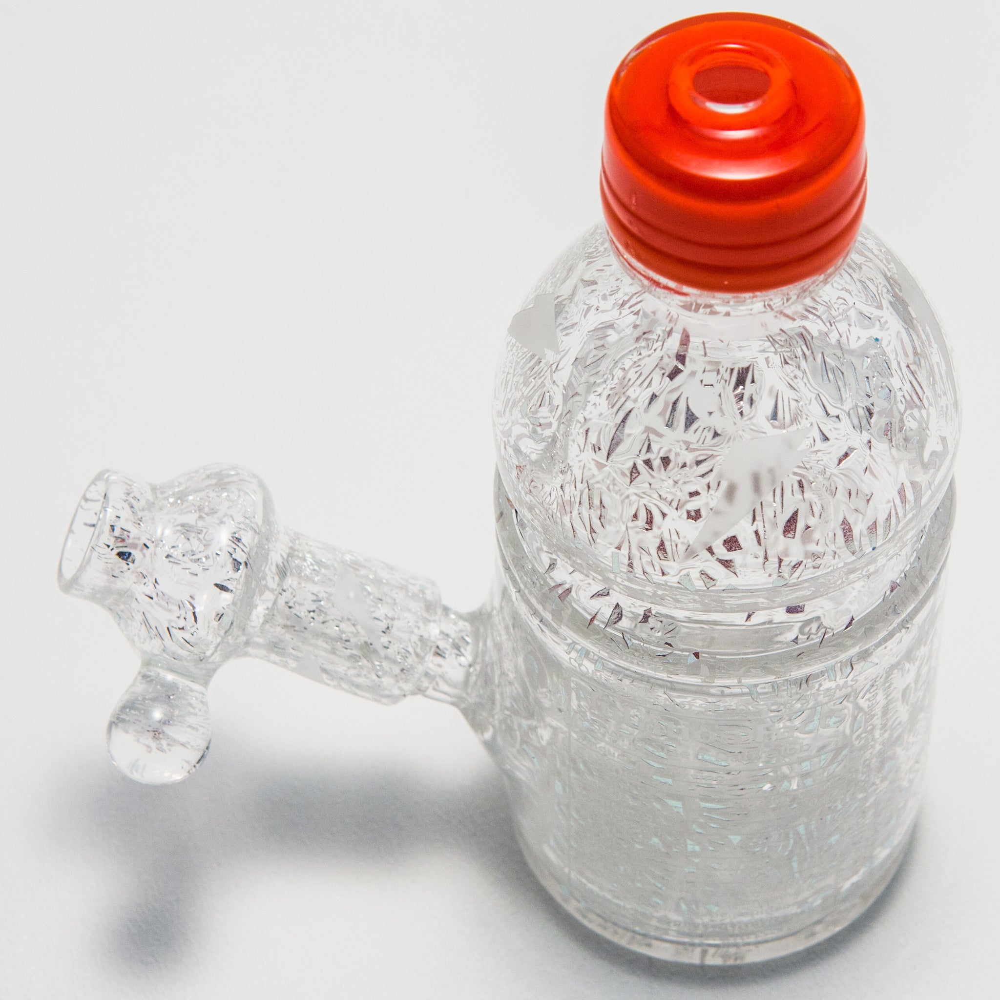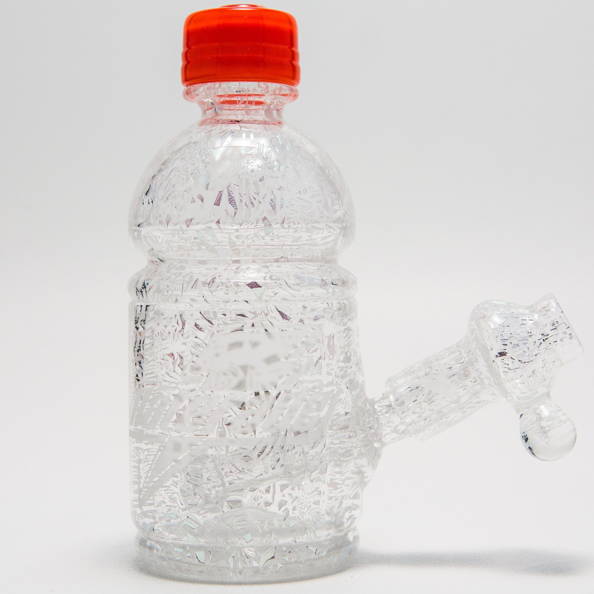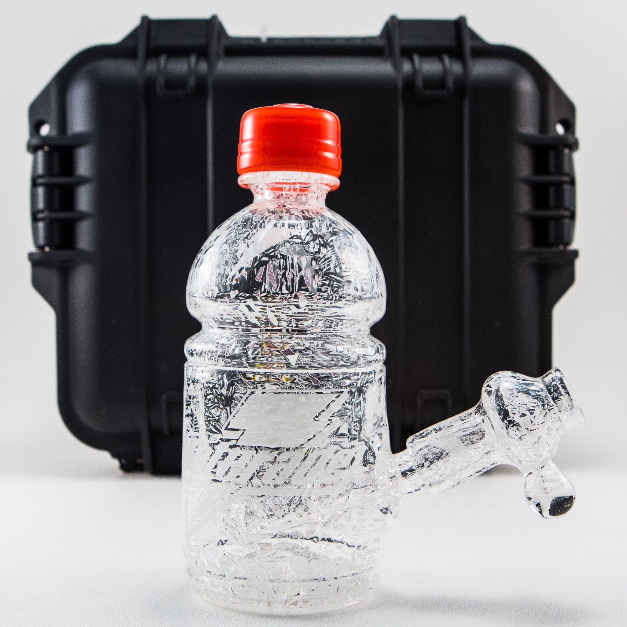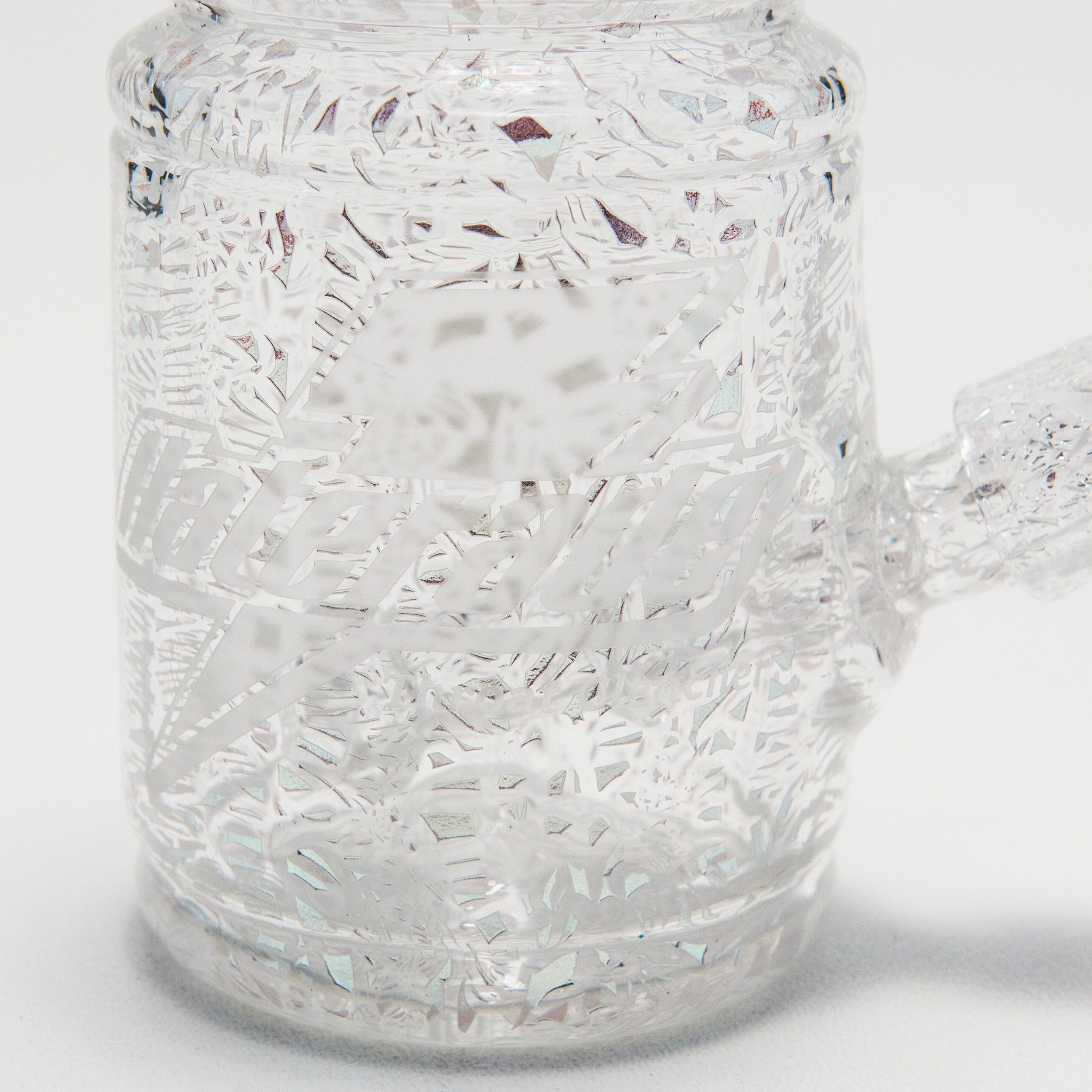 - Haterade Logo and Lightning Bolts Sandblasted on Body by Deborah Evol: Deborah Evol’s signature sandblasted design adds a touch of rebellious elegance, making this bubbler a true collector’s item. The intricate detail highlights the quality of the craftsmanship.