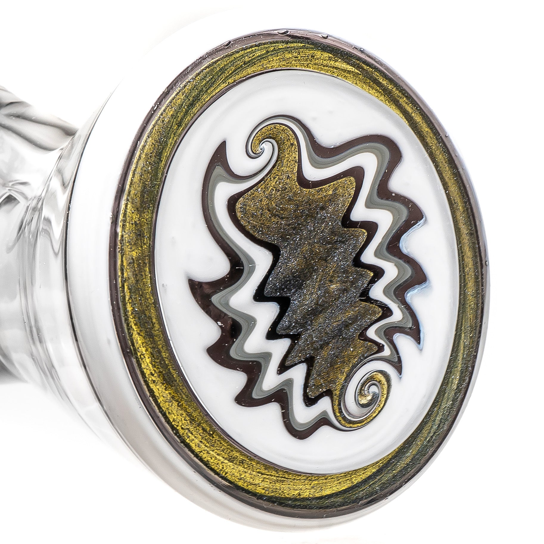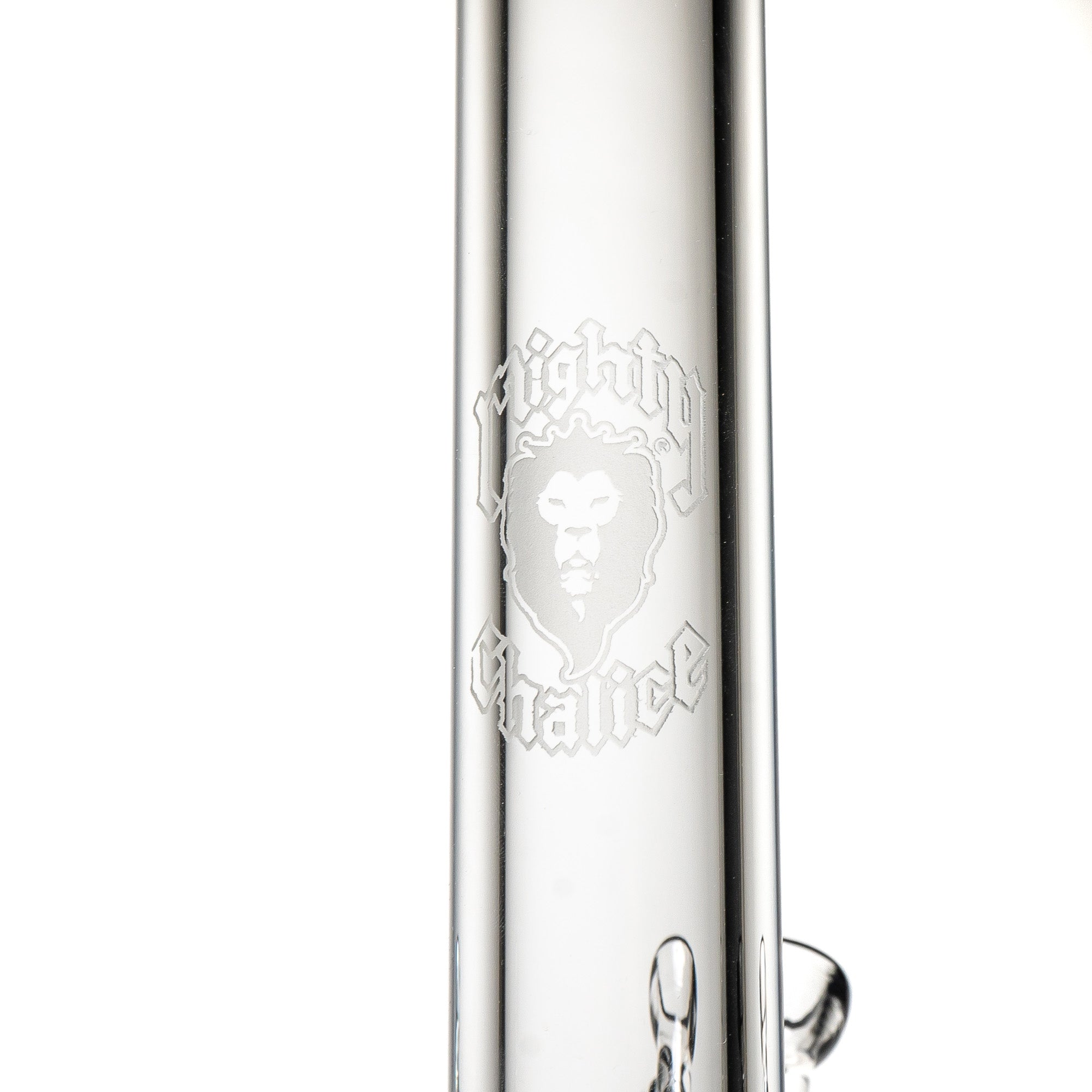 The Mighty Chalice is crafted from high-quality, durable borosilicate glass, known for its heat resistance and clarity. The dimensions are approximately 16.8″ in height and 4″ at the base. Its elegant tuxedo linework adds a sophisticated touch. Always handle with care to prevent breakage.