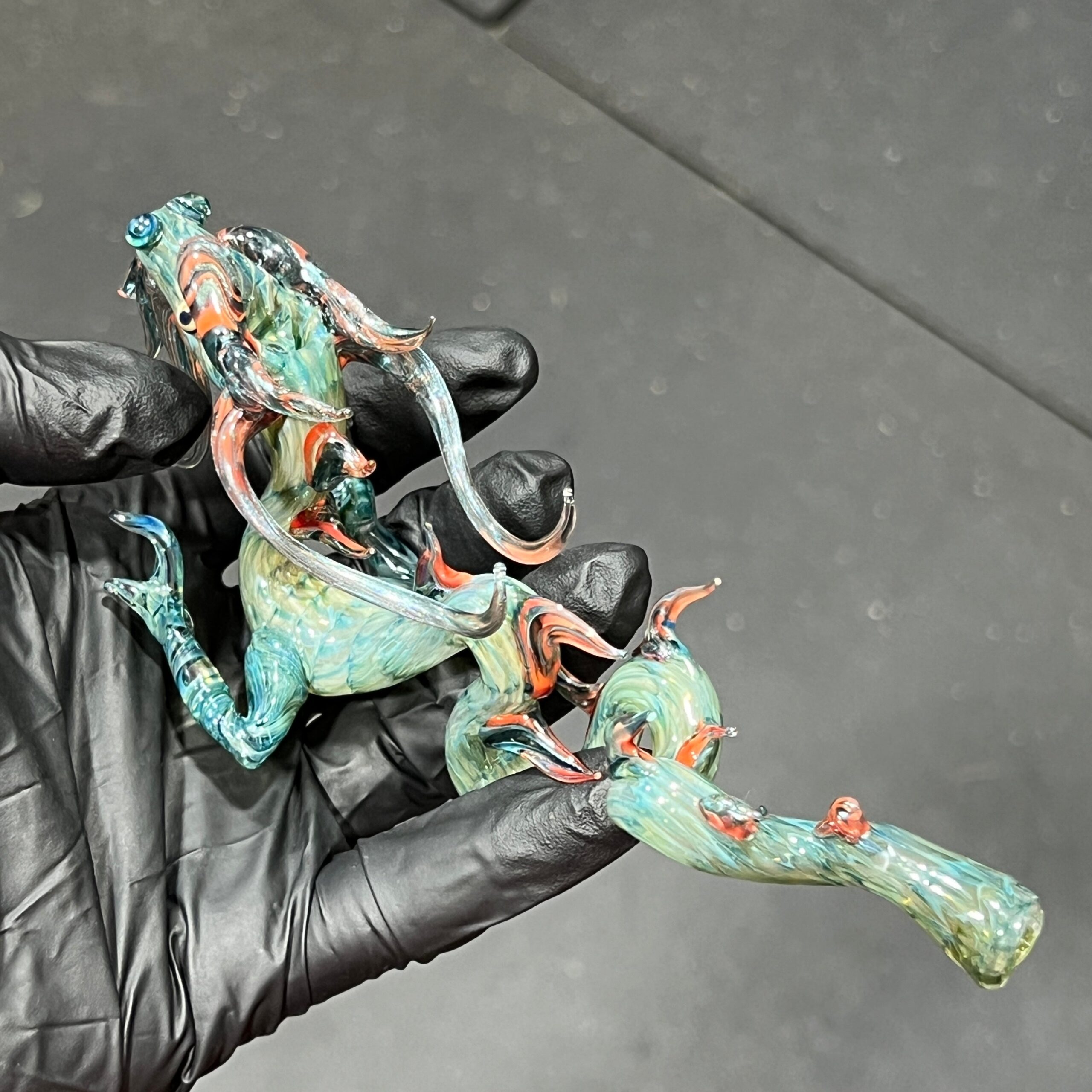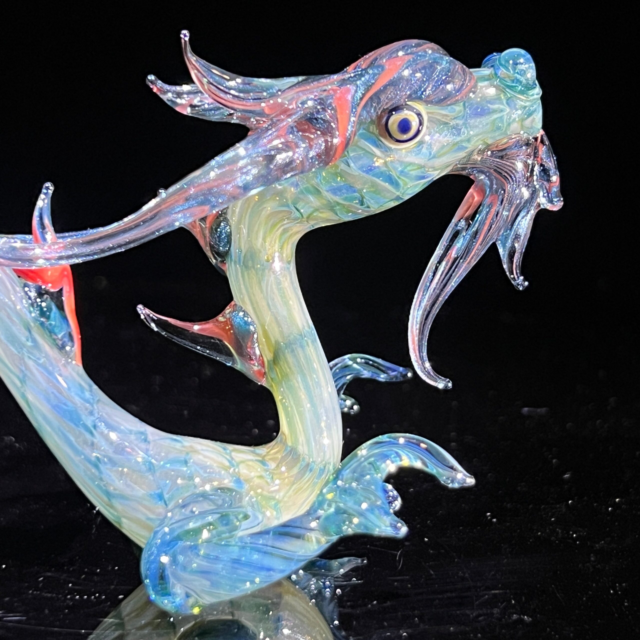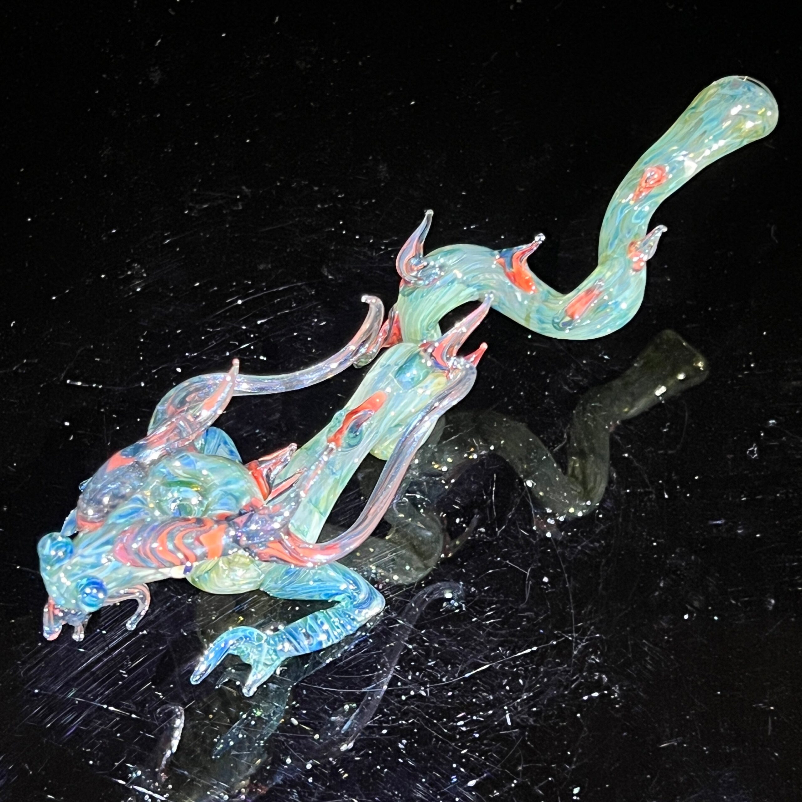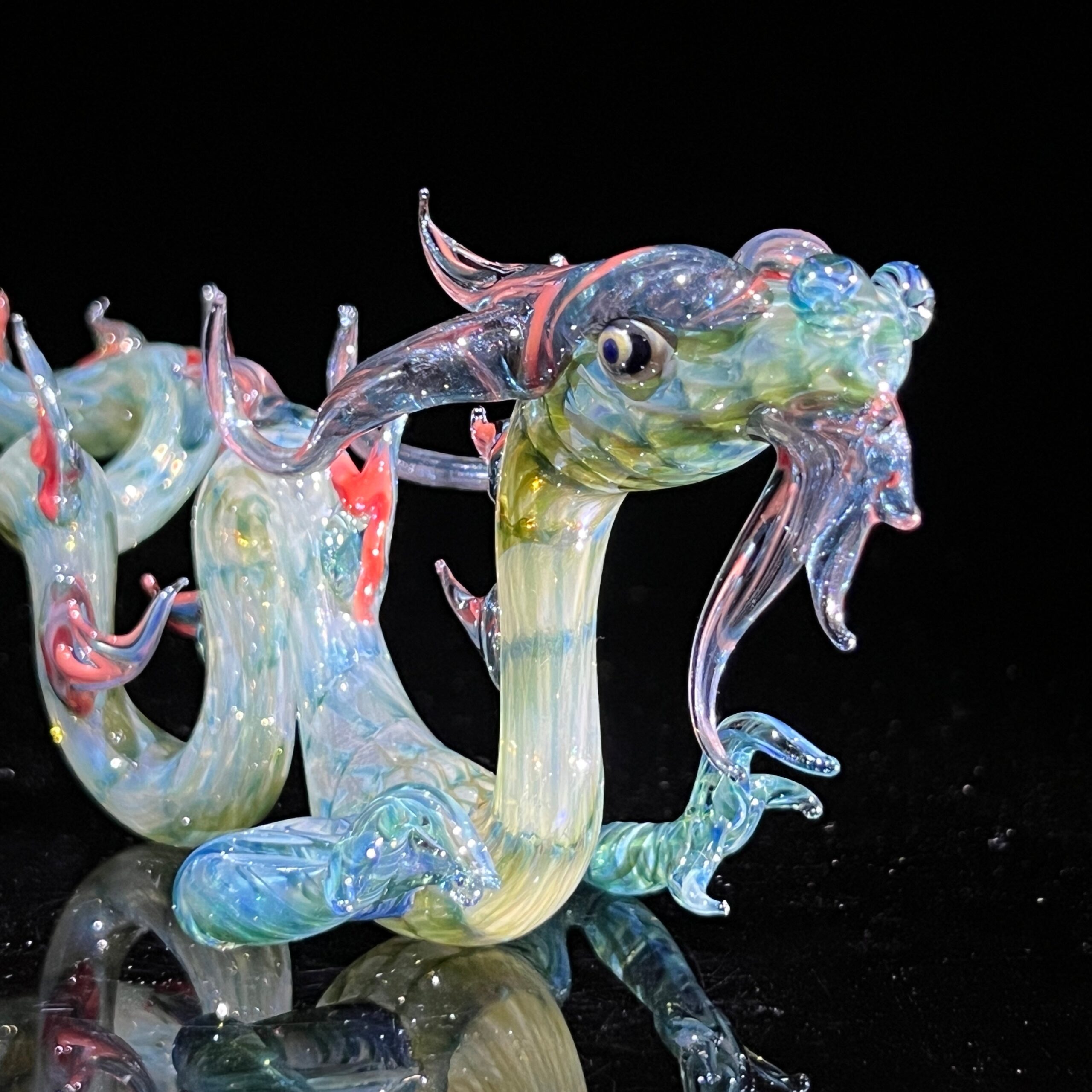 Design Specifics: Hand-blown and intricately sculpted dragon design with swirling glass details.