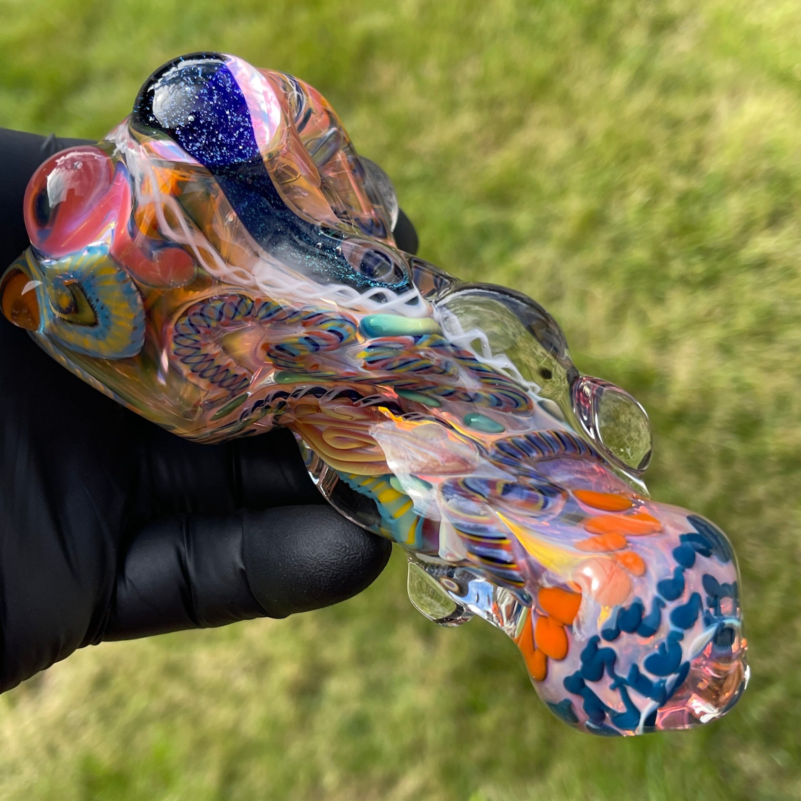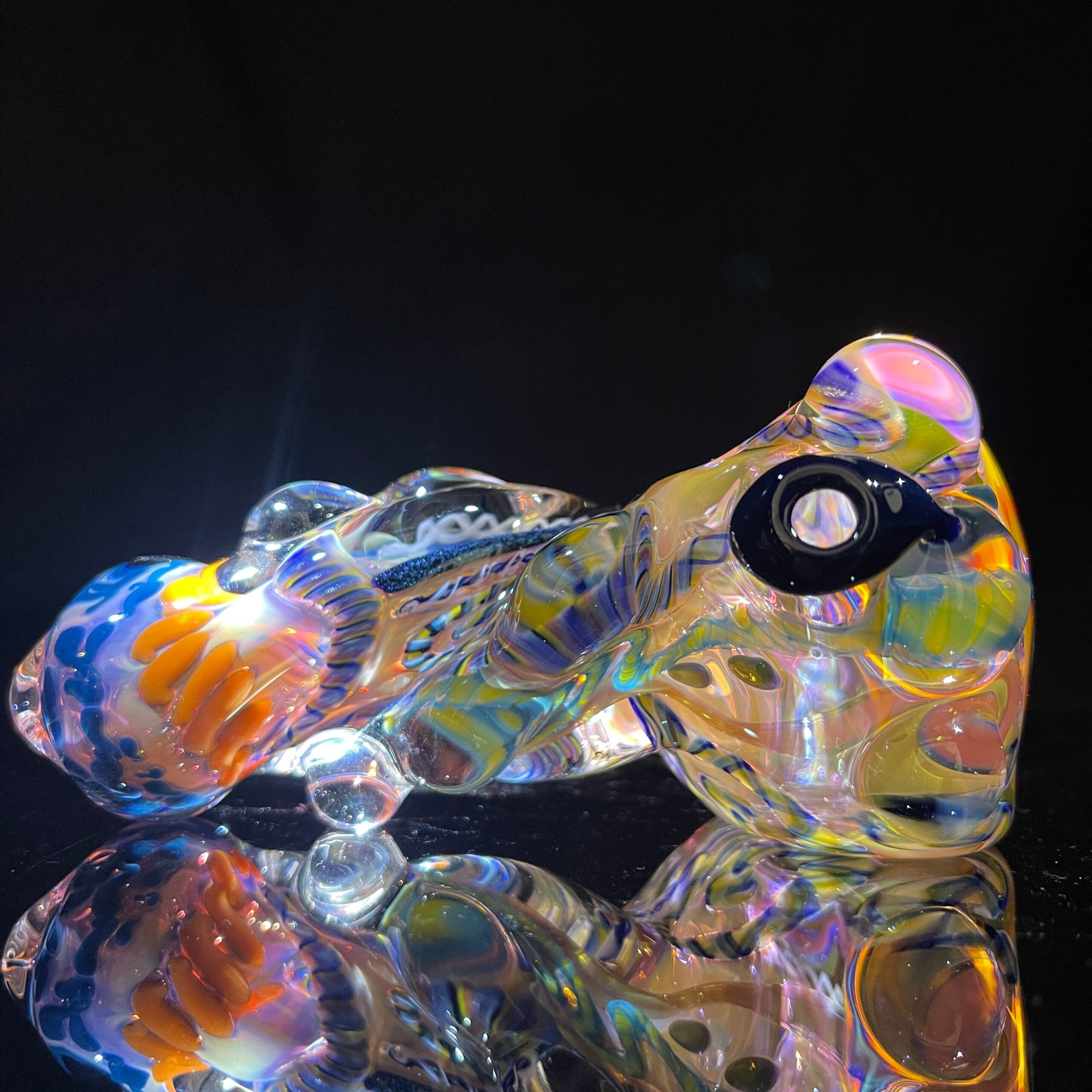 - Twisty Cane and Dichroic Glass Accents: The intricate design, featuring swirling cane and vibrant dichroic glass ribbons, creates a visually stunning piece that’s sure to be a conversation starter. This isn’t just a functional pipe; it’s a work of art.