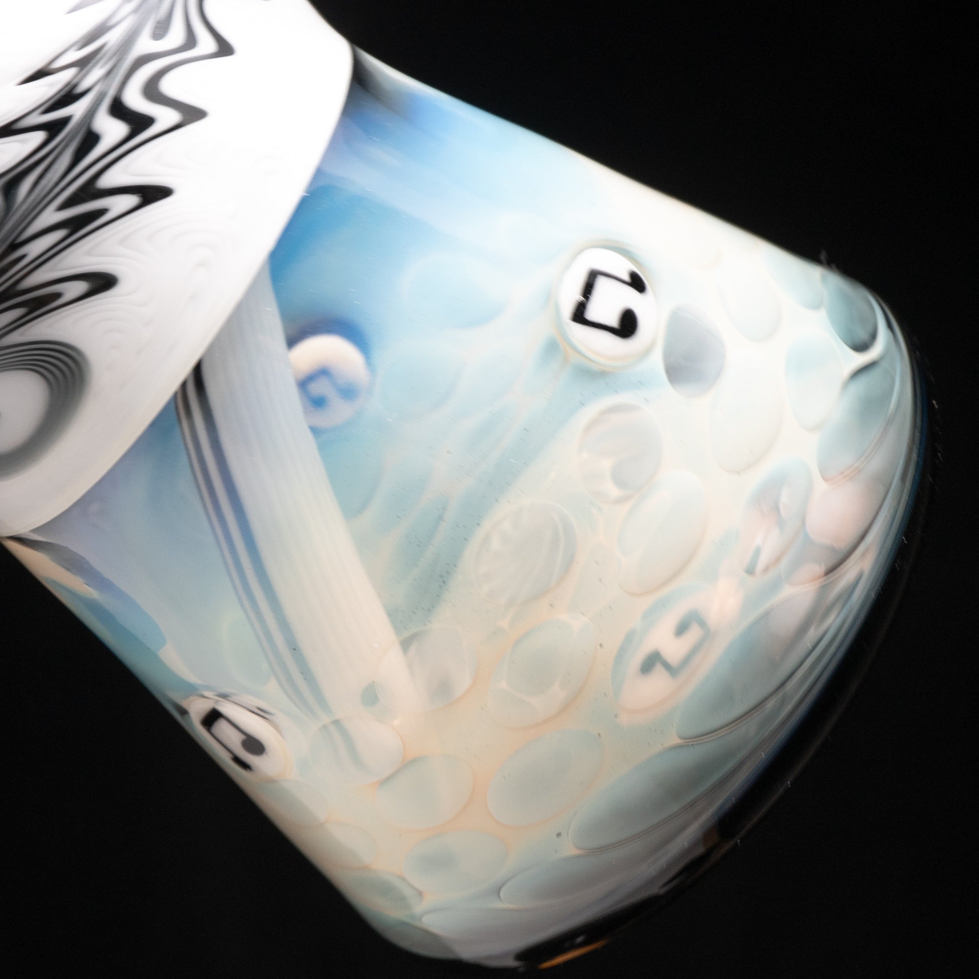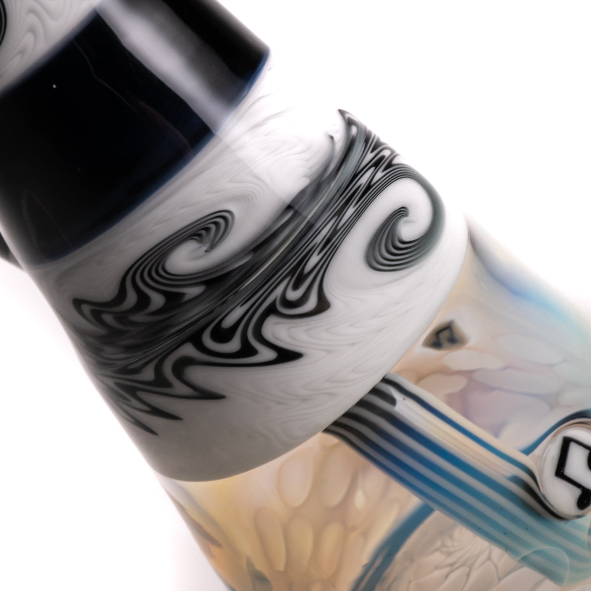 - Color Sections & Fume w/ Linework & Millie Inlays on Neck, Can & Base: The stunning Grape and White with Tuxedo sections, enhanced by intricate linework and Millie inlays, create a visually captivating piece that’s as much a work of art as it is a functional tool. The vibrant colors add a touch of personality and style to your vaping ritual.