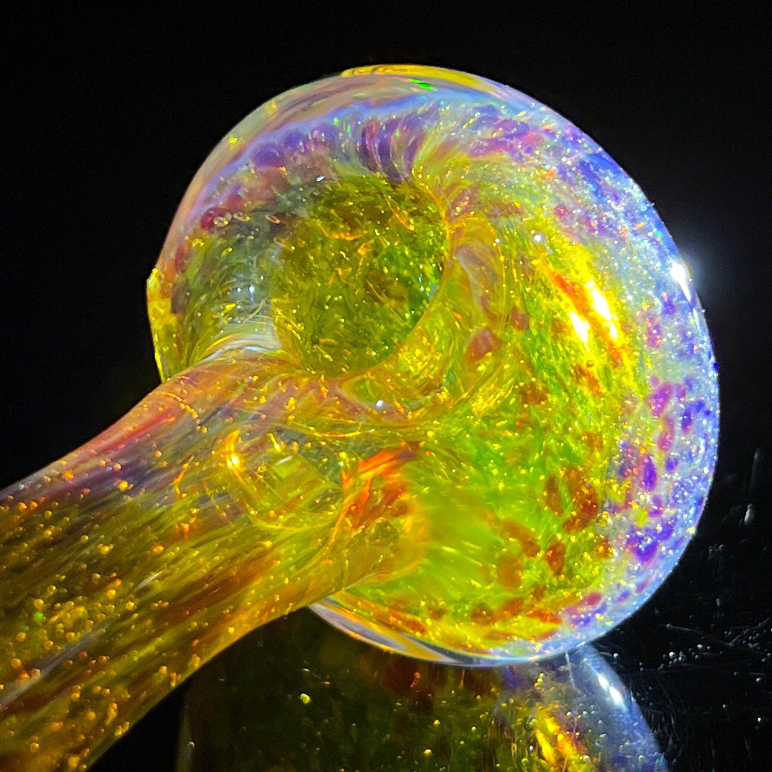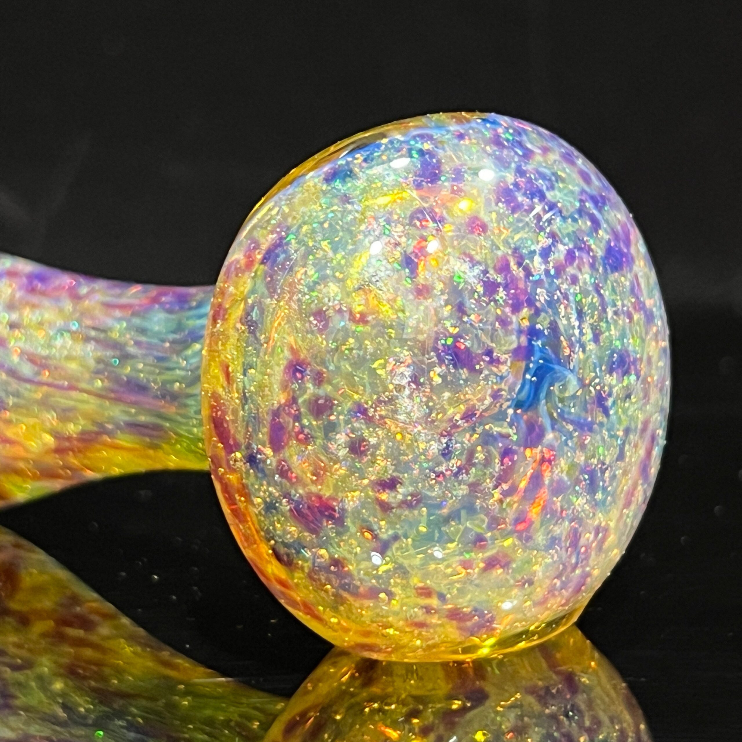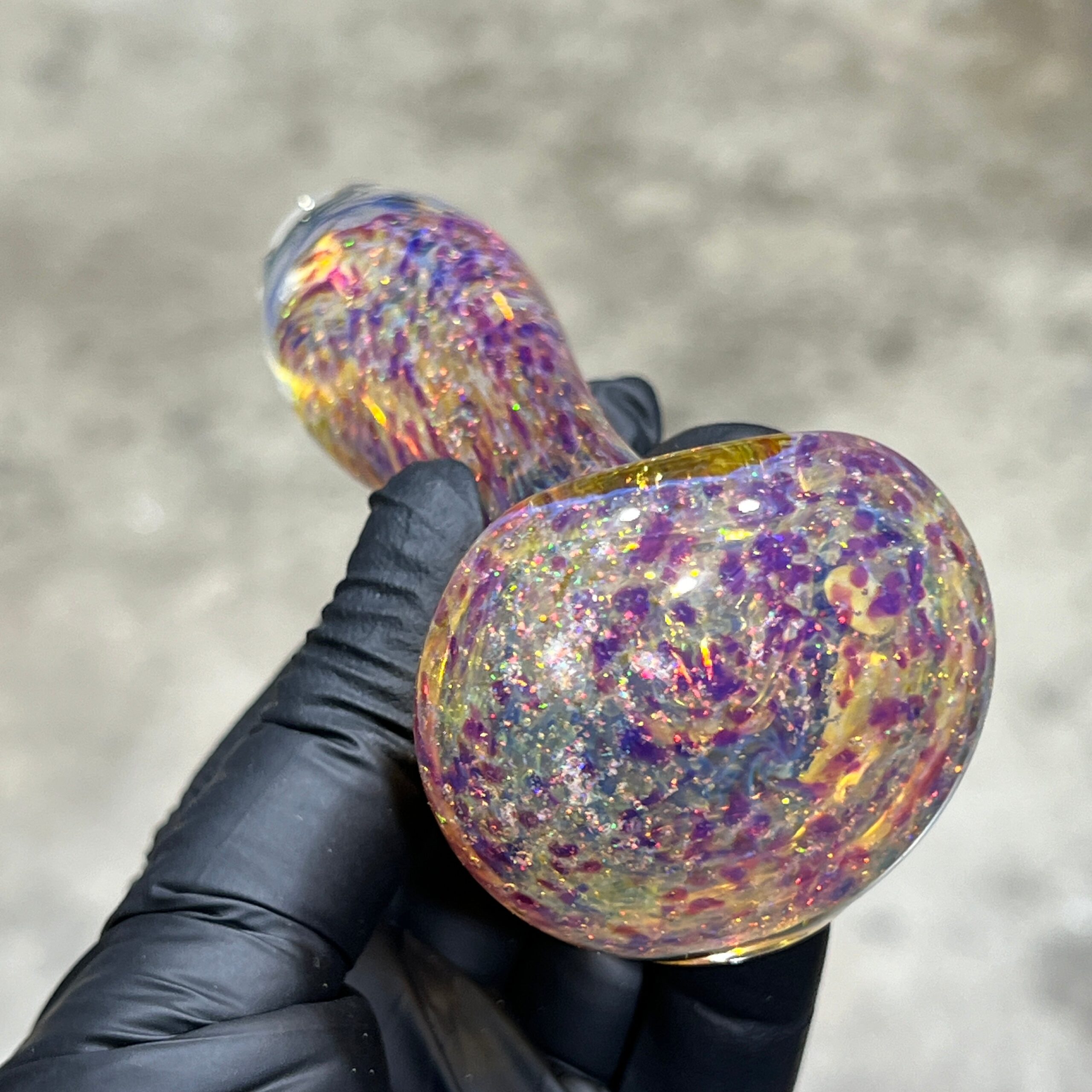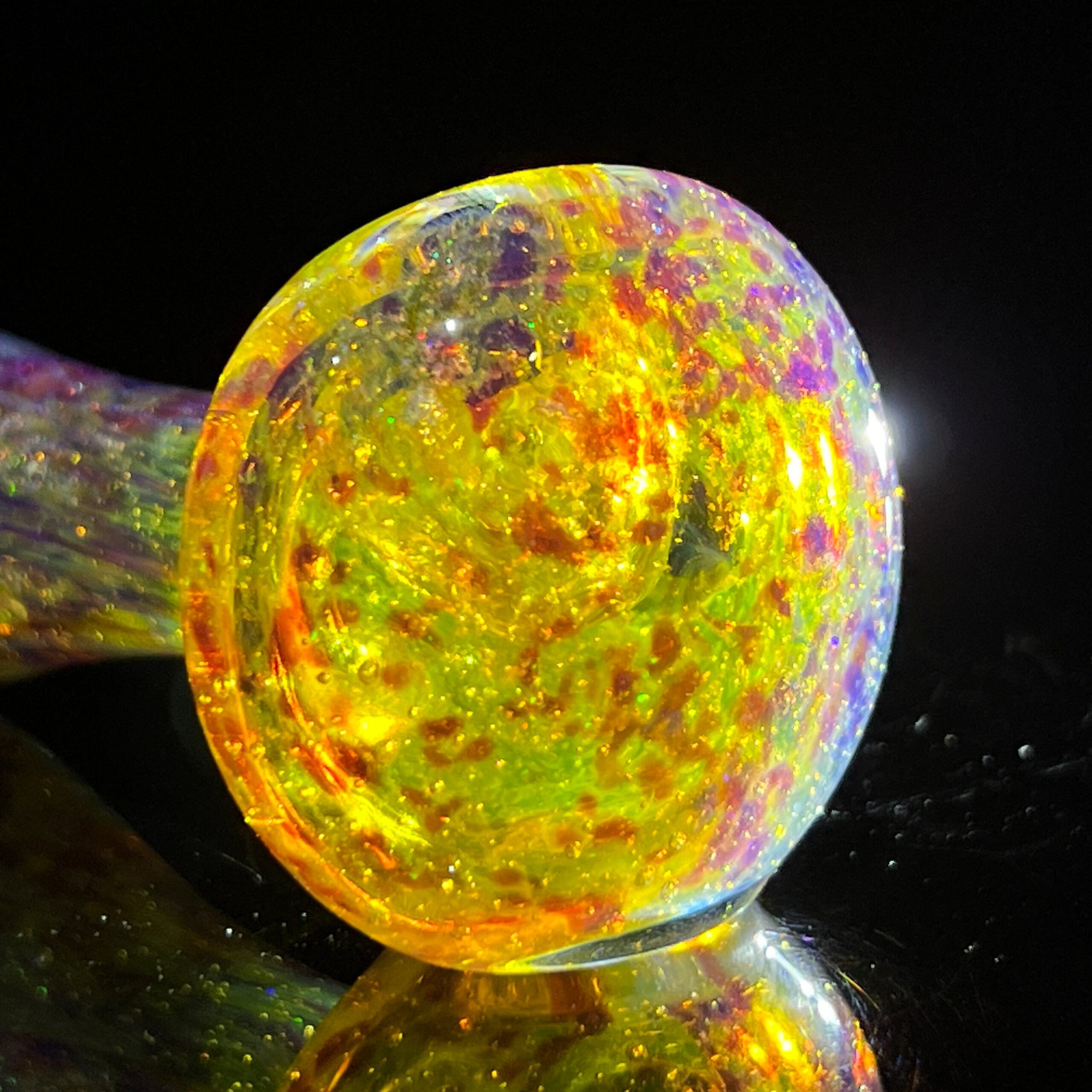Design: Unique, color-changing fume frit with embedded crushed opals creating a “Space Dust” effect and a proprietary “Purple Nebula Ghost” effect.