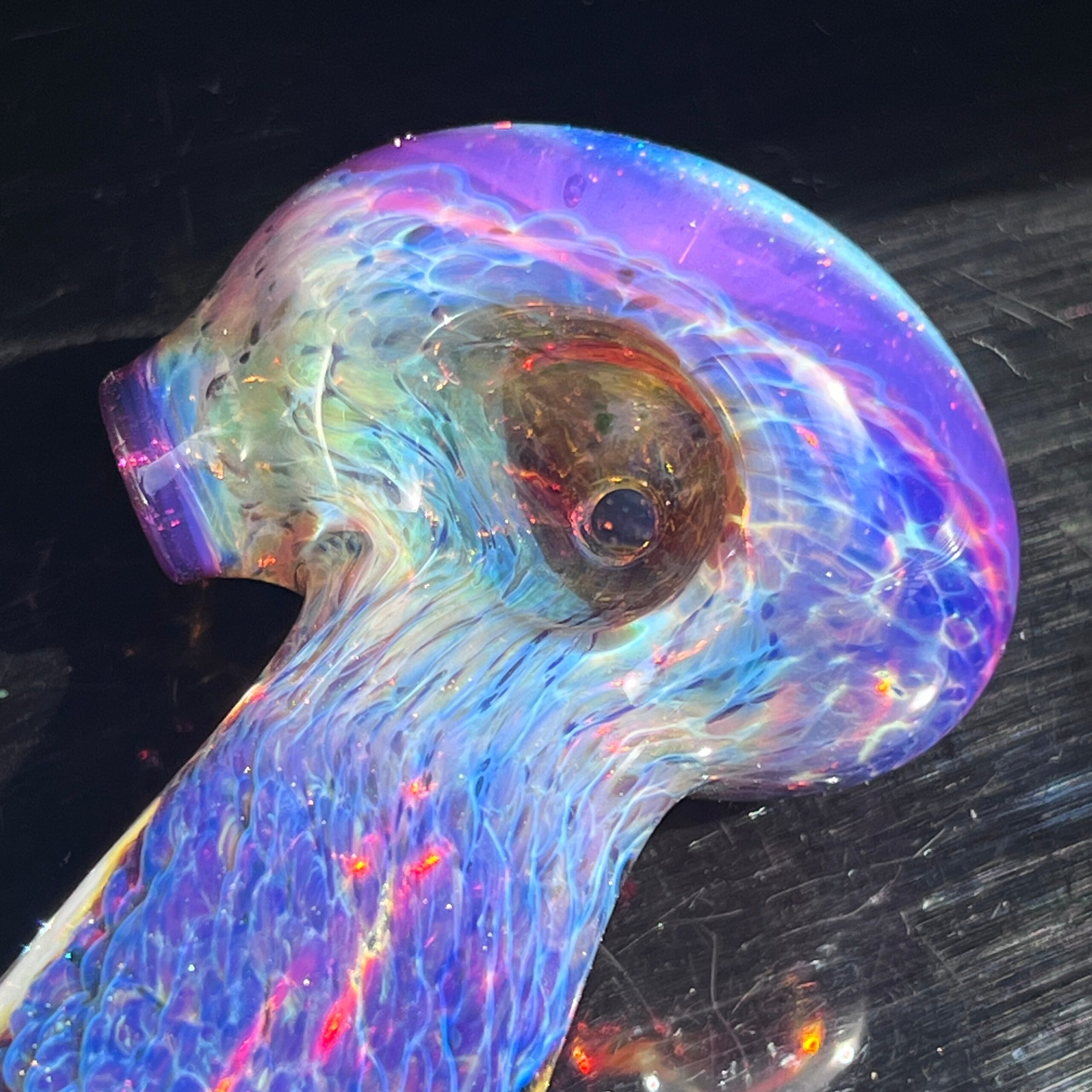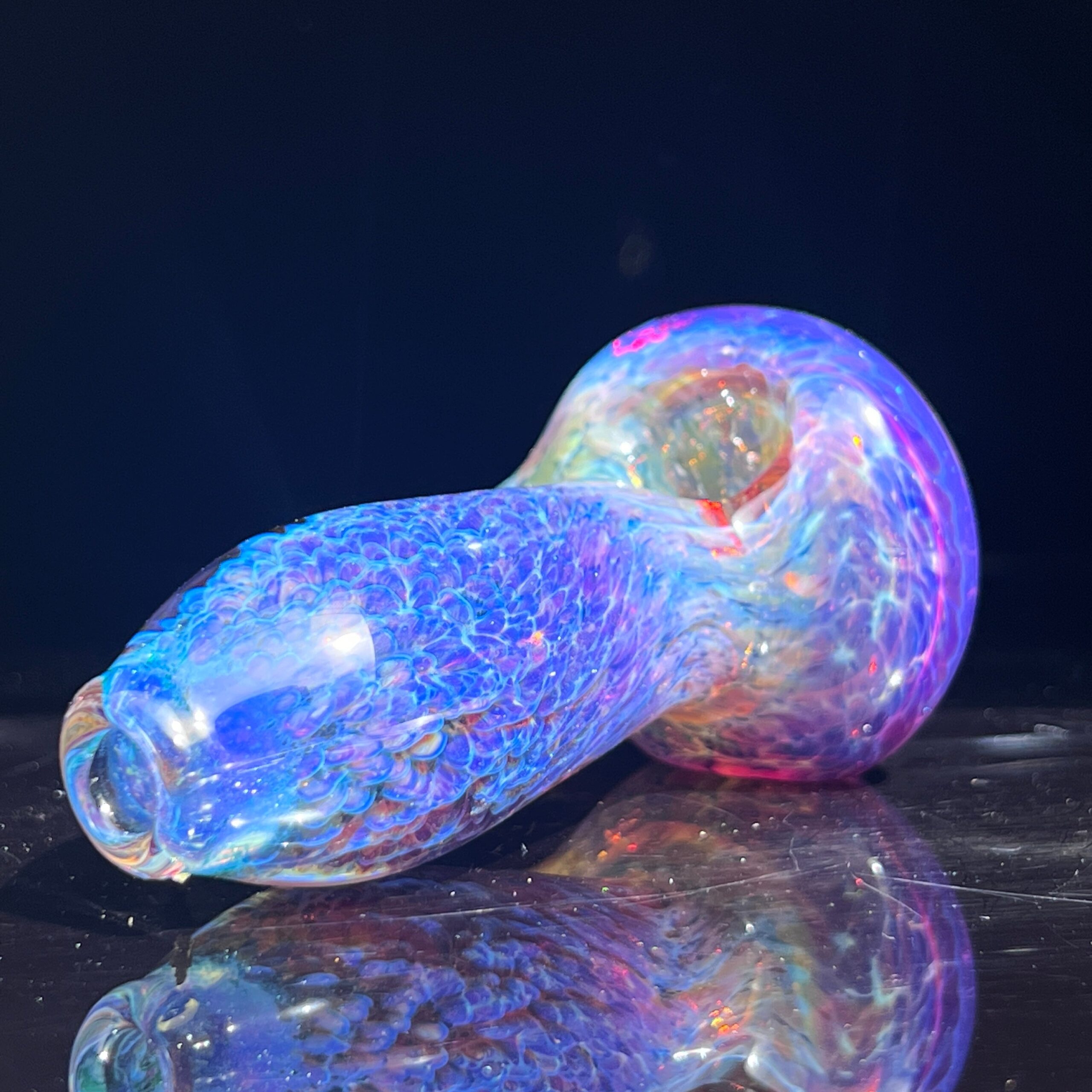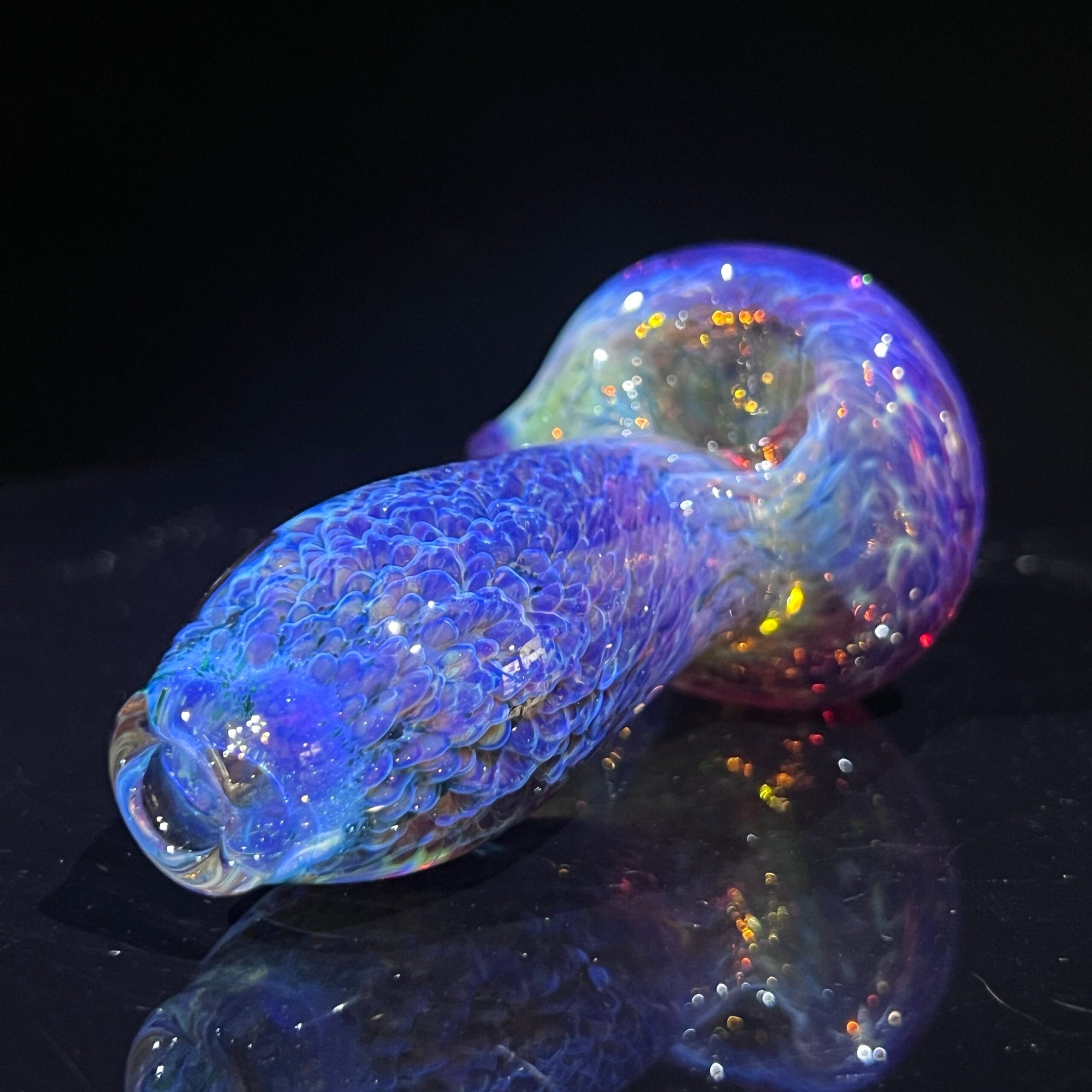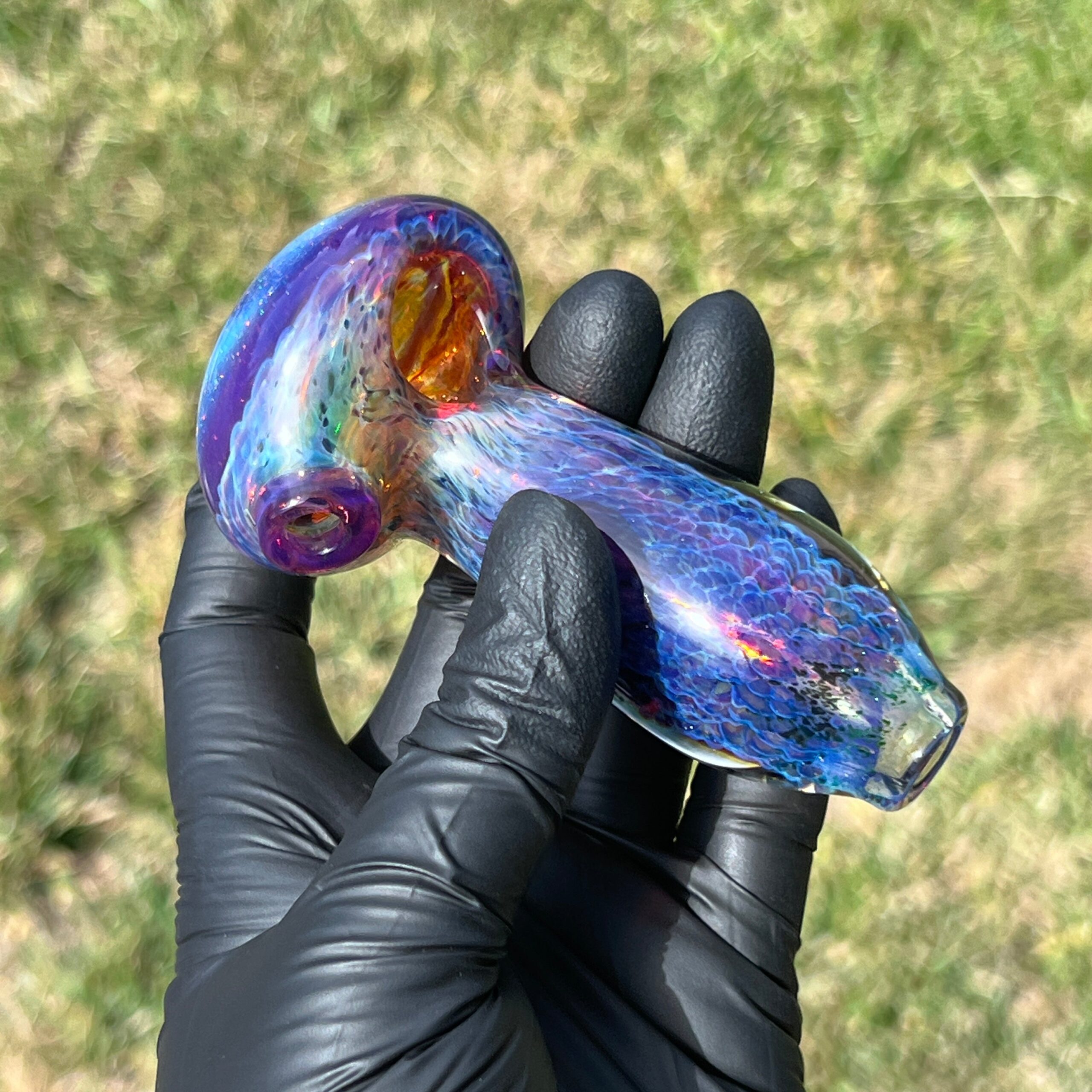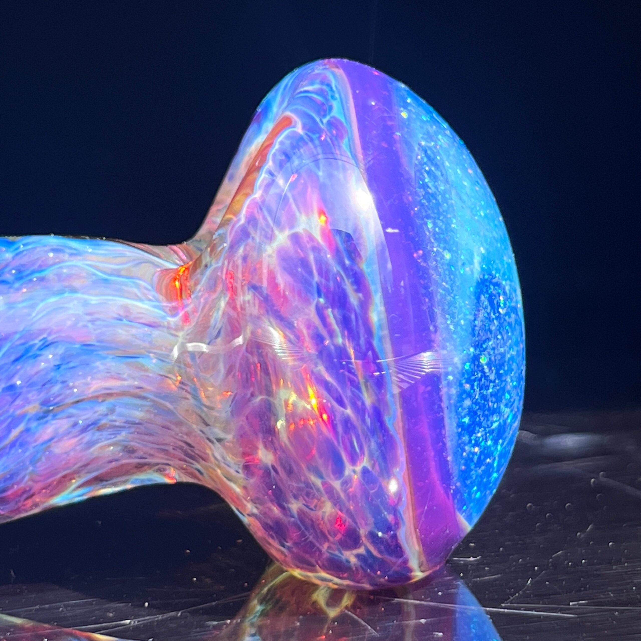 • Fumed Glass Color-Changing Technology: The fumed glass undergoes a unique color-changing process, resulting in a captivating transformation over time. With continued use, the vibrant purple deepens and electric blues emerge, creating a truly personalized and evolving piece.