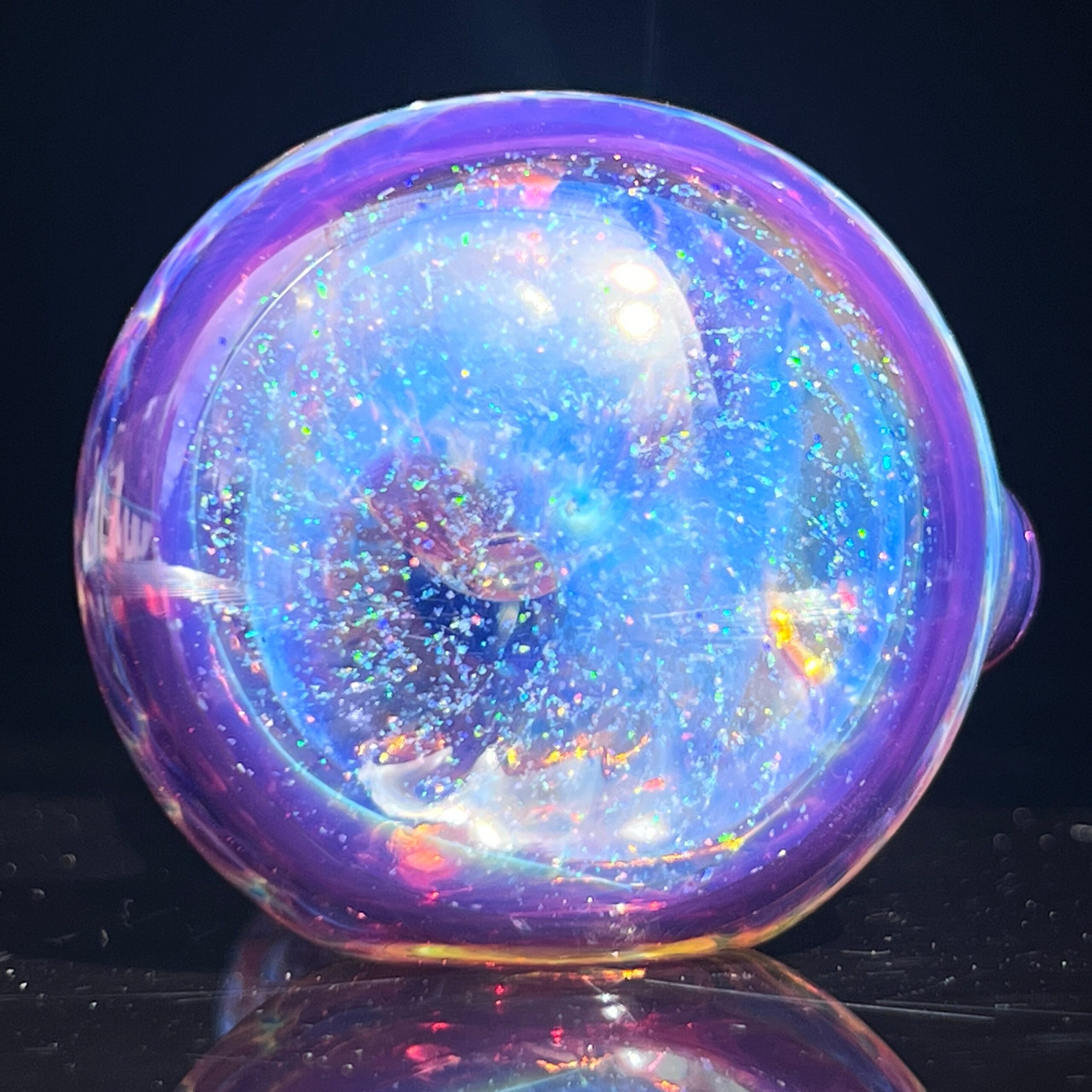 • Crushed Opal Nebula Cap: The pipe’s head is capped with a mesmerizing nebula created using crushed opal. This exquisite detail creates a captivating visual effect, reminiscent of a starlit night sky reflected on water. The unique design ensures that each Megacosm is truly one-of-a-kind.