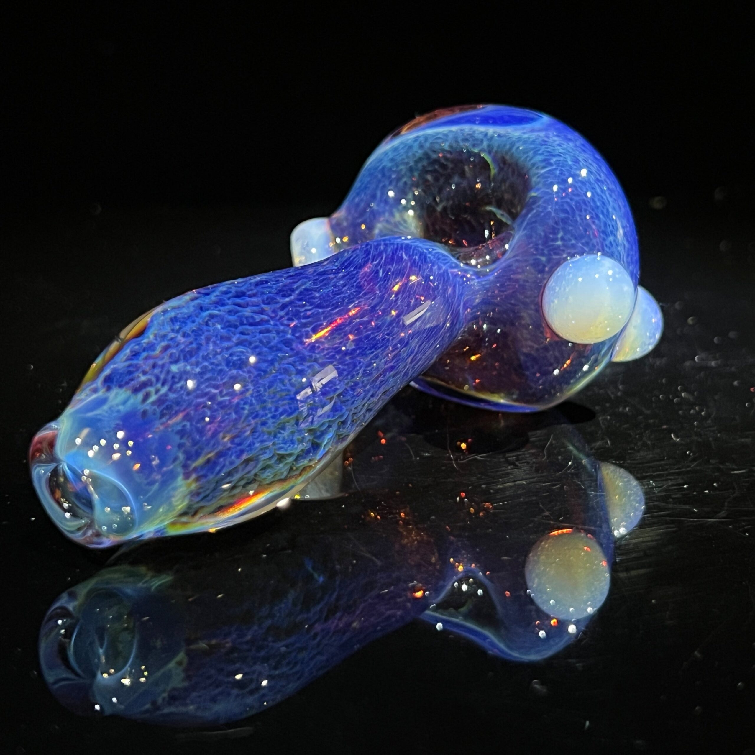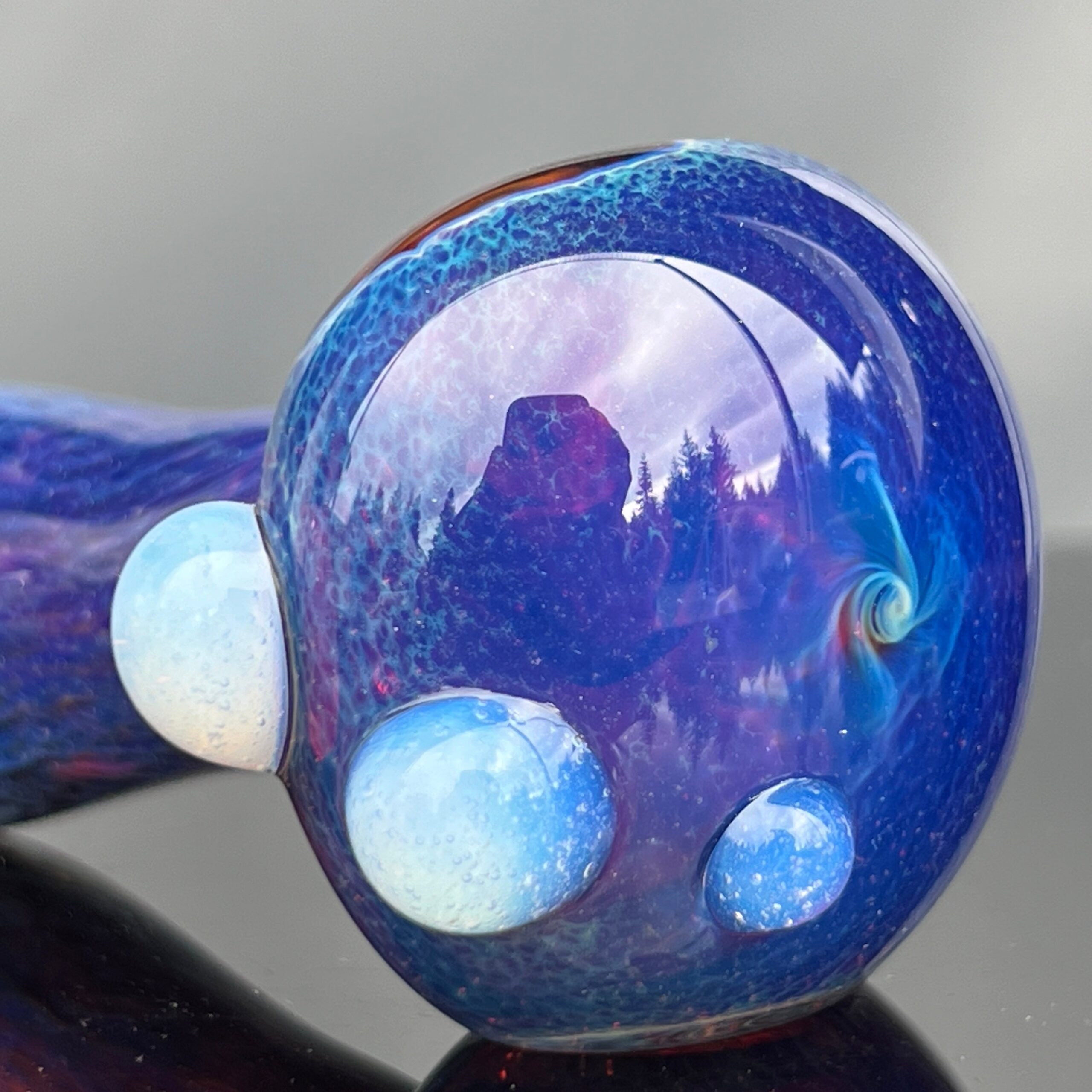 Design: Frit spoon design with integrated reinforced carb, embedded white marbles, and a unique color-changing Purple Nebula design.