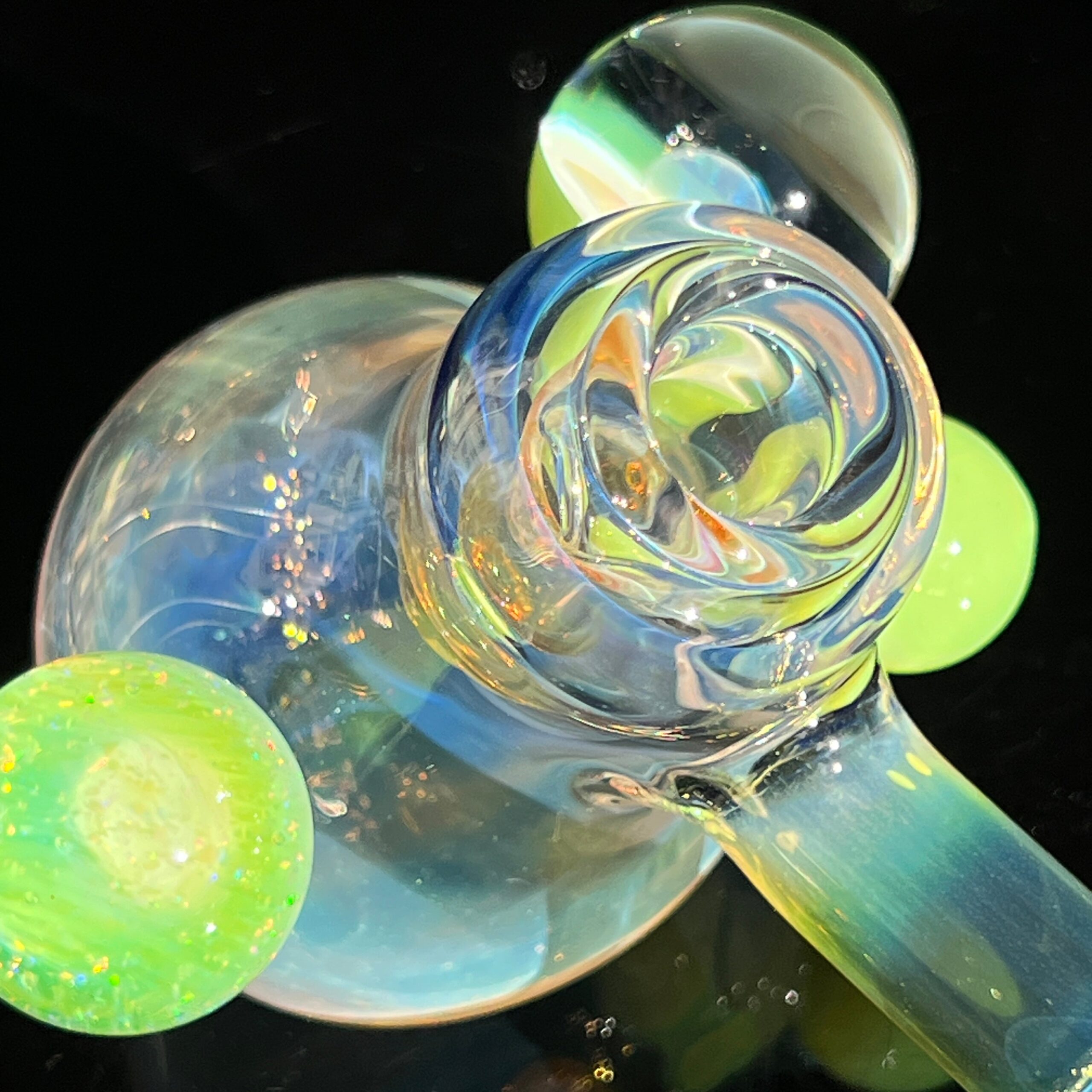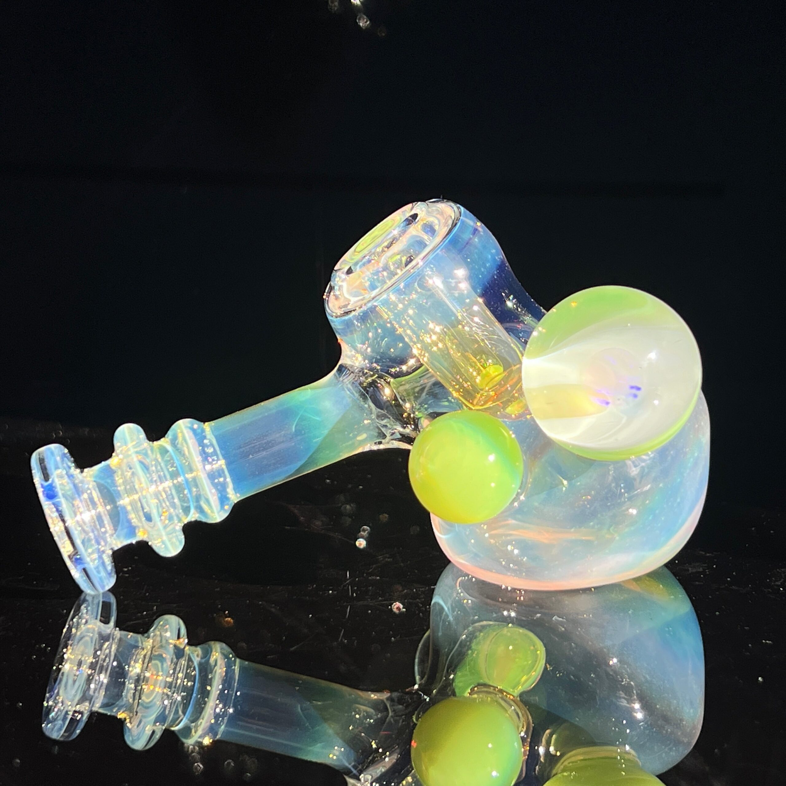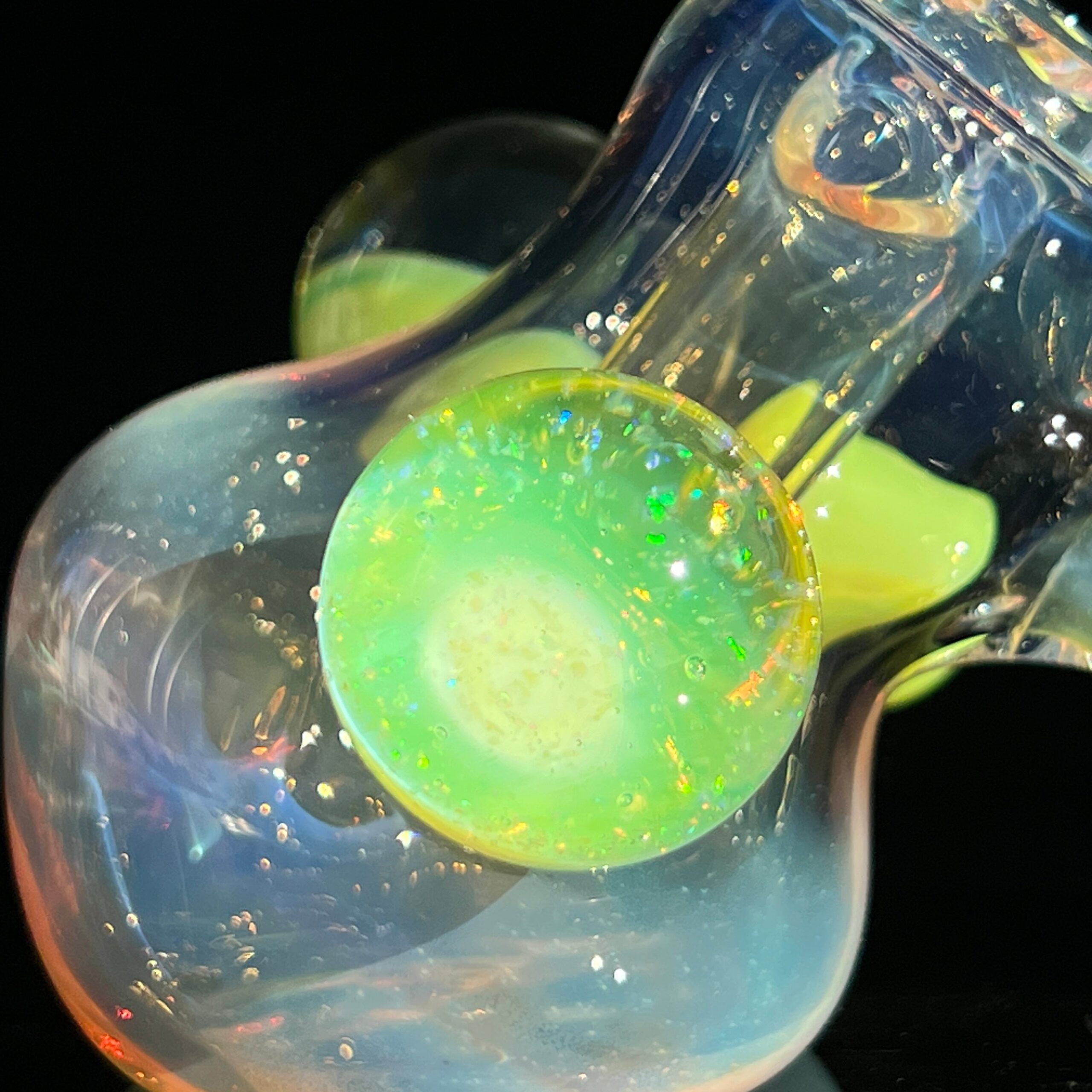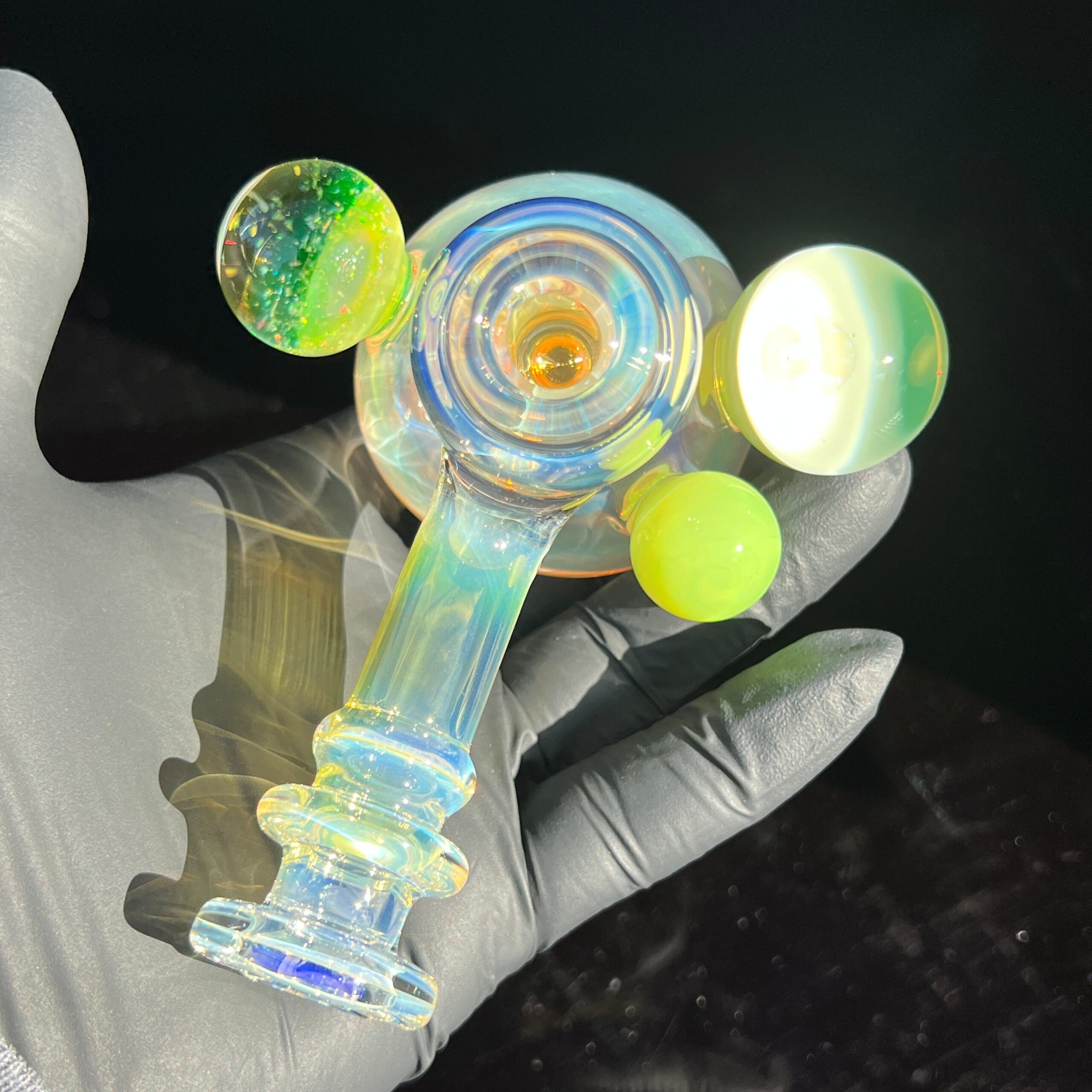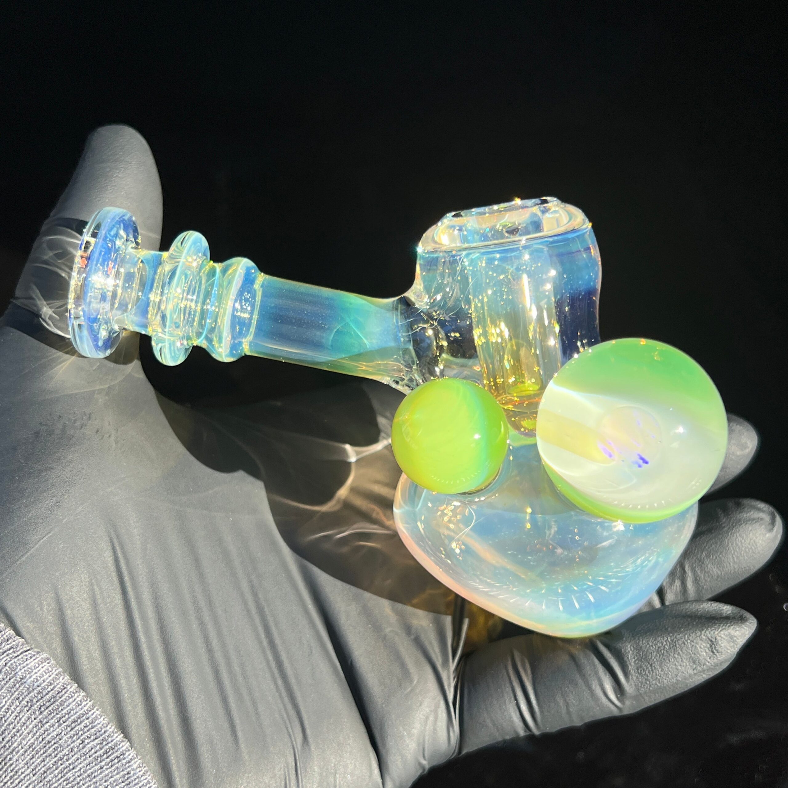 • Slyme Marble Infusion: A ghostly blue-green opal planet marble, slyme marble, and black light reactive marble filled with crushed opals create a truly unique and visually stunning effect. The inclusion of these marbles isn’t just for show; they enhance the overall aesthetic appeal and durability of the piece.