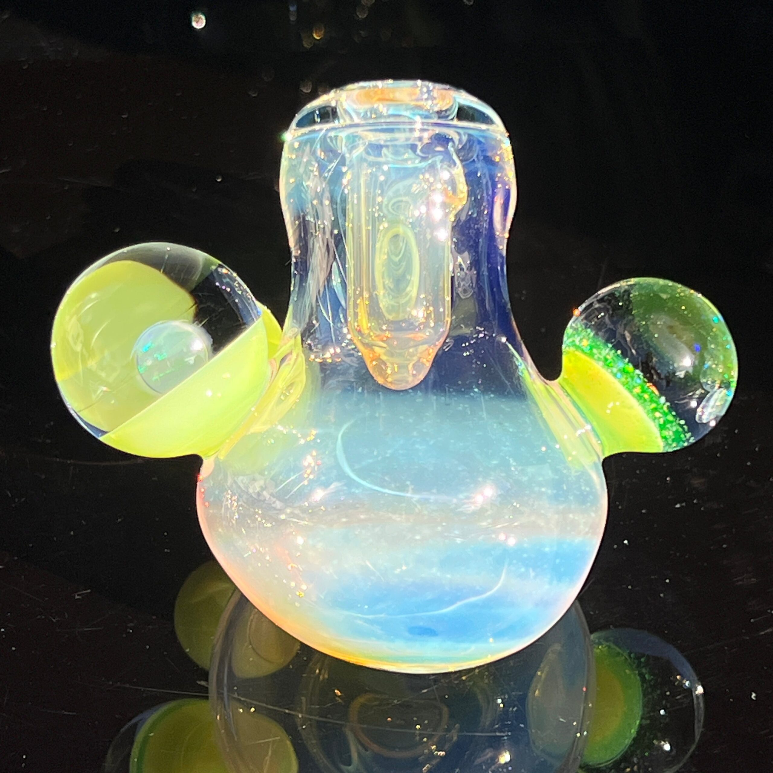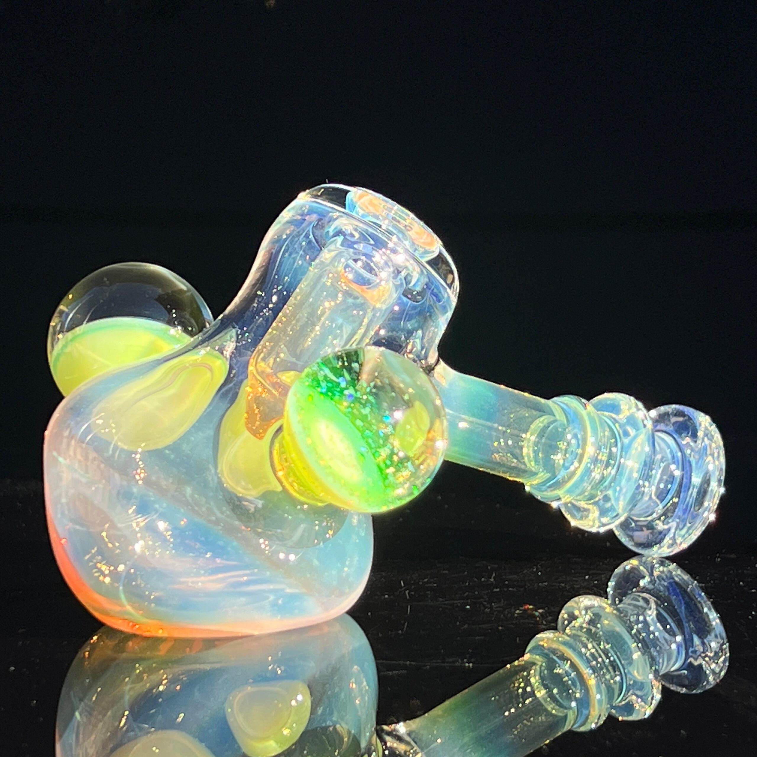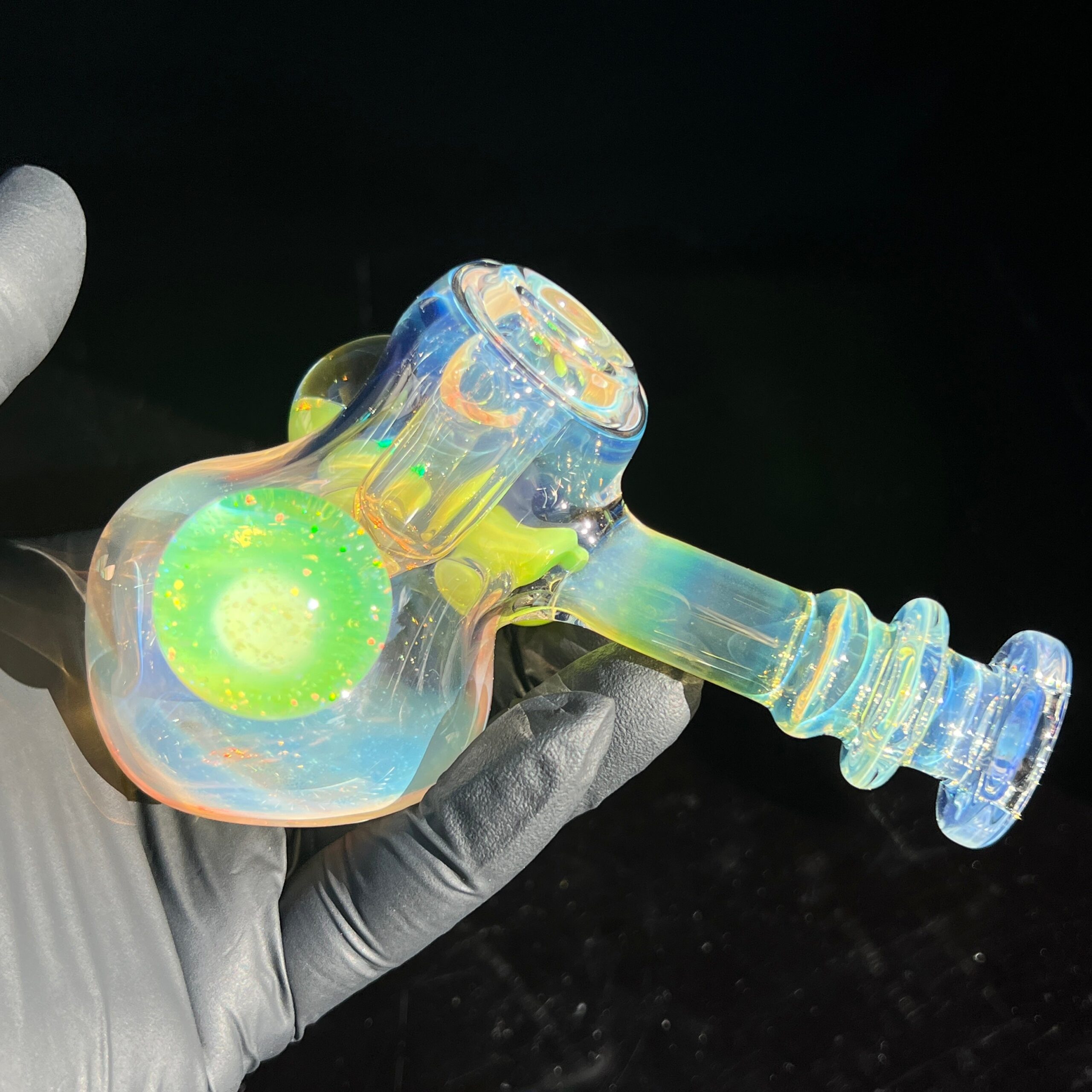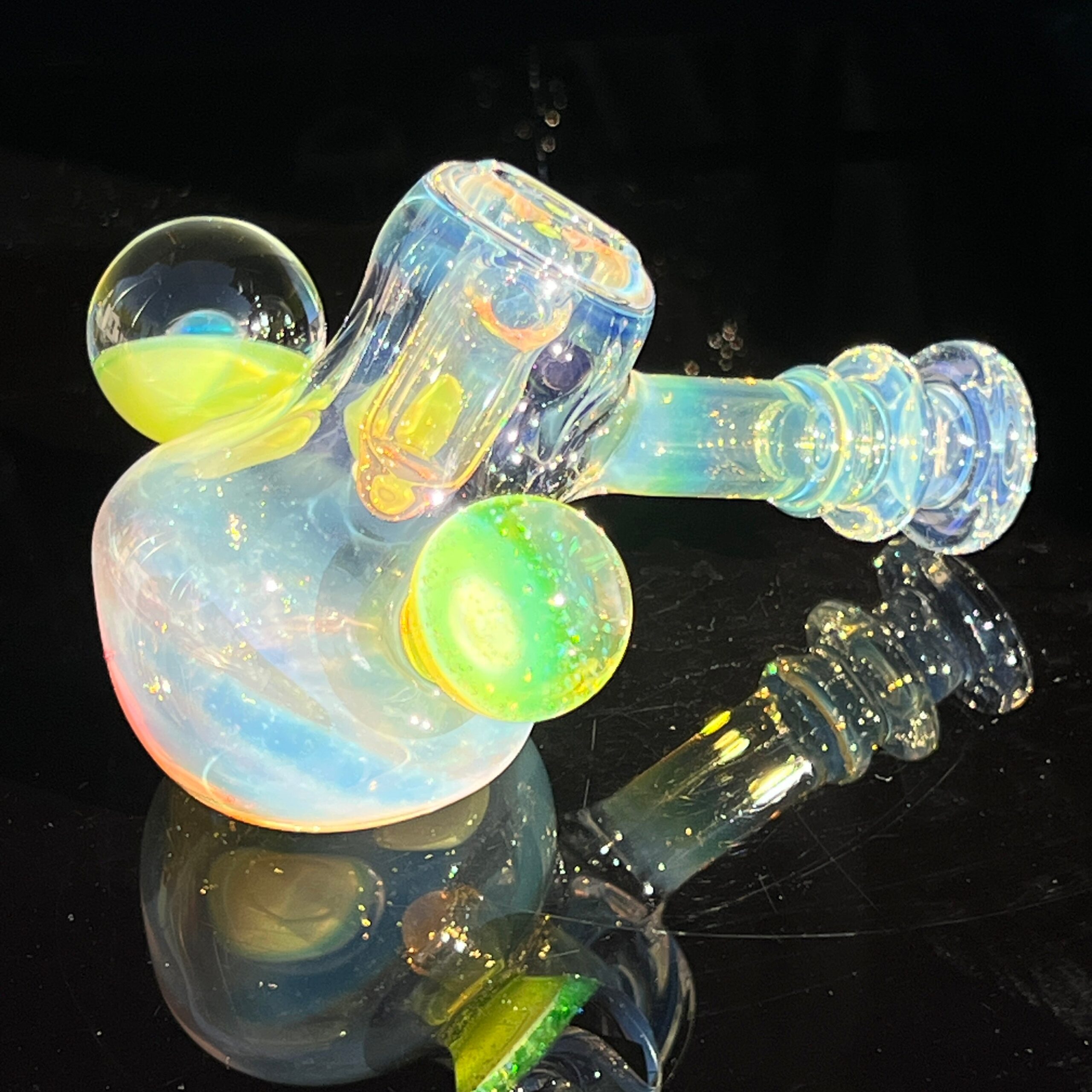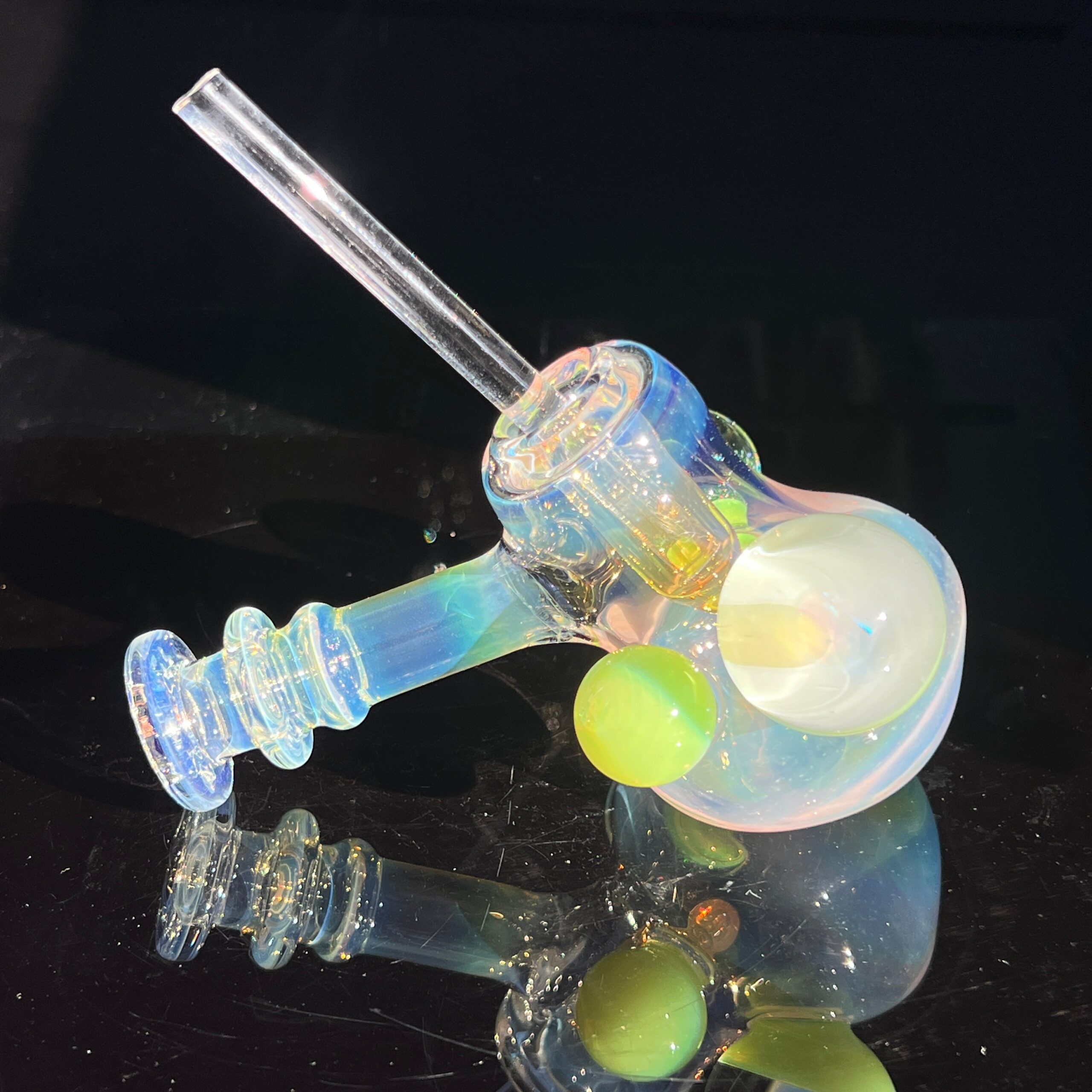 • Slyme Marble Infusion: A ghostly blue-green opal planet marble, slyme marble, and black light reactive marble filled with crushed opals create a truly unique and visually stunning effect. The inclusion of these marbles isn’t just for show; they enhance the overall aesthetic appeal and durability of the piece.