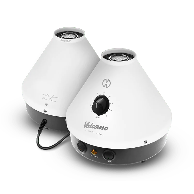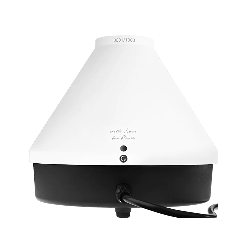 The Storz & Bickel Classic Volcano with Easy Valve Starter Set Peace Edition features a matte white cone with black switches, beautifully engraved with calligraphy saying “with love for peace.” The device also includes engraved logos and a unique device number. As an added bonus, a “With love for peace” t-shirt is included with each purchase.