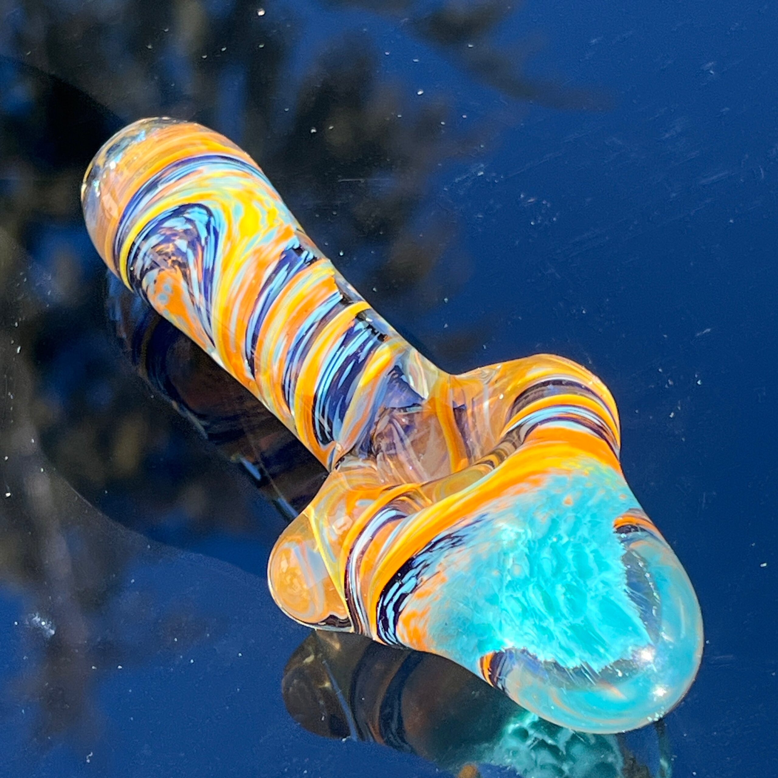 - Vibrant Color Palette: Dominated by vibrant orange, blue, and yellow hues, the Tropical Surge pipe offers a stunning visual display. However, upon closer inspection, you’ll uncover a rainbow of colors hidden within the crystal-clear glass.
