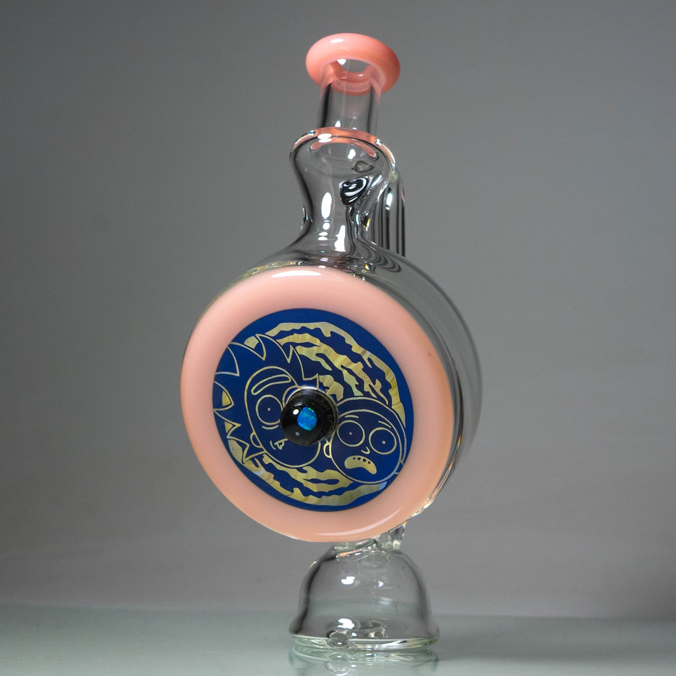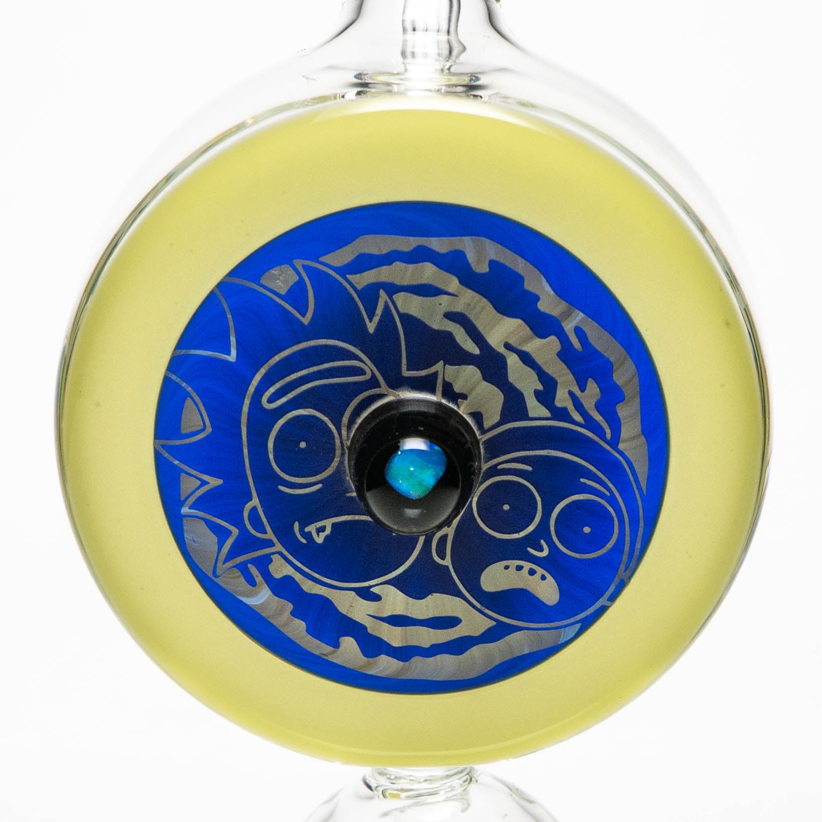 Design: Handcrafted coldworked glass with a Rick & Morty CFL Yoshi design and opal accents.