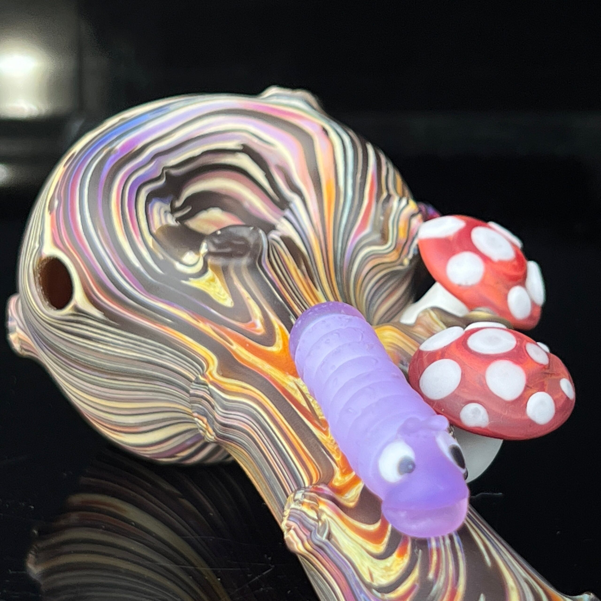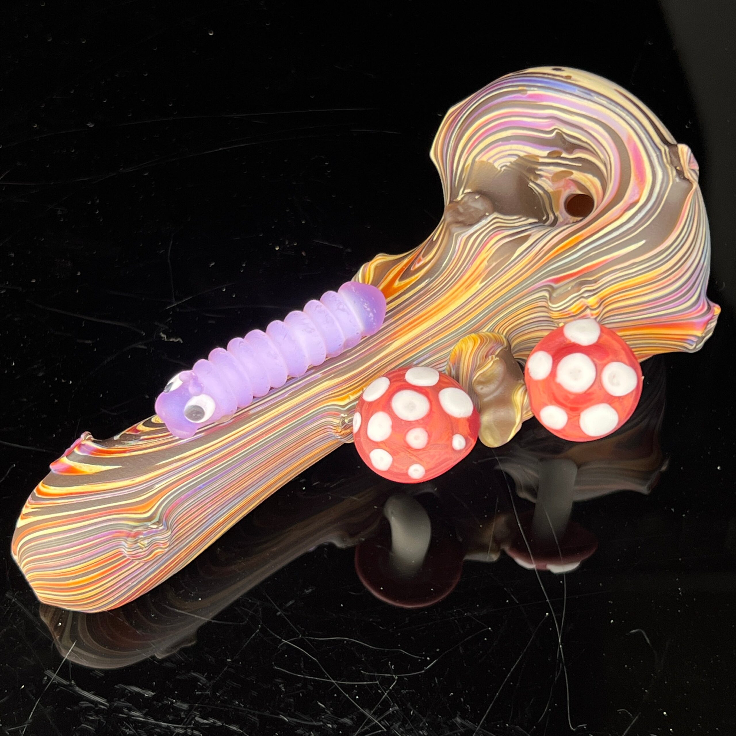 Design: Unique caterpillar-inspired shape, intricately detailed wood grain, mushroom-cap design.