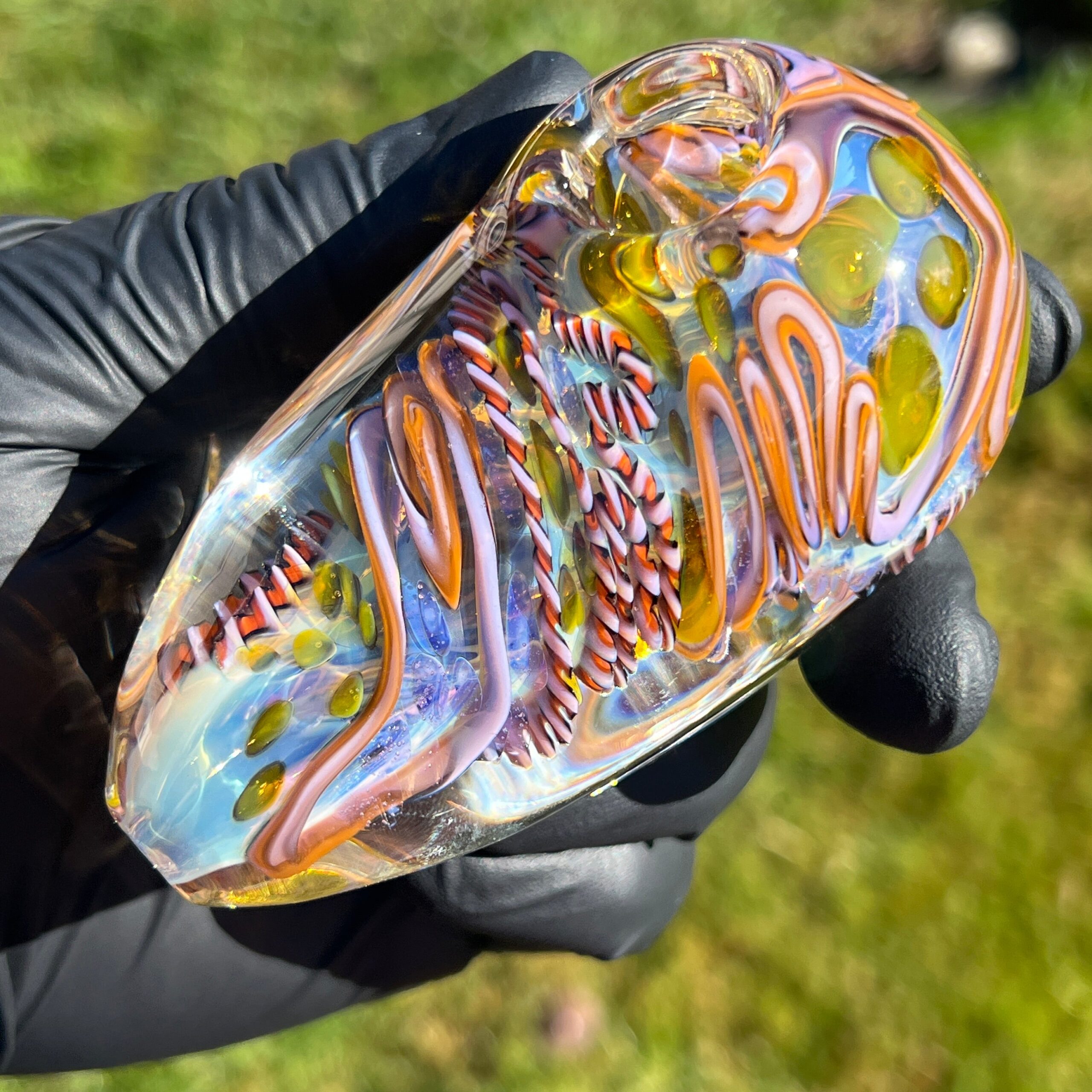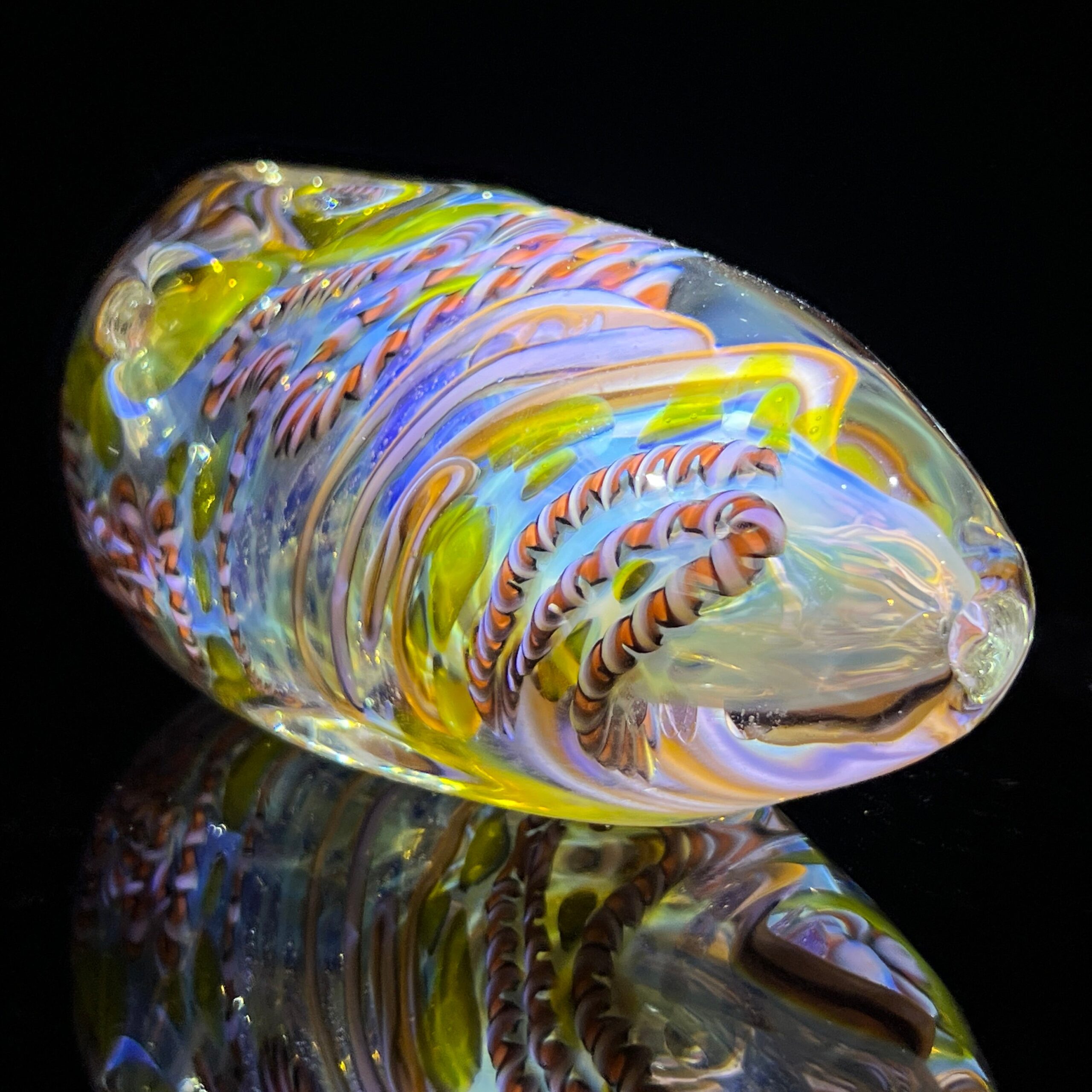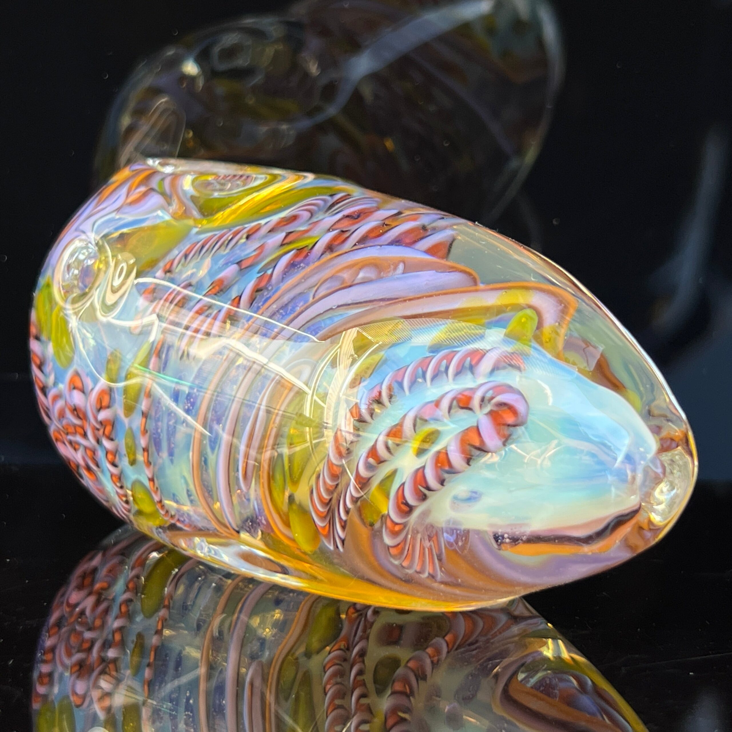 • Inside-Out Cane Work/Latticinios and Stringers: This intricate design, inspired by classic inside-out pipes, creates a mesmerizing visual spectacle. The twisting, multicolored canes (latticini – a twisty cane containing 2 or more colors) and stringers trap light, showcasing a vibrant, ever-shifting display of color. This not only looks stunning but also enhances the overall vaping experience.