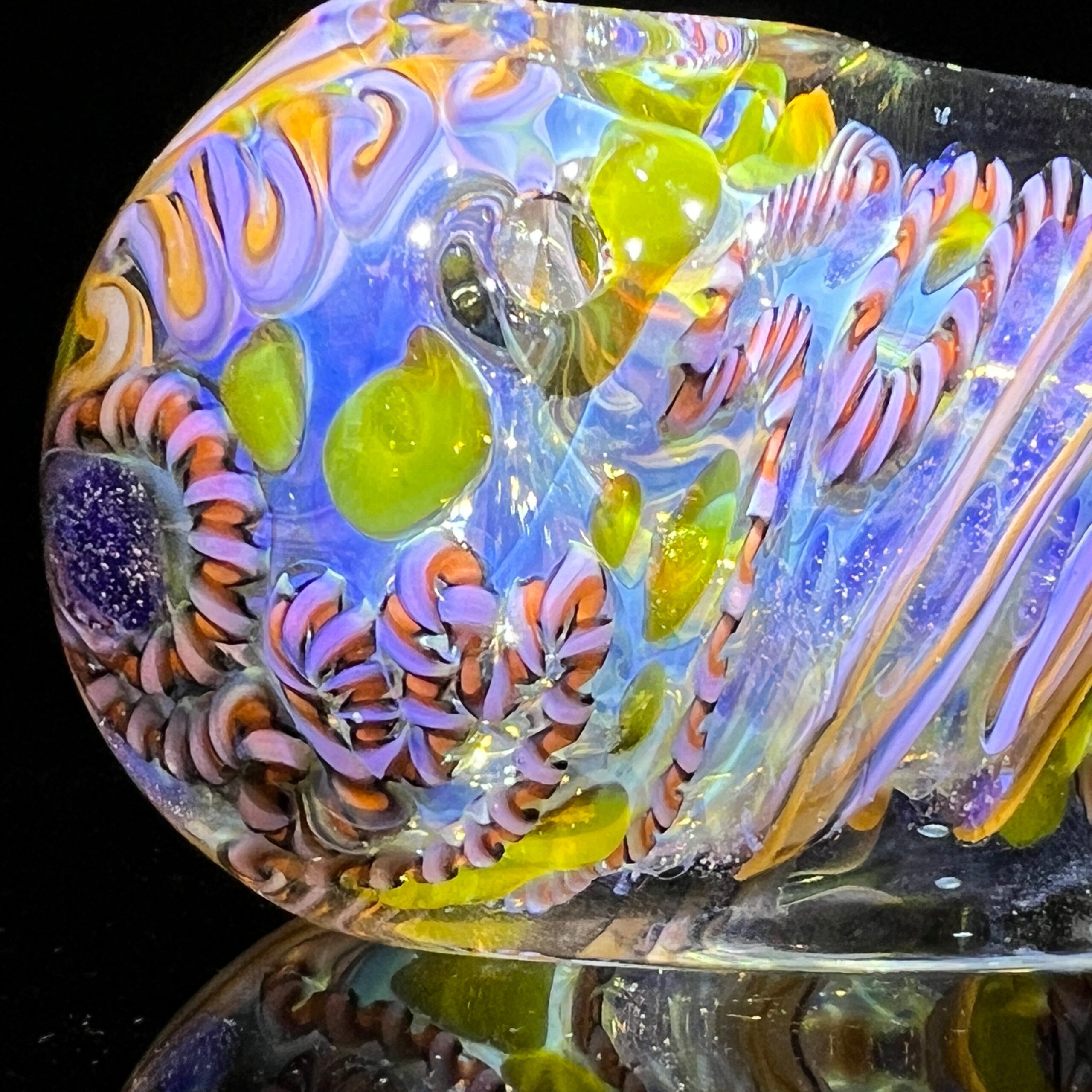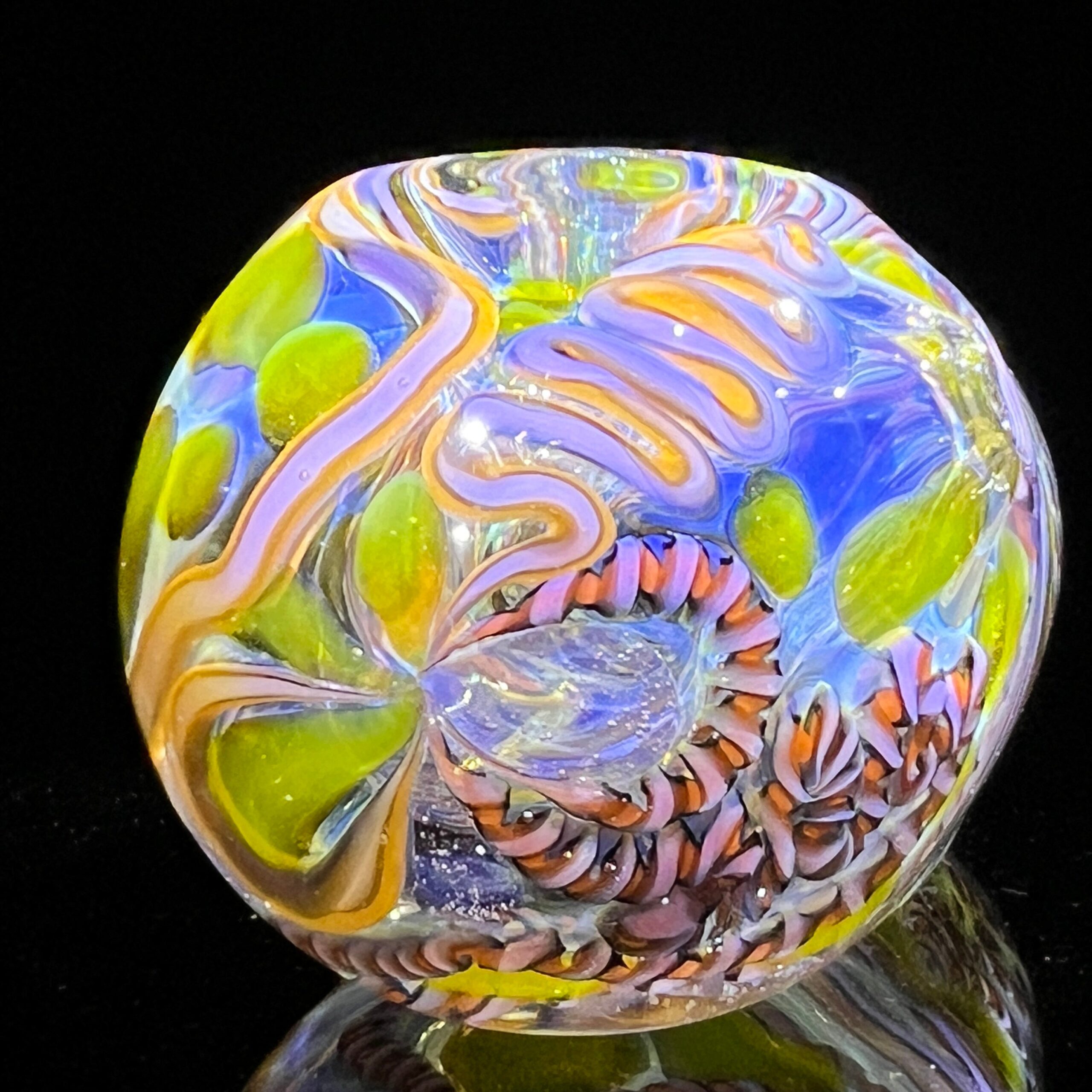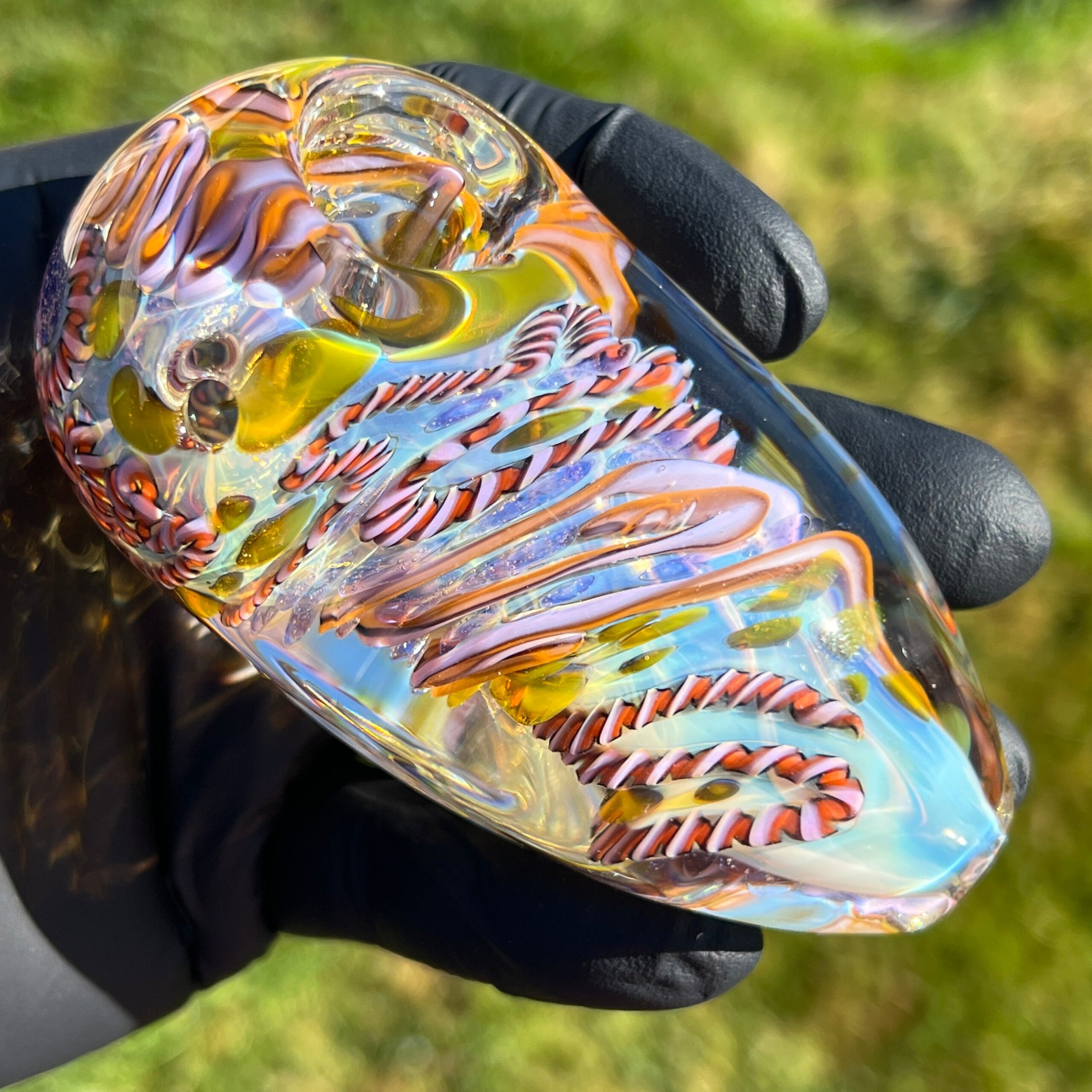 • Inside-Out Cane Work/Latticinios and Stringers: This intricate design, inspired by classic inside-out pipes, creates a mesmerizing visual spectacle. The twisting, multicolored canes (latticini – a twisty cane containing 2 or more colors) and stringers trap light, showcasing a vibrant, ever-shifting display of color. This not only looks stunning but also enhances the overall vaping experience.