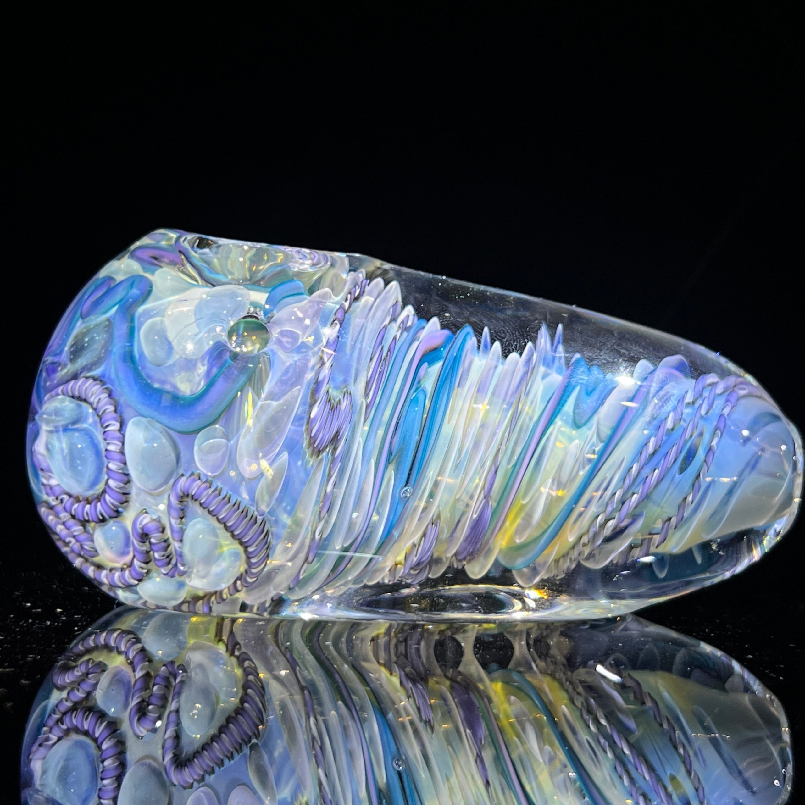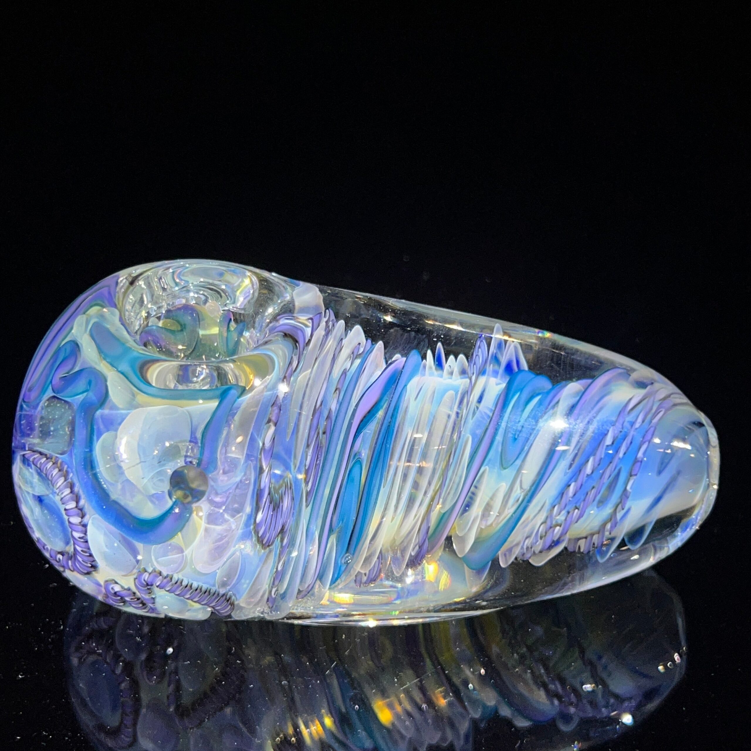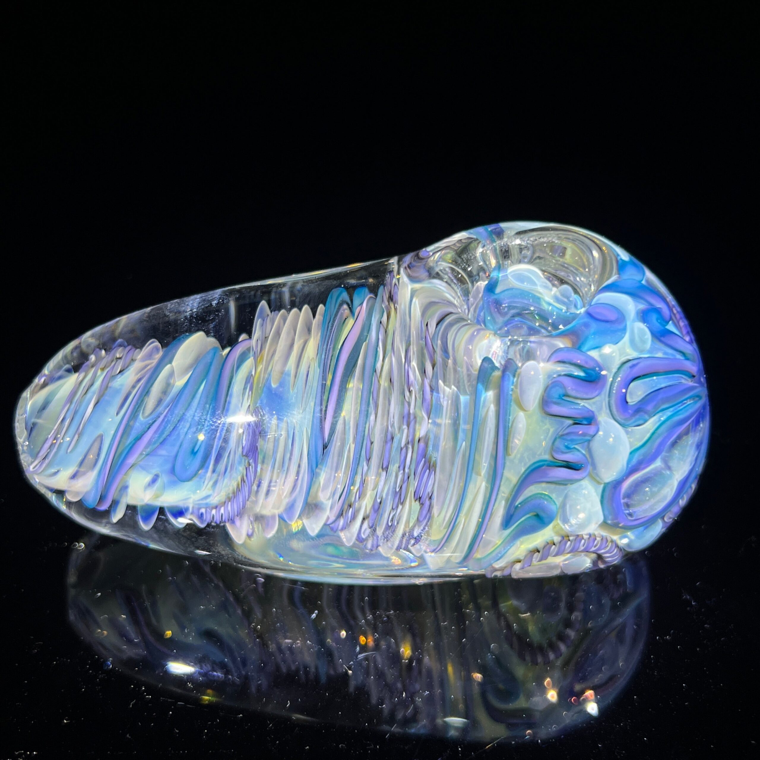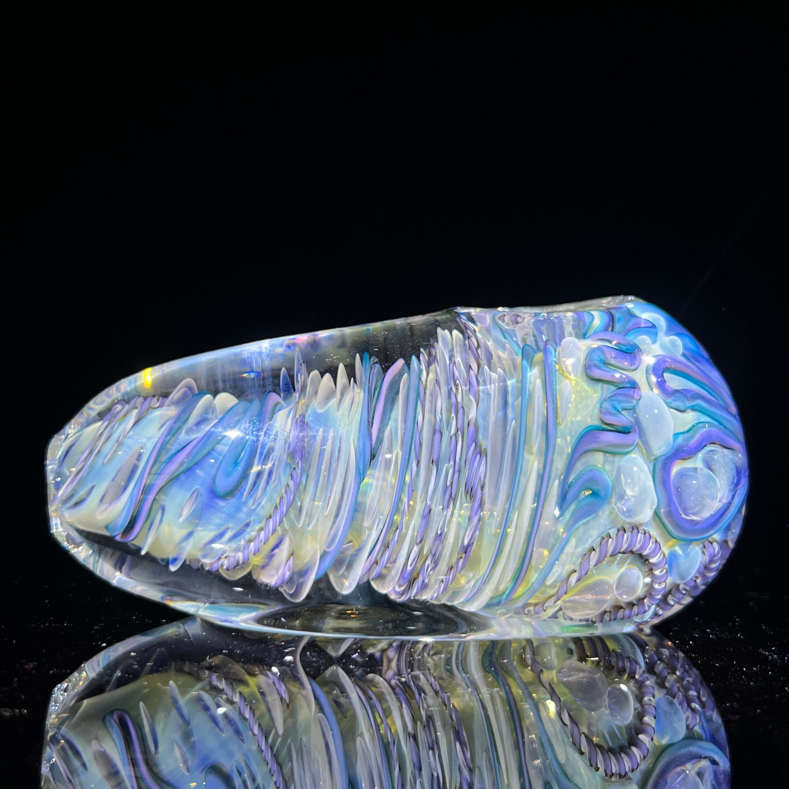 • Inside-Out Cane Work/Latticinios & Stringers: The vibrant, swirling colors aren’t just for show. This intricate design, featuring twisted canes containing multiple colors (latticinios), creates a visually stunning and mesmerizing effect, enhancing the overall vaping experience. The unique pattern also contributes to the spoon’s exceptional durability.