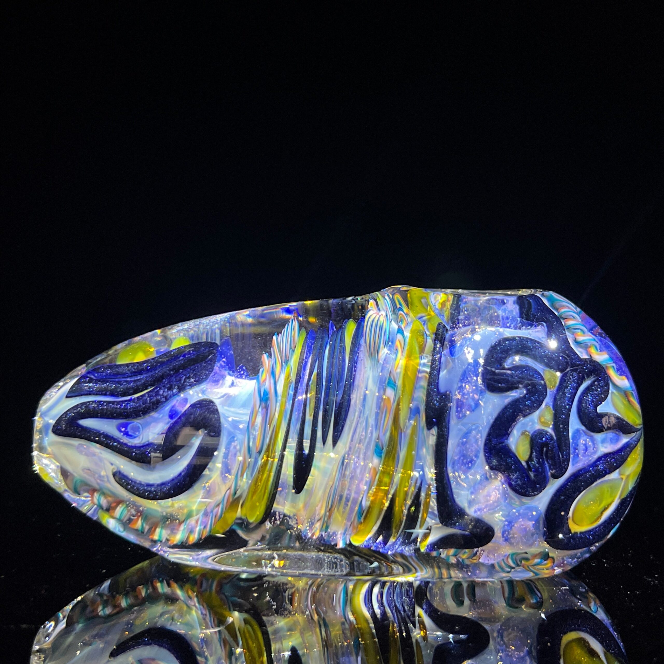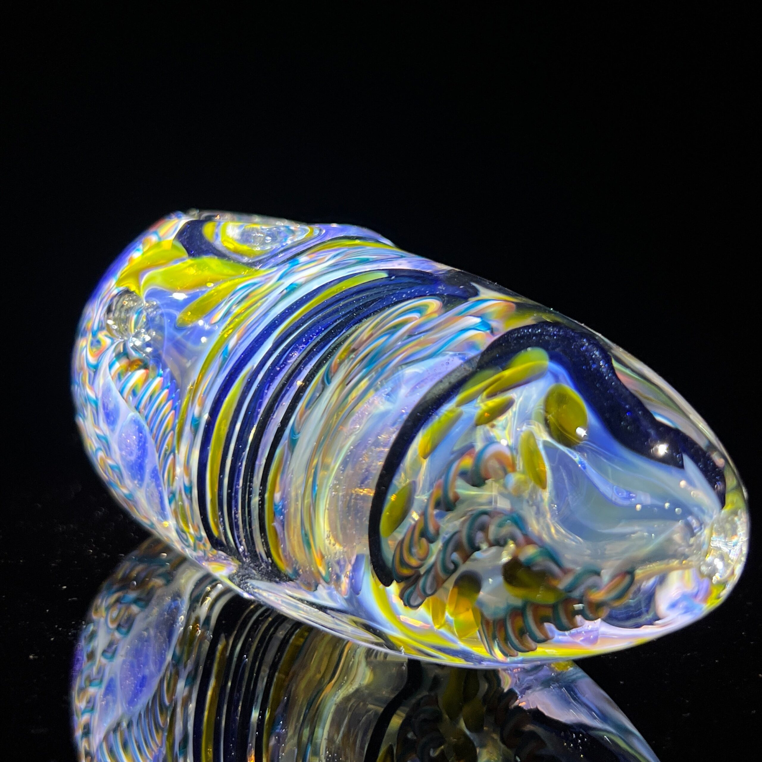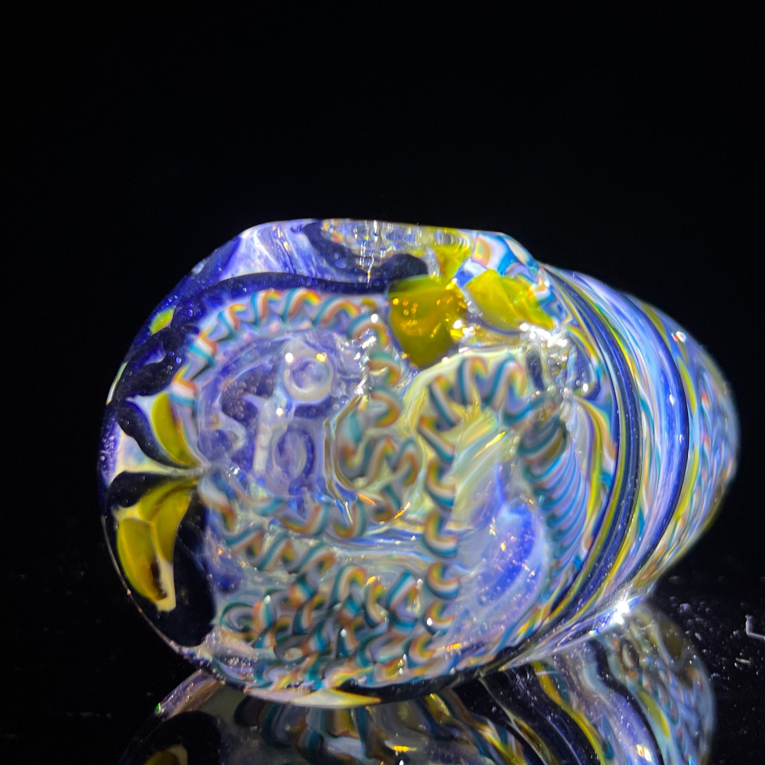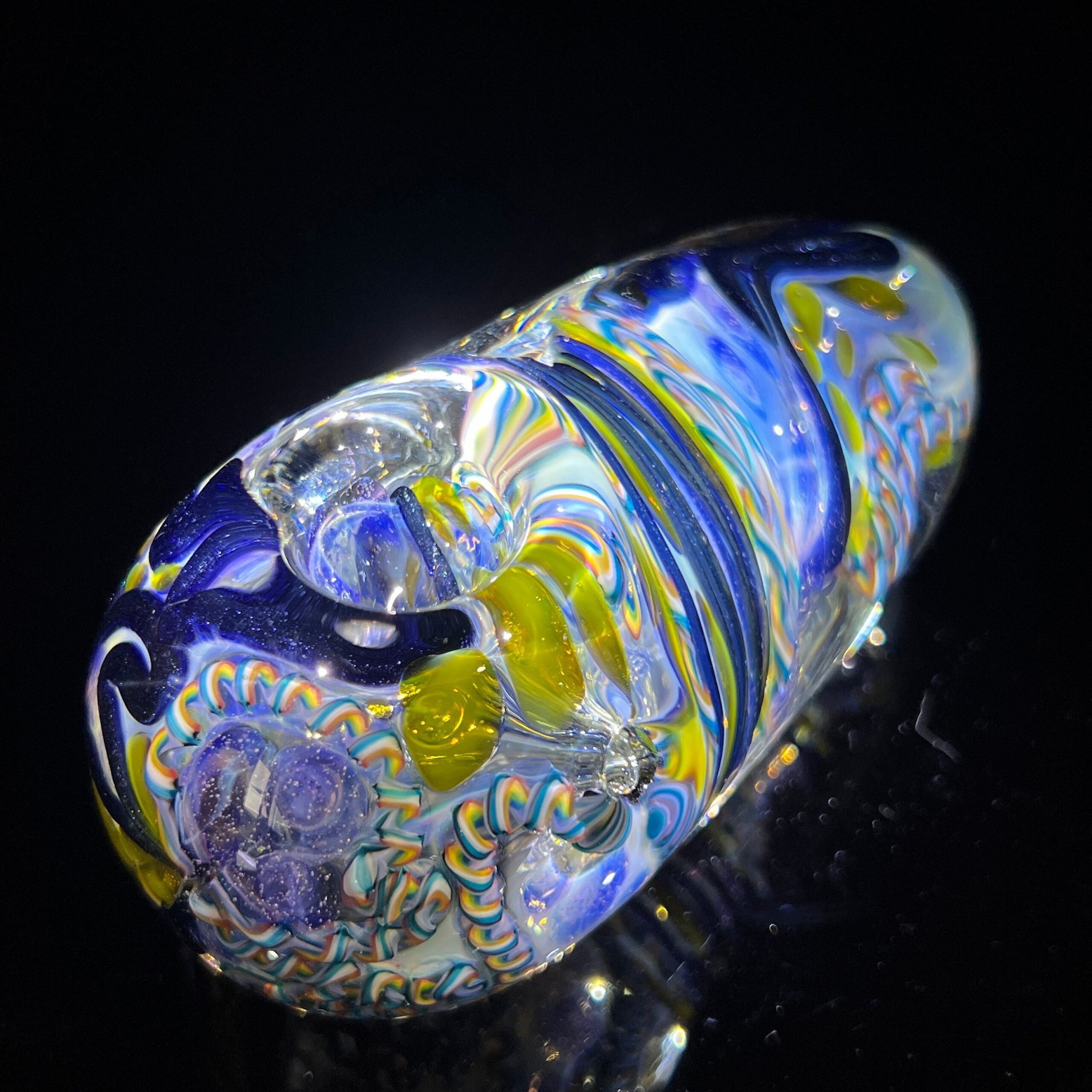 Design: Intricate inside-out cane work/latticinios and stringers, ergonomic egg shape, flat bottom