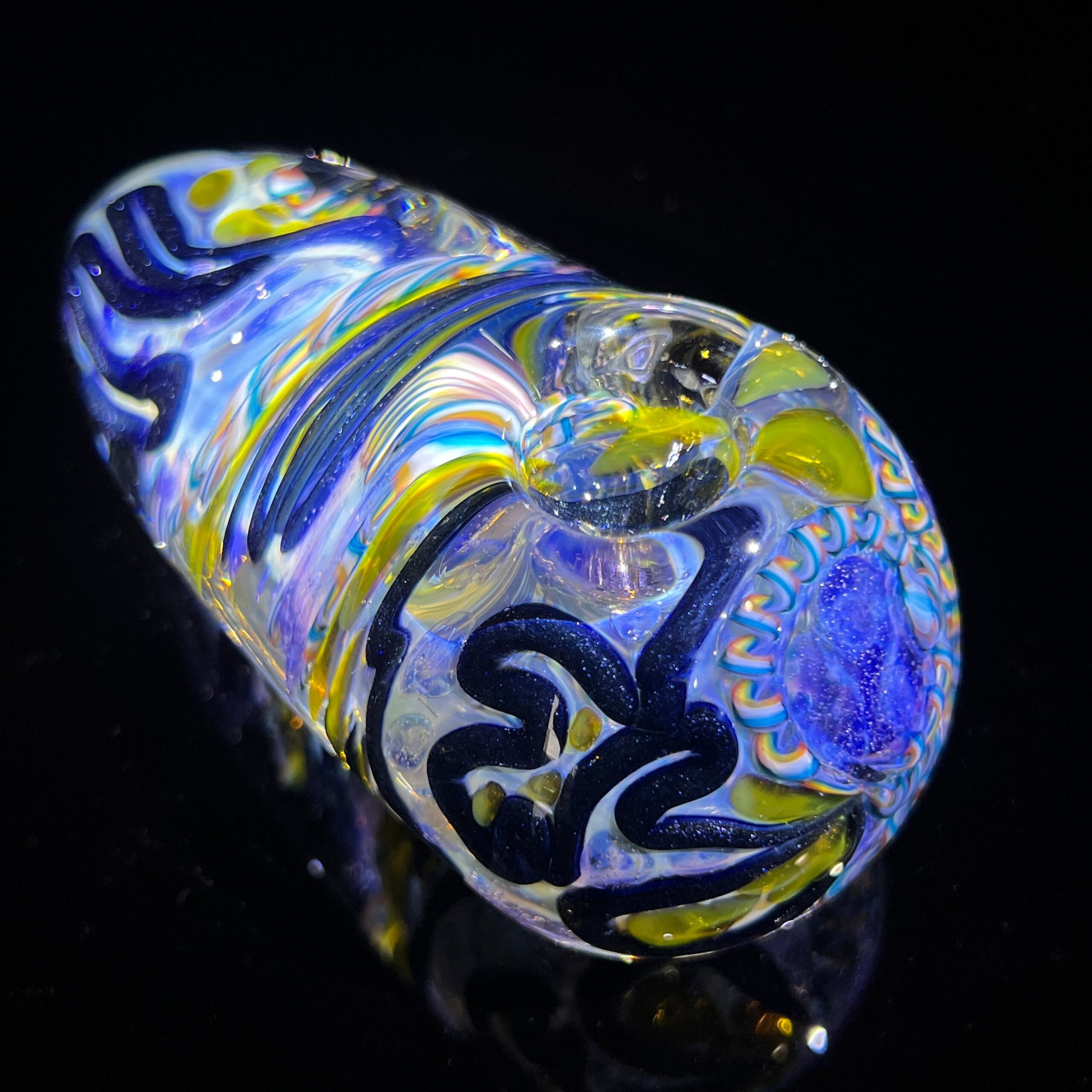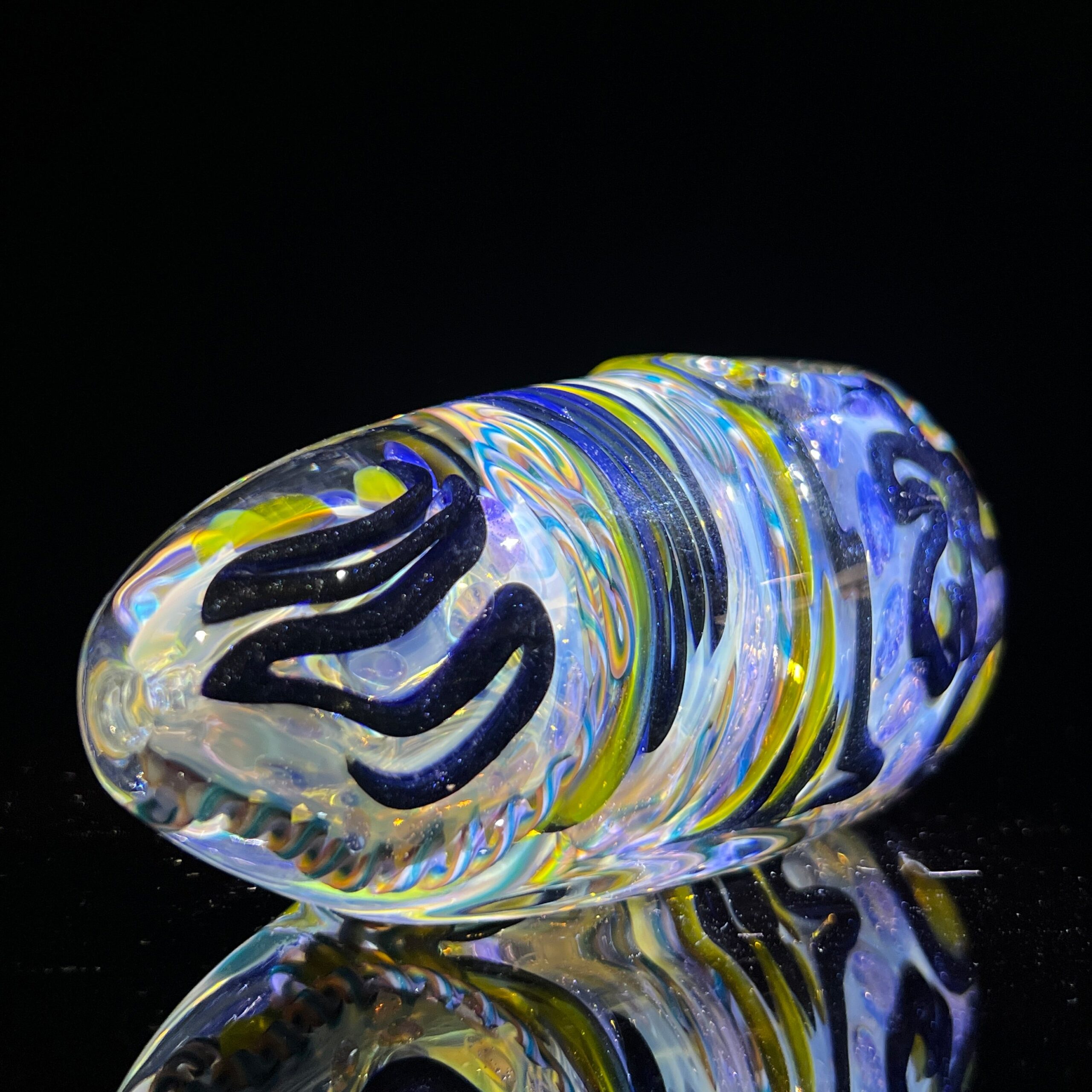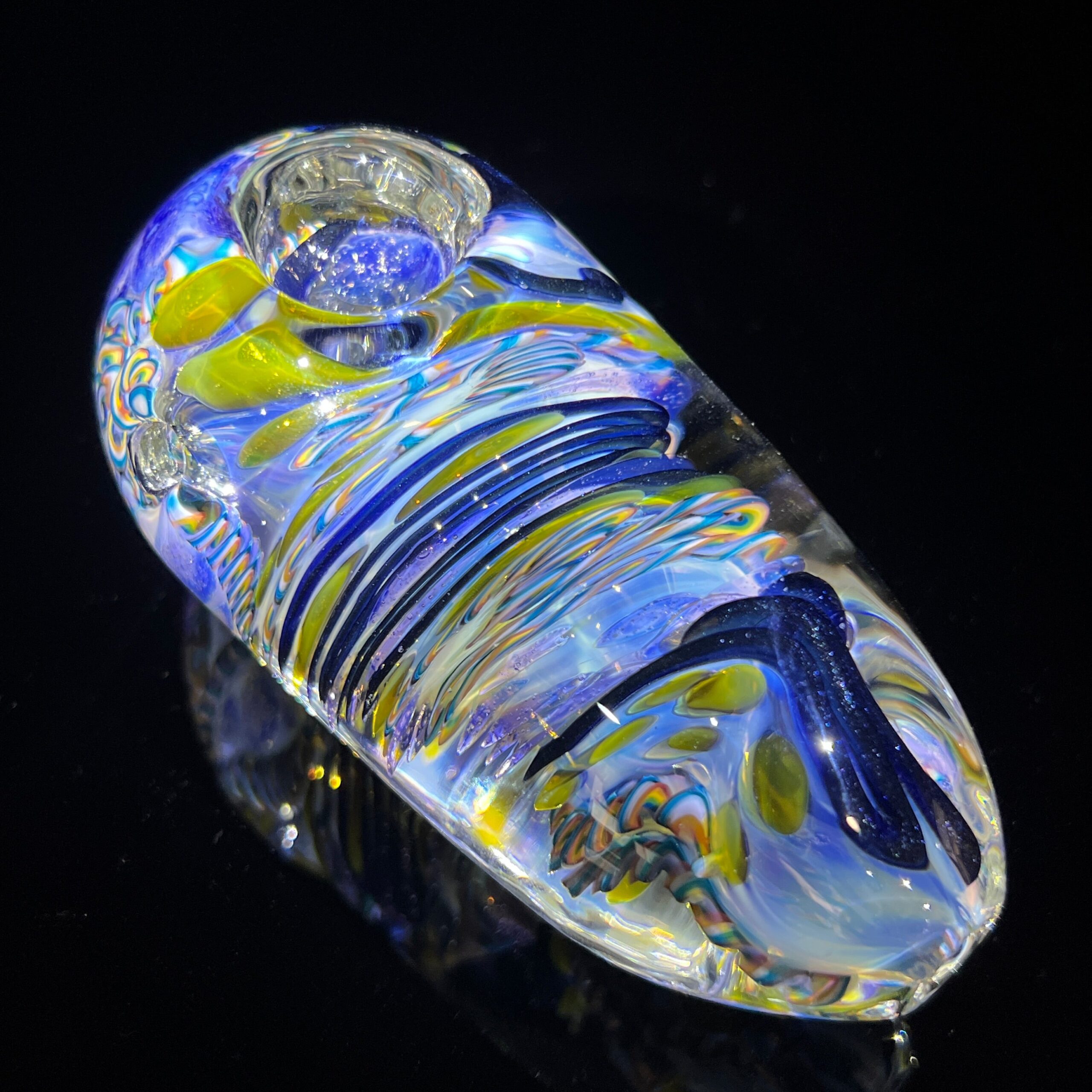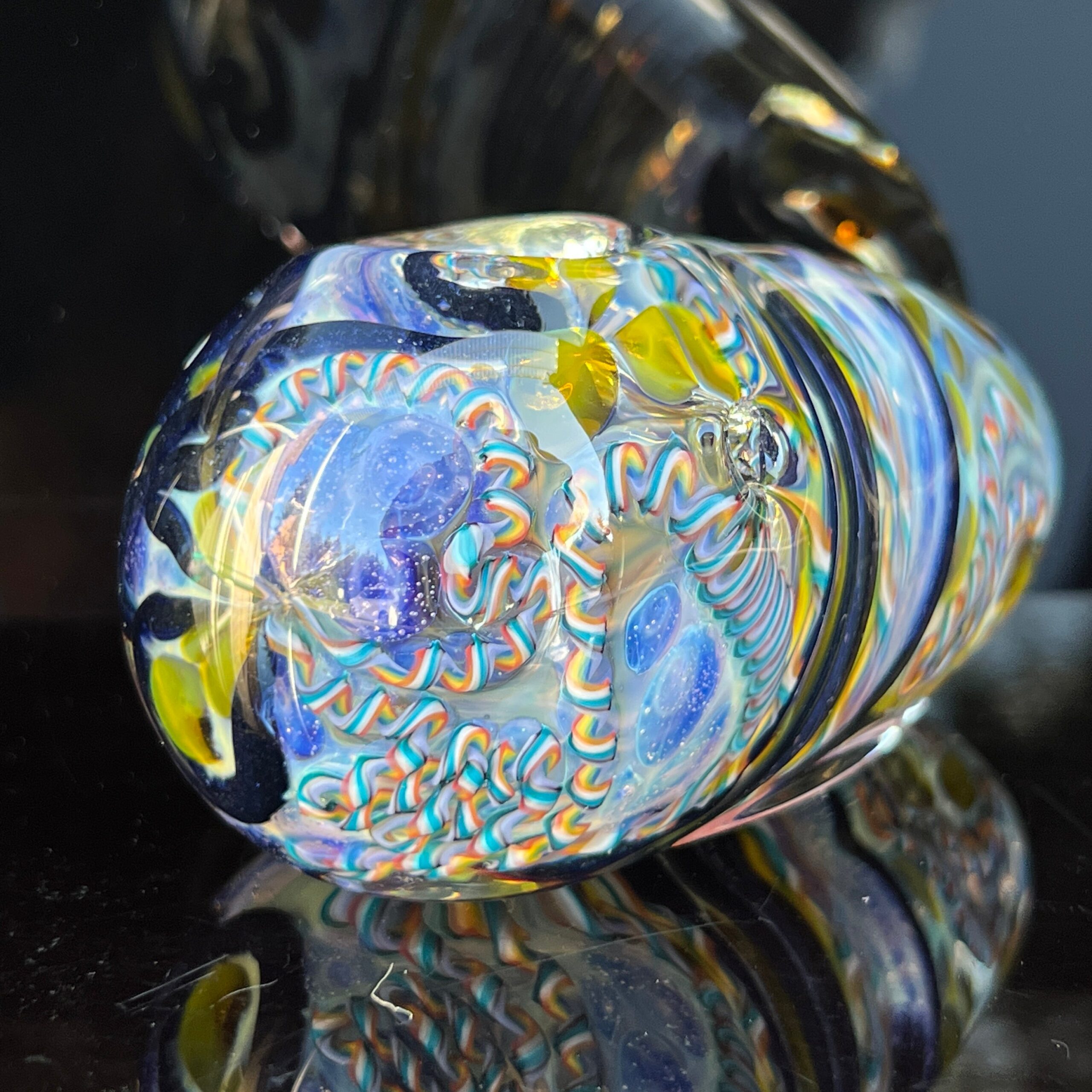 Design: Intricate inside-out cane work/latticinios and stringers, ergonomic egg shape, flat bottom