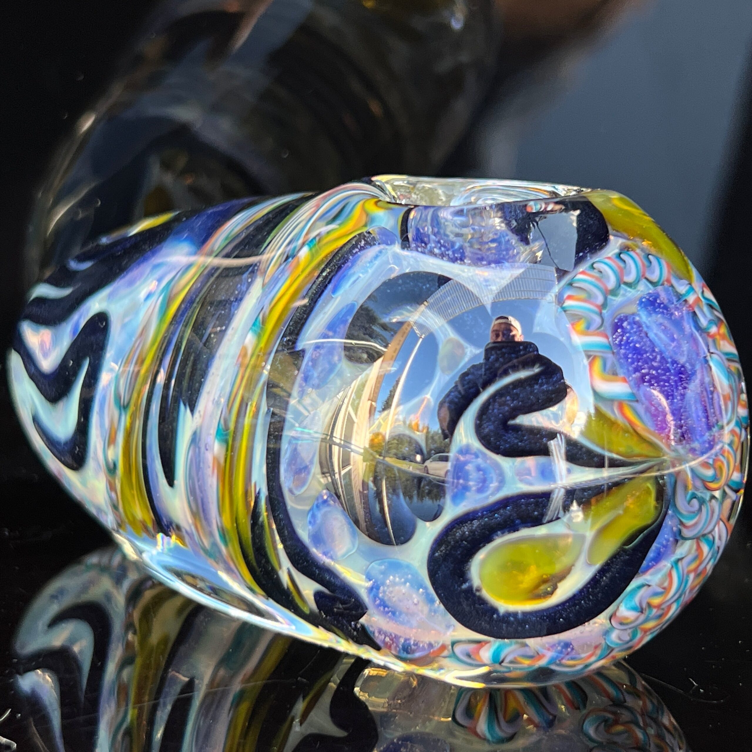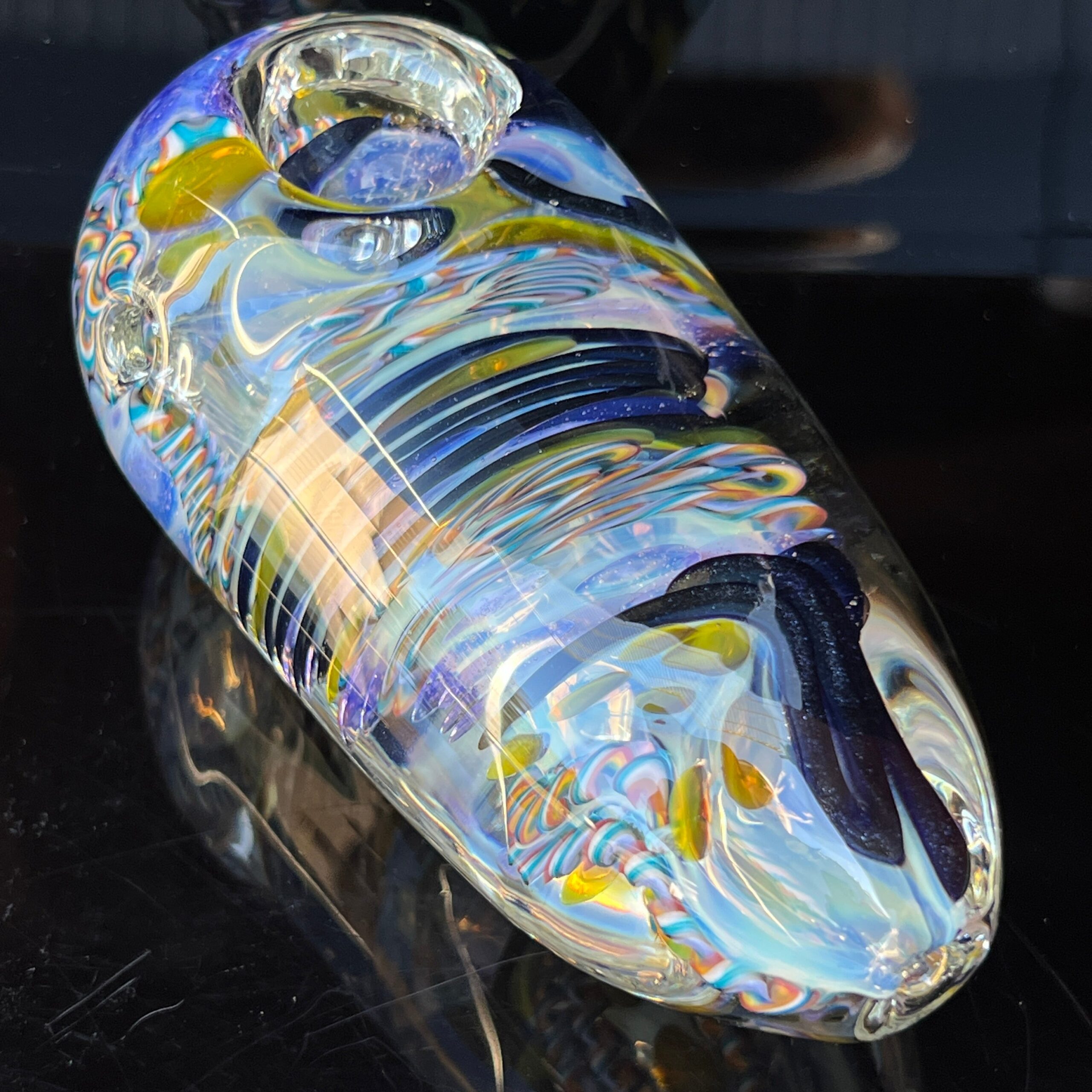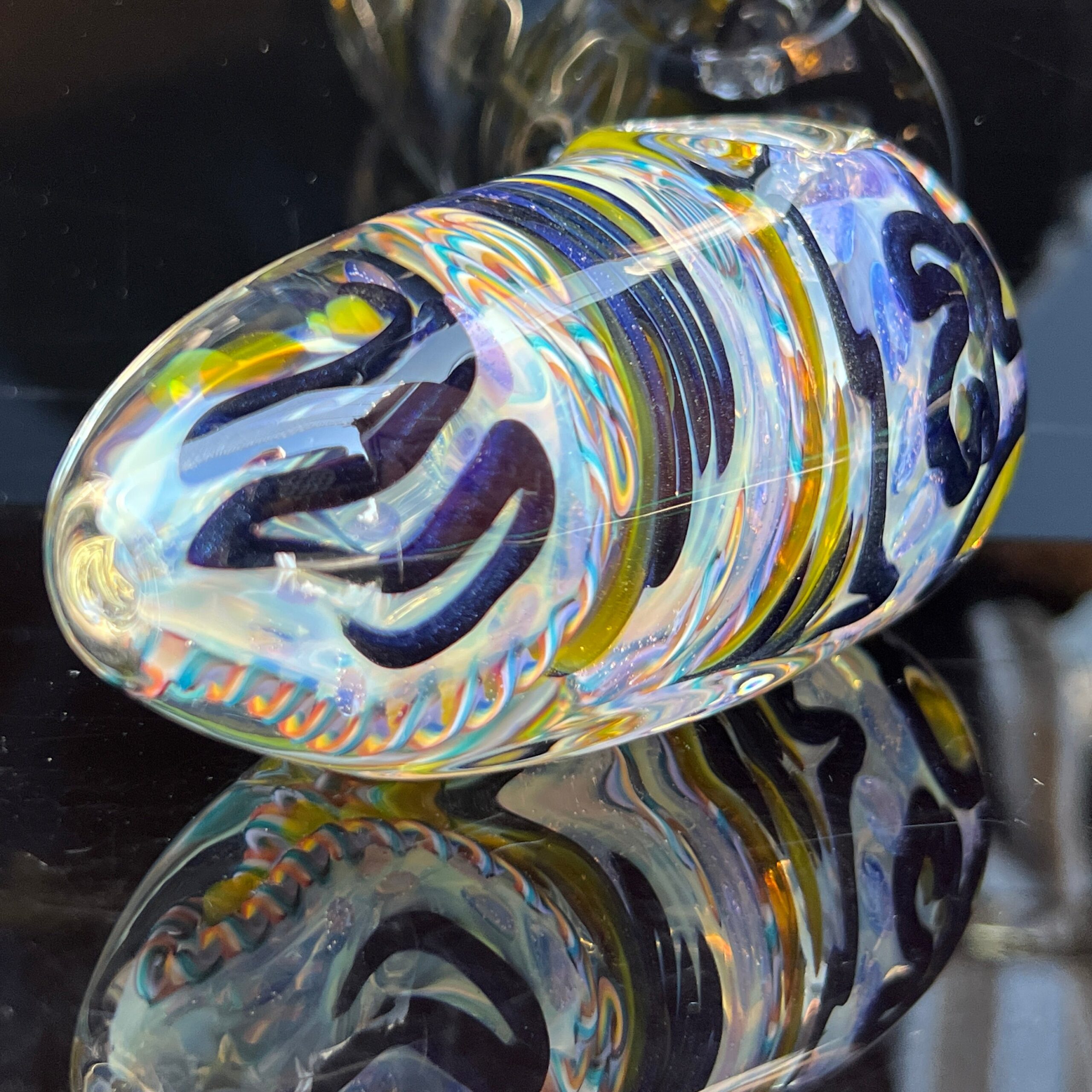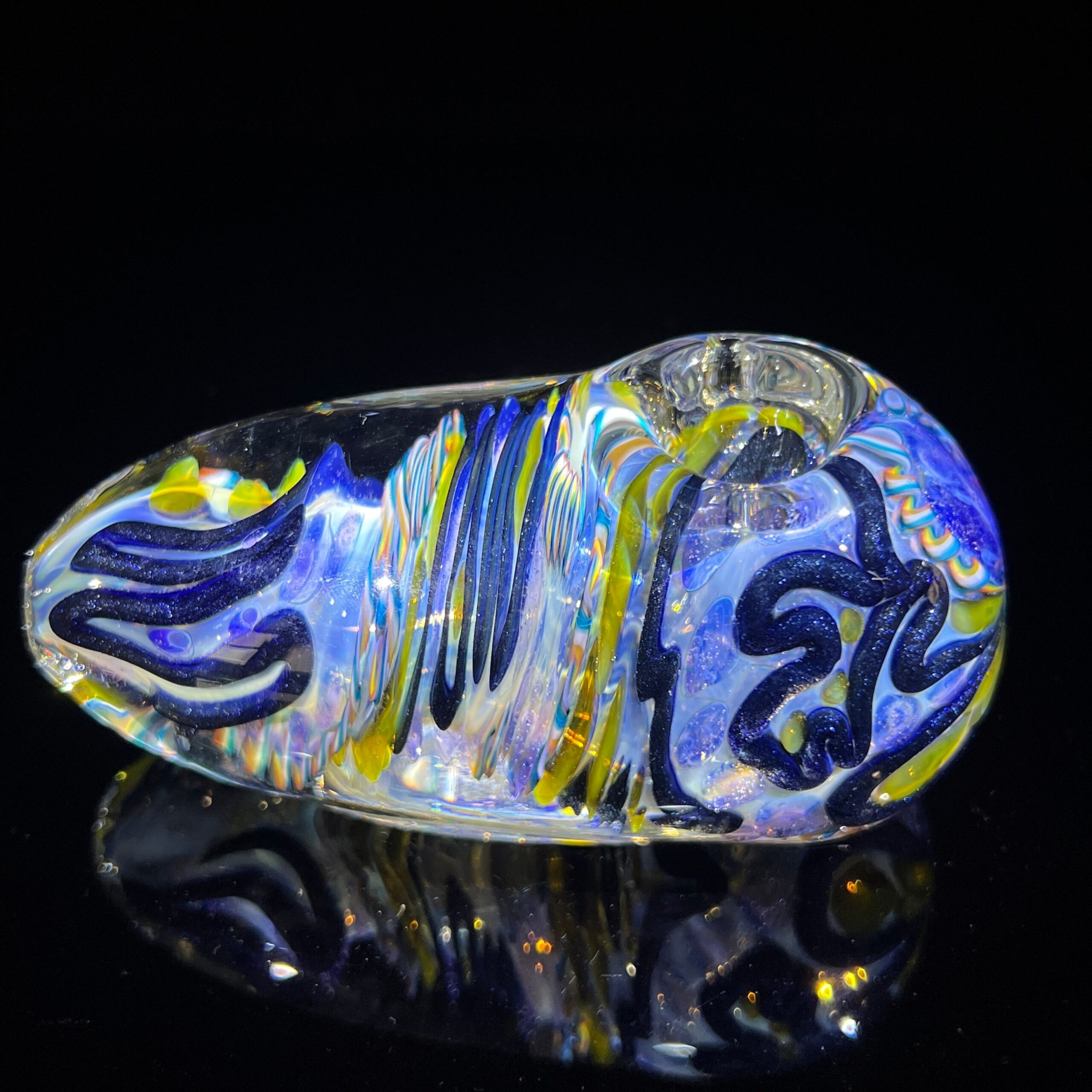 Design: Intricate inside-out cane work/latticinios and stringers, ergonomic egg shape, flat bottom