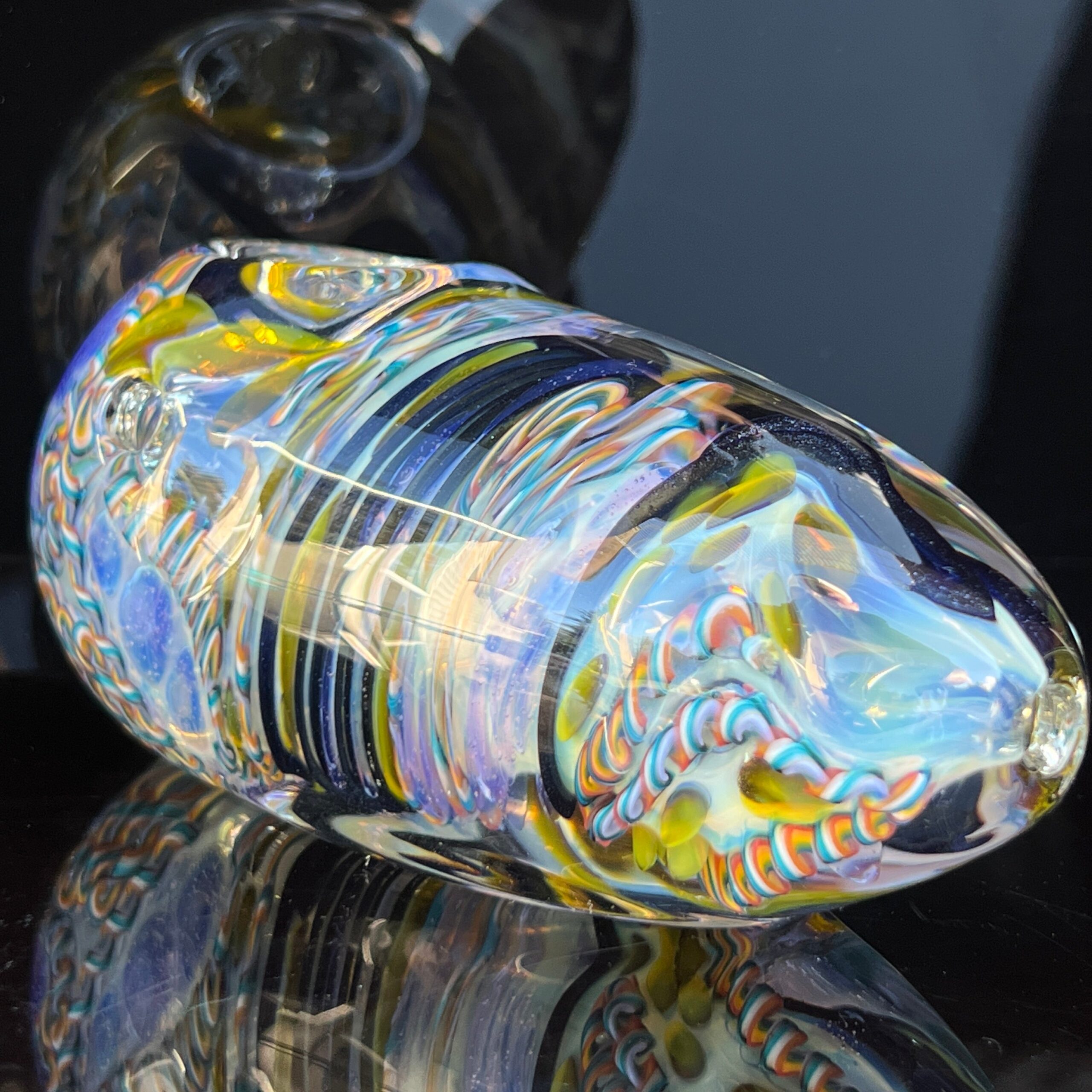 - Inside-Out Cane Work/Latticinios and Stringers: The intricate, swirling patterns of multi-colored cane create a visually stunning piece, showcasing Avant-Garde’s meticulous attention to detail. The vibrant colors are enhanced by the egg’s round shape, offering a captivating visual experience with every use.